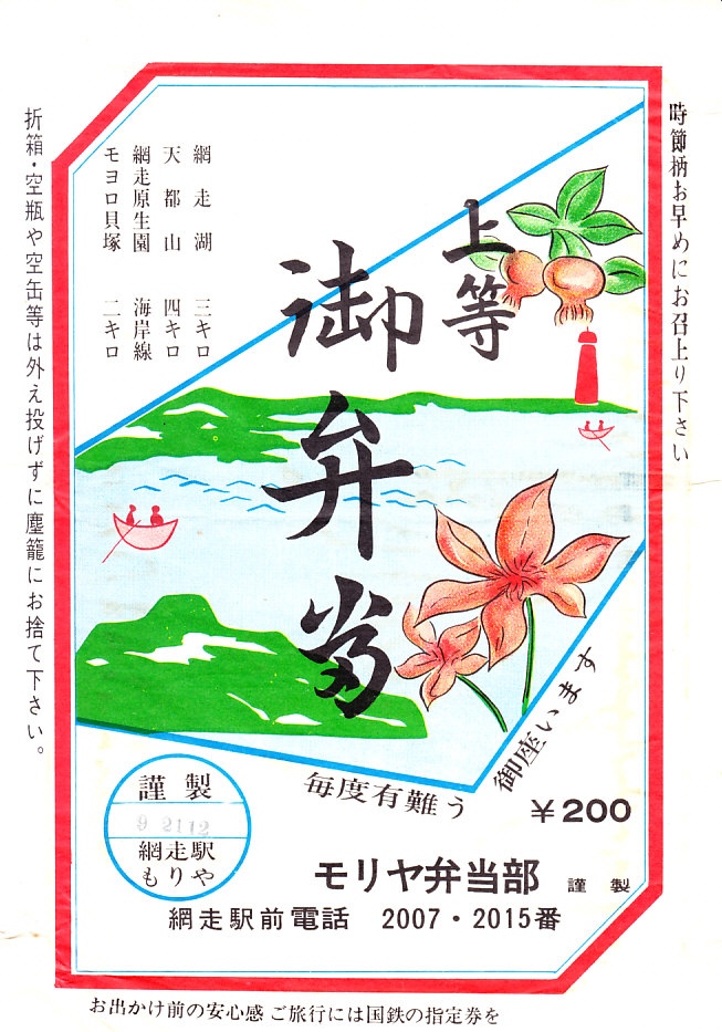 1970年代の、9月21日12時の調製と思われる、昔の網走駅弁の掛紙。名所の名称を網走湖、天都山、網走原生園、モヨロ貝塚と並べ、イラストはそのイメージだろうか。