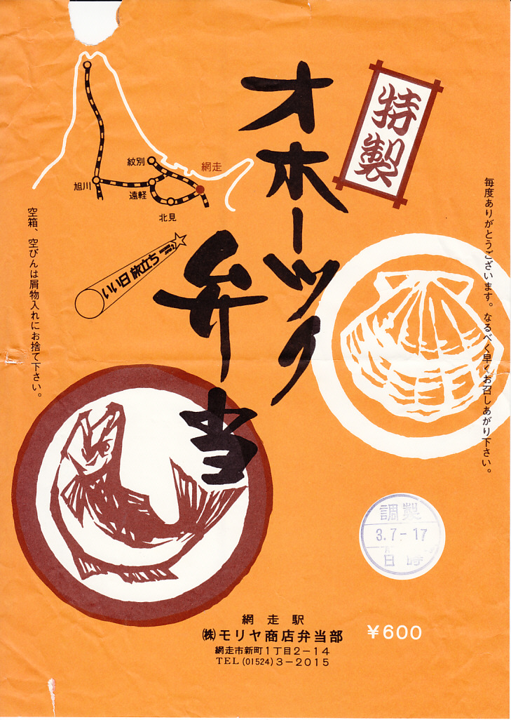 昭和60年頃、1980年代の、3月7日17時の調製と思われる、昔の網走駅弁の掛紙。中身はつまり特製幕の内弁当か。ホタテとサケと、1990(平成2)年までに廃止された名寄本線や湧網線を含む国鉄線の略図を描く。