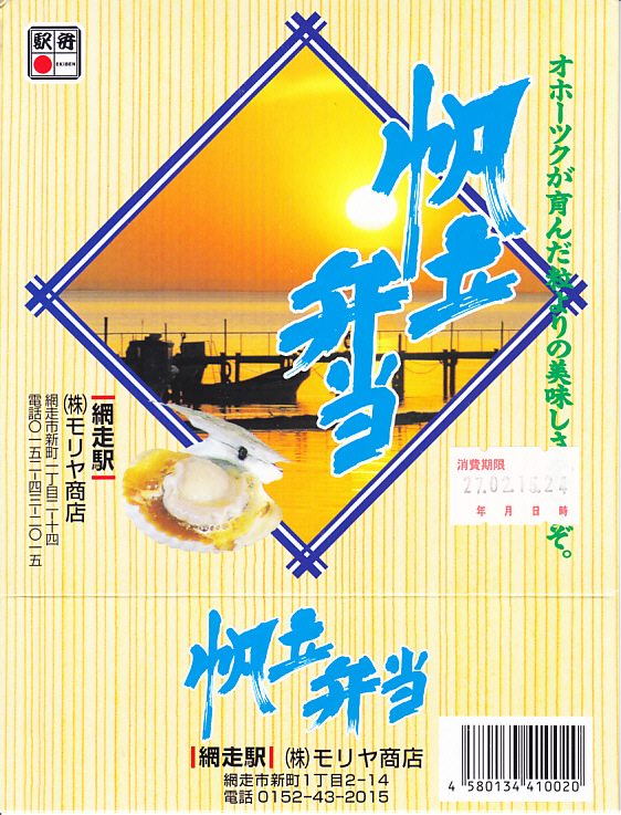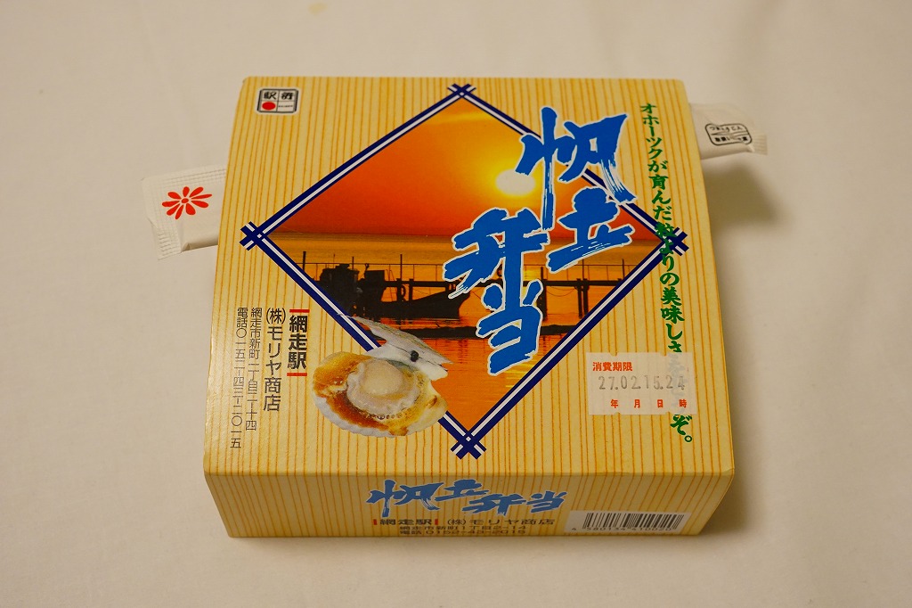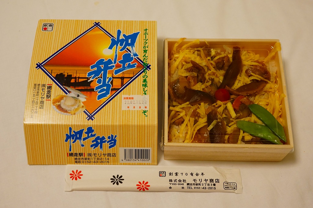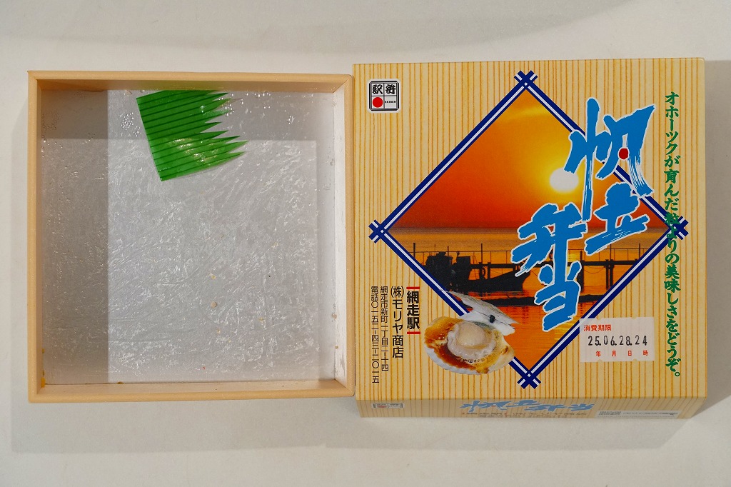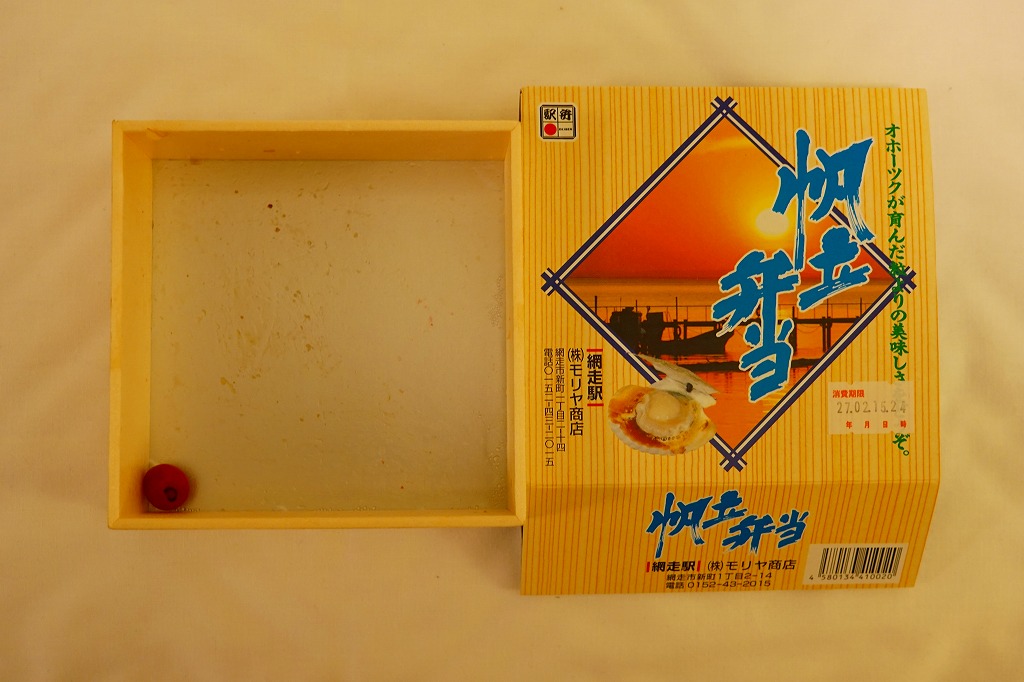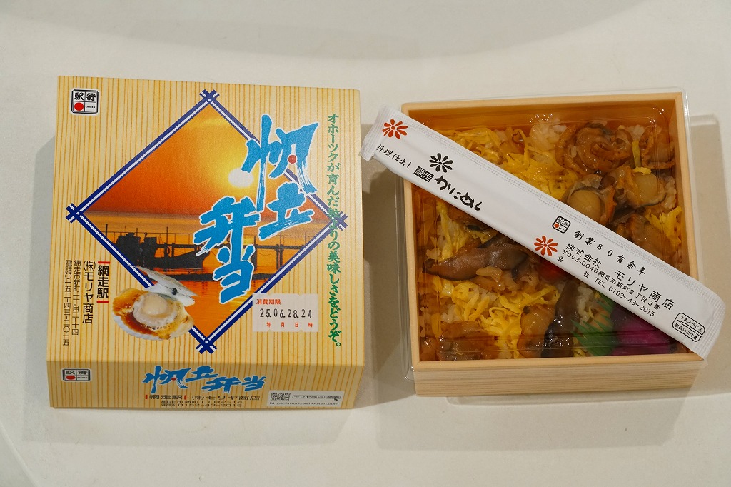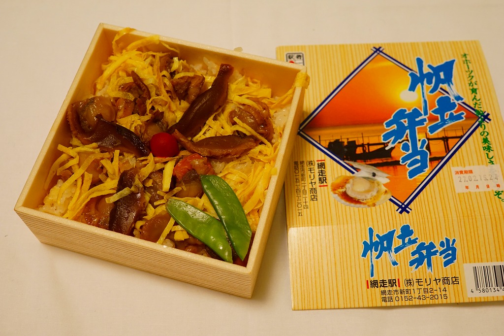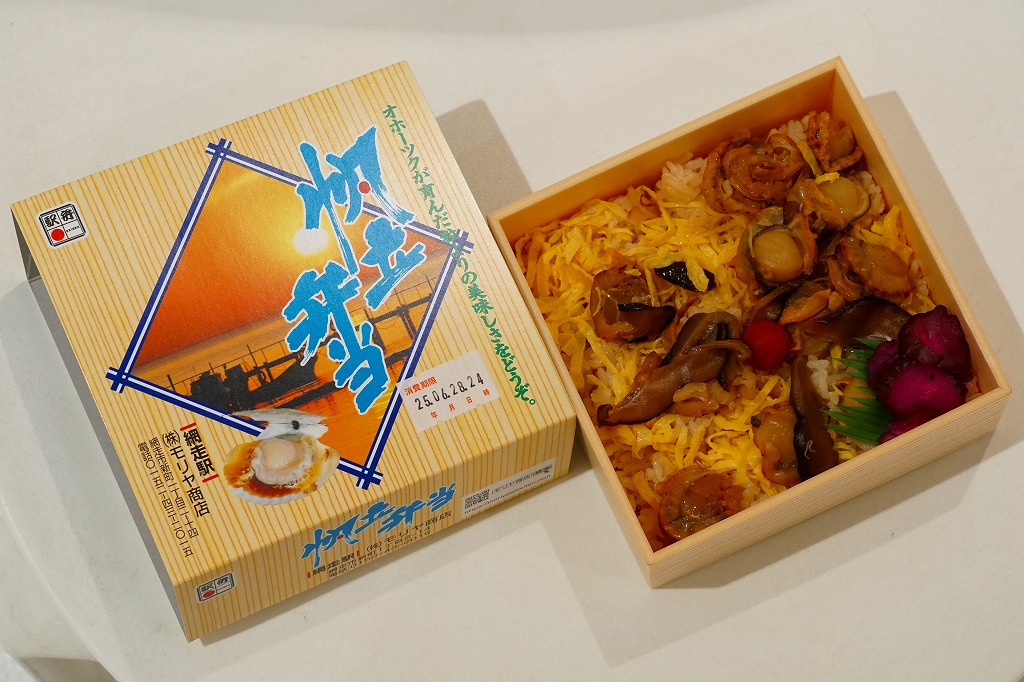 1955(昭和30)年に網走駅で発売。正方形の容器に茶飯を詰め、錦糸卵で覆い、甘辛く煮たベビーホタテを散らし、シイタケ煮も散らし、梅干しを据え、柴漬けを添える。ホタテの滋味と甘辛な味付けで飯が進む、食べておいしいお弁当。価格は2000年代で840円、2014年4月の消費税率改定で900円。