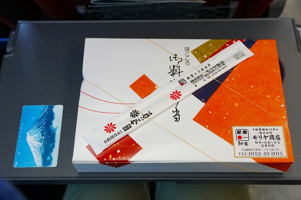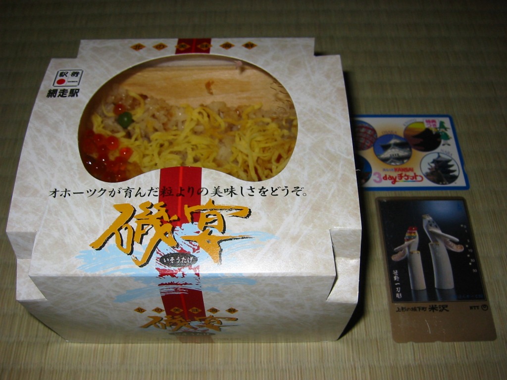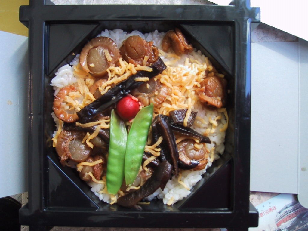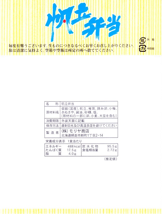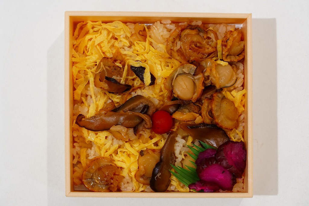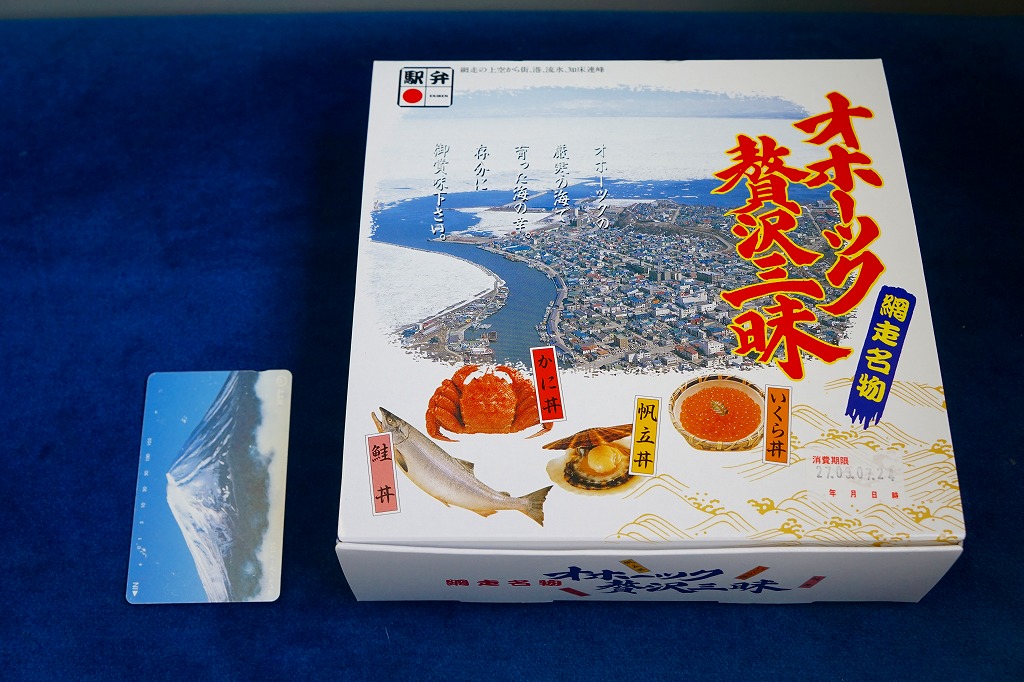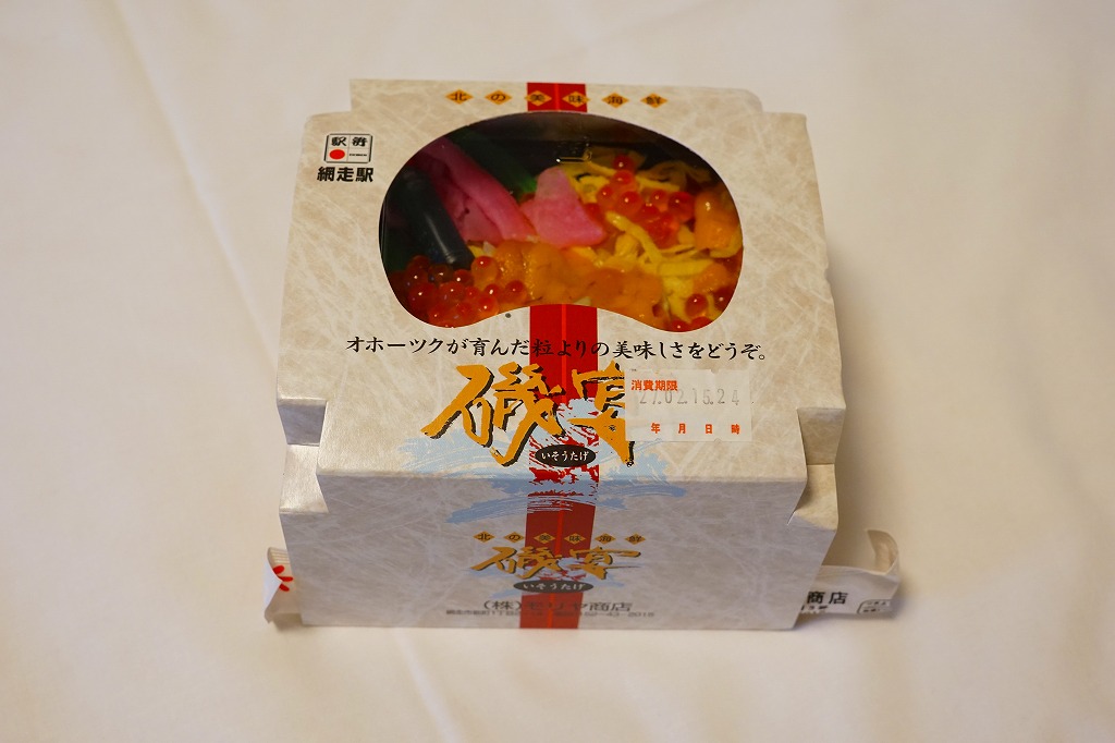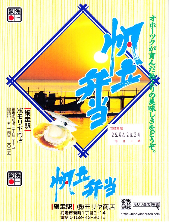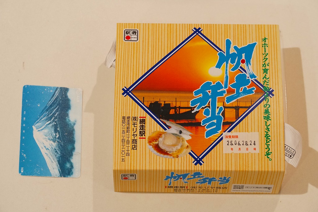 1955(昭和30)年に網走駅で発売。正方形の容器に茶飯を詰め、錦糸卵で覆い、甘辛く煮たベビーホタテを散らし、シイタケ煮も散らし、梅干しを据え、柴漬けを添える。ホタテの滋味と甘辛な味付けで飯が進む、食べておいしいお弁当。価格は2000年代で840円、2014年4月の消費税率改定で900円。