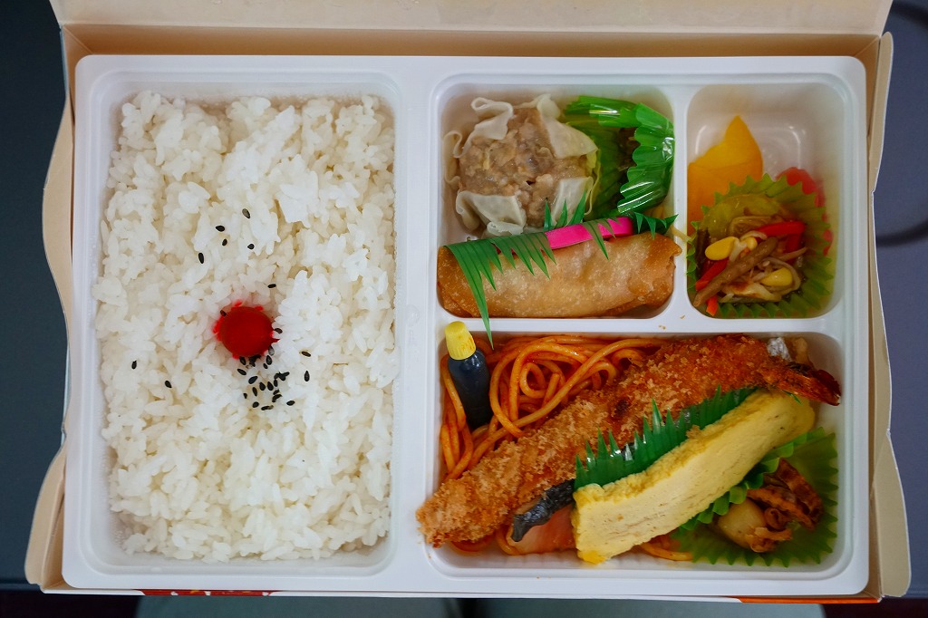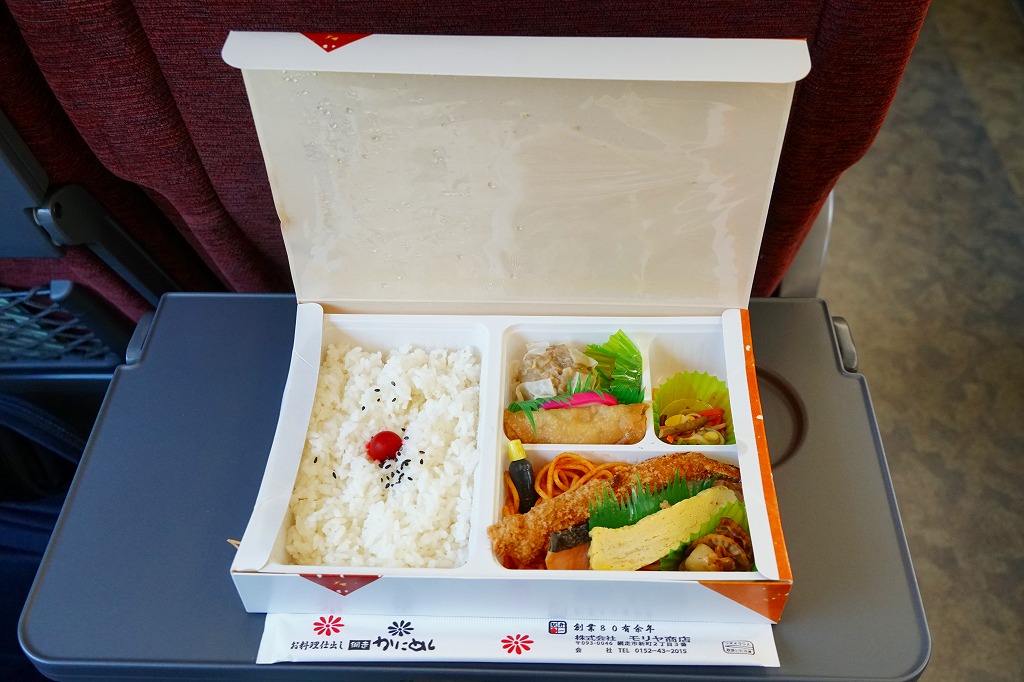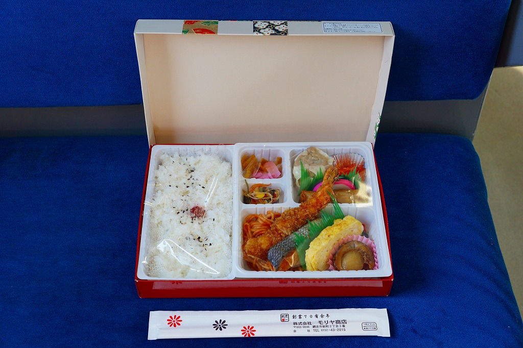 網走駅の幕の内駅弁。駅弁の名前は網走駅でも調製元でも、市販の時刻表の駅弁紹介でも「オホーツク弁当」であるが、現物にその名はどこにもなく、市販の仕出し弁当向け容器がそのまま使われる。中身は日の丸御飯にスパゲティ、エビフライ、焼き鮭、玉子焼き、ホタテ煮、焼売、春巻、うにくらげ、漬物など。ほぼ特徴のないお弁当であり、そんな姿は今の駅弁では希少になってきたと思う。