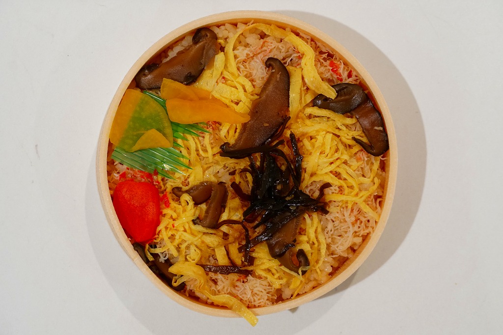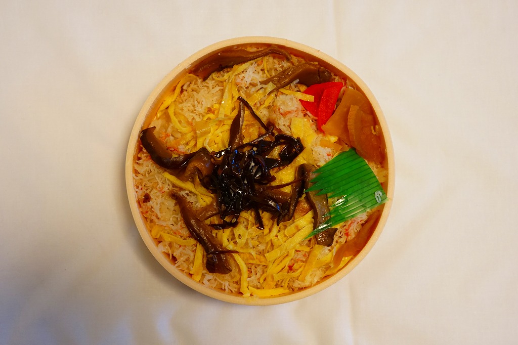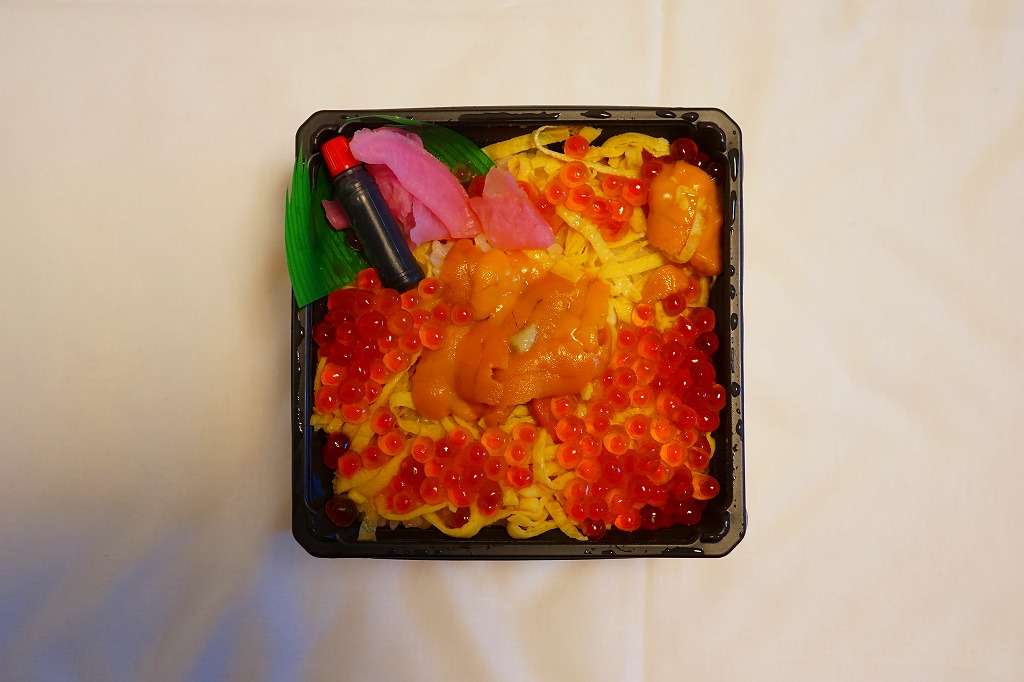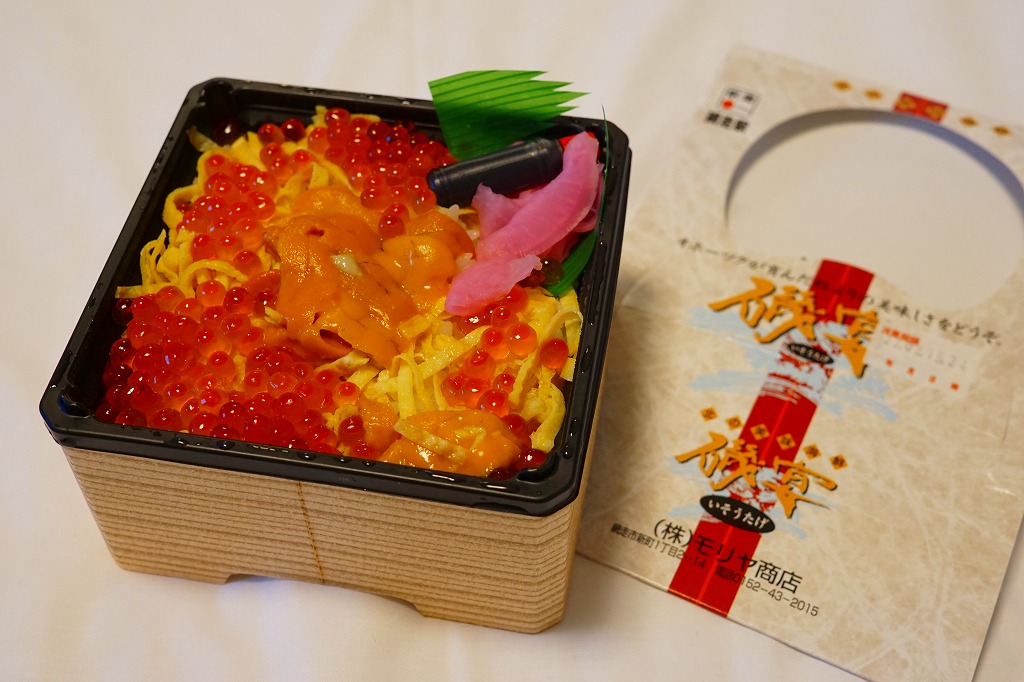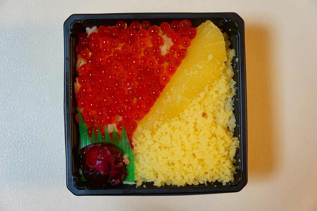 ふたと底を上げた容器を窓開きのスリーブにはめる、見栄え重視の体裁。中身は茶飯の上にウニとイクラと錦糸卵を散らし、大根桜漬を添えて彩ったもの。味は見た目のとおりの輝き。11年前に大都会の駅弁催事でボソボソしたものを食べていたので、現地のものは現地ではおいしく感じた。分量は控えめ。価格は2015年の購入時で1,400円、2020年時点で1,580円。