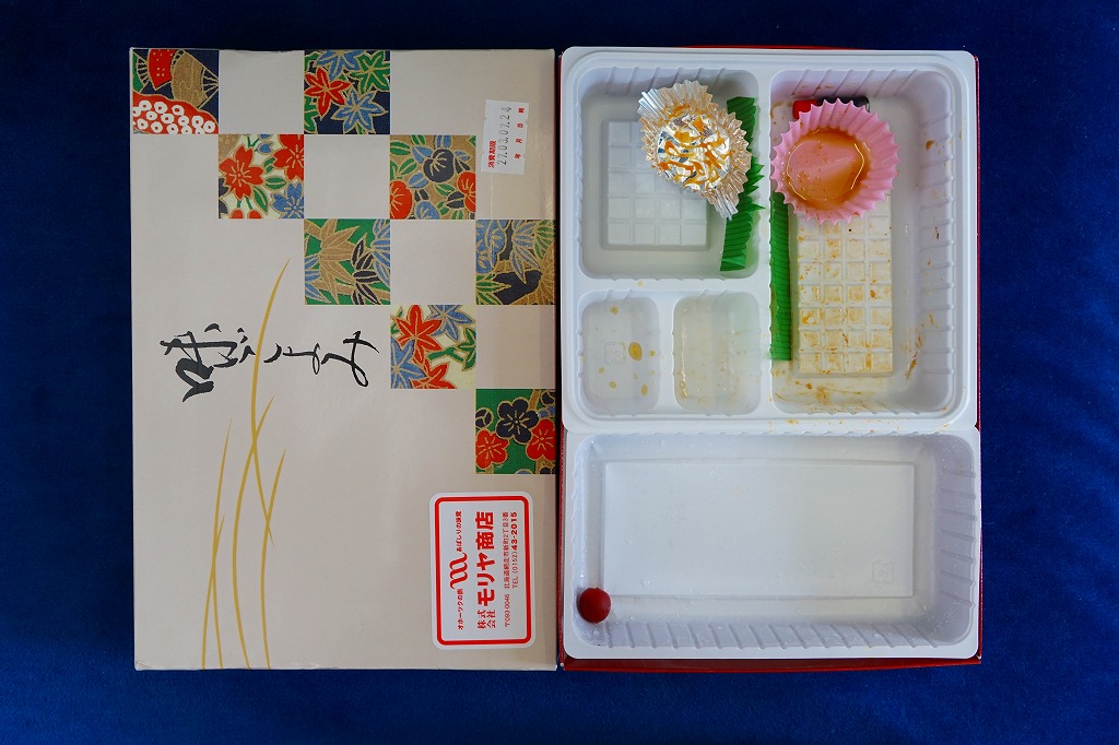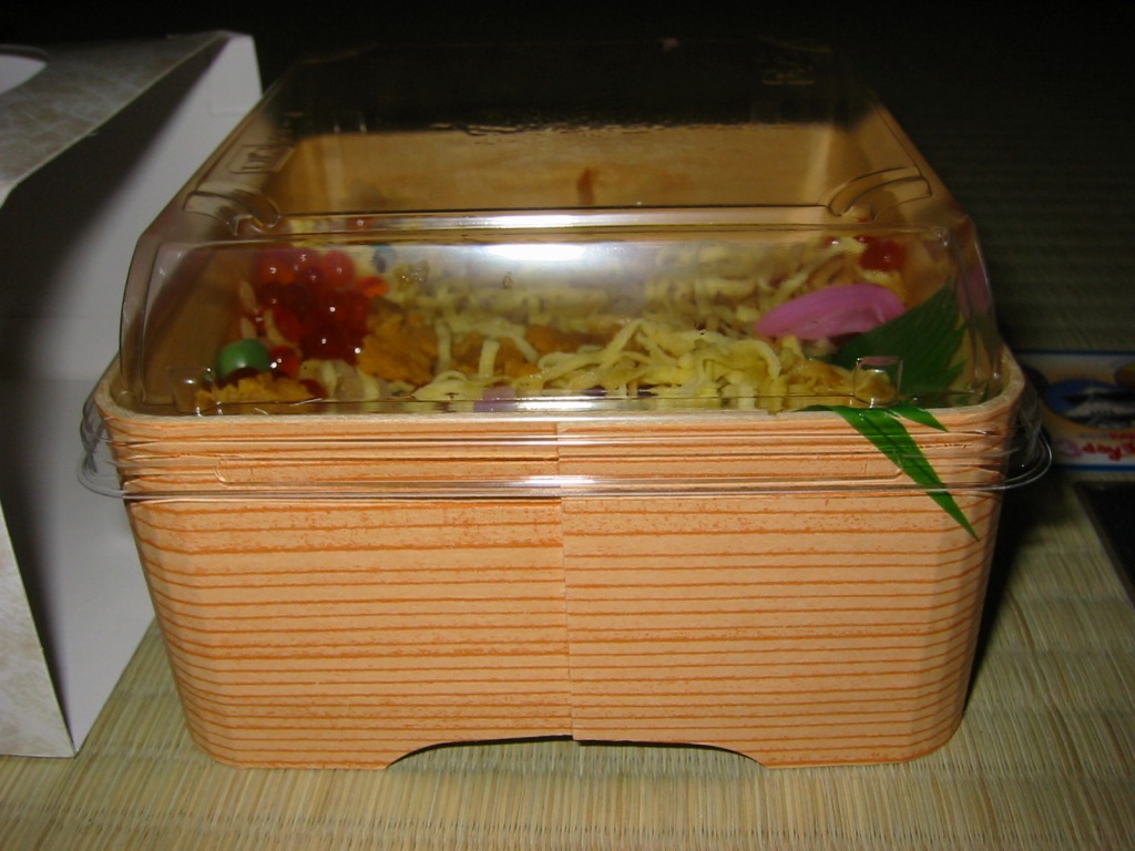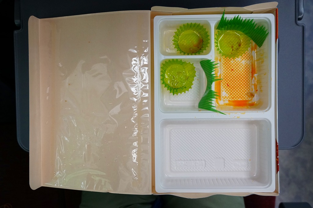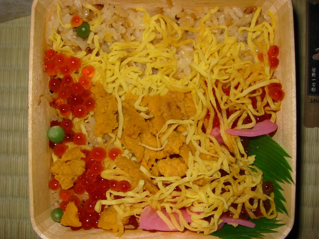 ふたと底を上げた容器を窓開きのスリーブにはめる、見栄え重視の体裁。中身は茶飯の上にウニとイクラと錦糸卵を散らし、大根桜漬を添えて彩ったもの。味は見た目のとおりの輝き。11年前に大都会の駅弁催事でボソボソしたものを食べていたので、現地のものは現地ではおいしく感じた。分量は控えめ。価格は2015年の購入時で1,400円、2020年時点で1,580円。