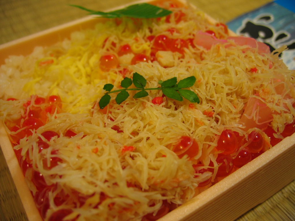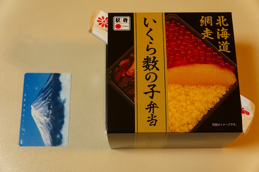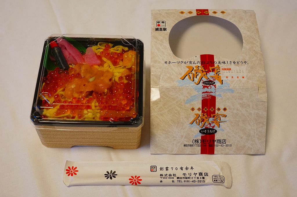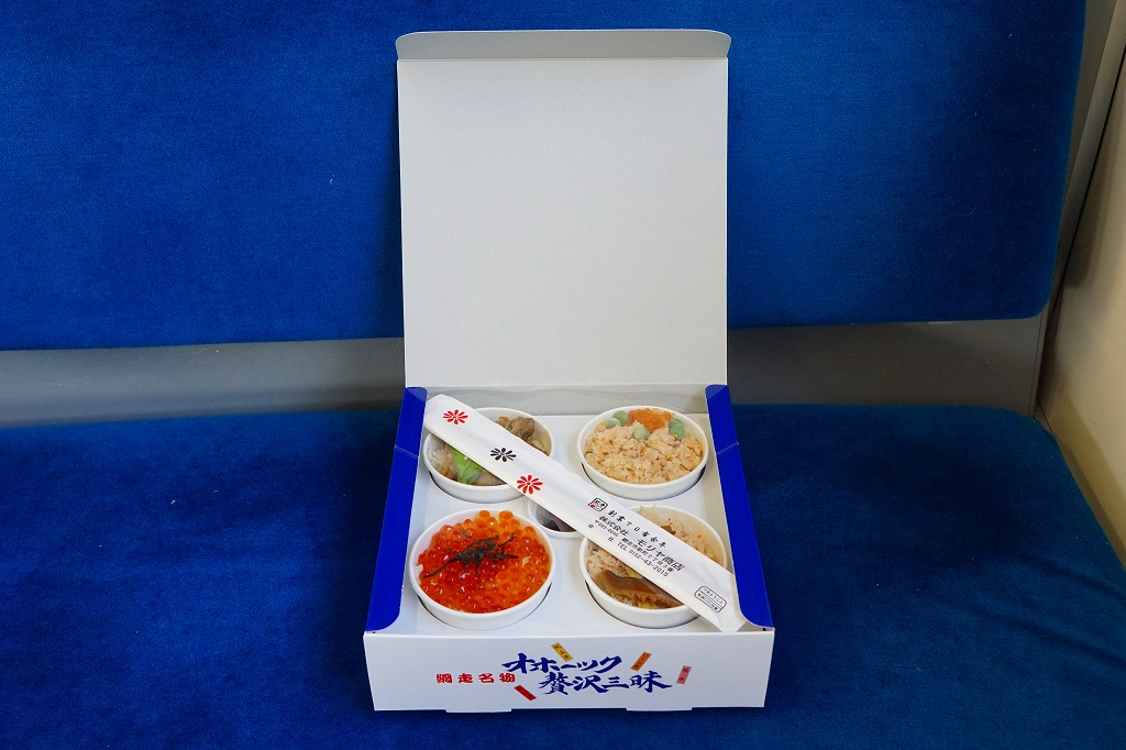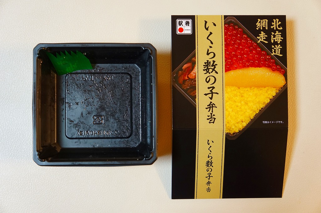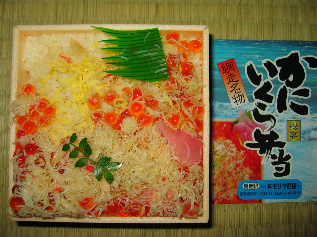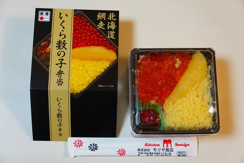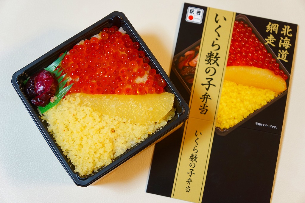 2015(平成27)年の秋に、駅弁催事向け商品として発売か。2017(平成29)年1月の京王百貨店の駅弁大会で実演販売して以降、網走駅でも売り始めた模様。小柄な正方形の容器に醤油飯を詰め、イクラとカズノコと、カズノコのほぐしで覆う。その見た目は、チラシやパッケージの写真と寸分違わない美しさ。カズノコのほぐしは、駅弁以外を含めて初体験。風味はほぐさないほうが良いものの、これで見栄えと個性を備えた感じ。価格は2017年の購入時で980円、2020年時点で1,280円。