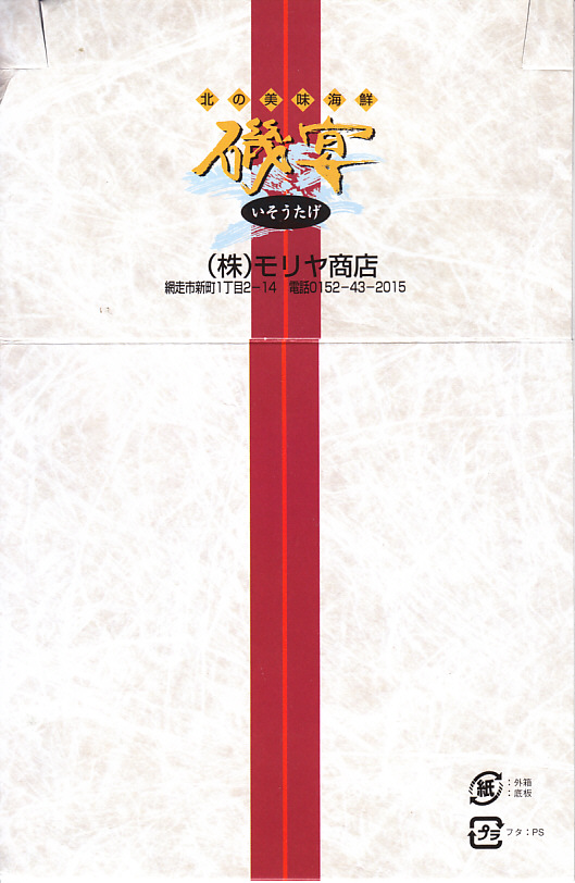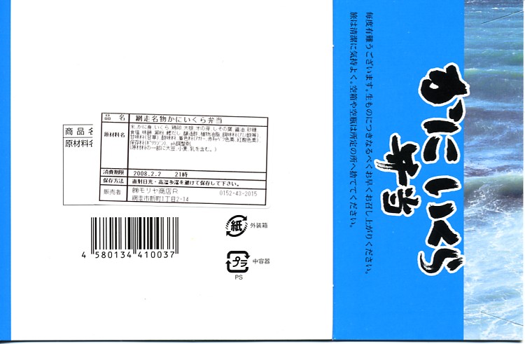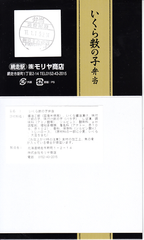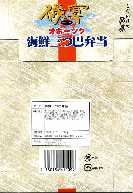 2004(平成16)年1月25日の調製である、網走駅弁のスリーブ。大阪のデパートで実演販売されていたお弁当。見た目や内容は、上の現地での11年後のものと変わらない。2004(平成16)年1月の阪神百貨店の駅弁大会で購入した「ウニ・イクラ」で、他に「タラバ・ホタテ」(1,470円)、「タラバ・ウニ」(1,470円)、「タラバ・イクラ」(1,470円)、「鮭・イクラ」(1,050円)、「カニ・イクラ」(1,130円)の5種が、同じ容器で実演販売されていた。