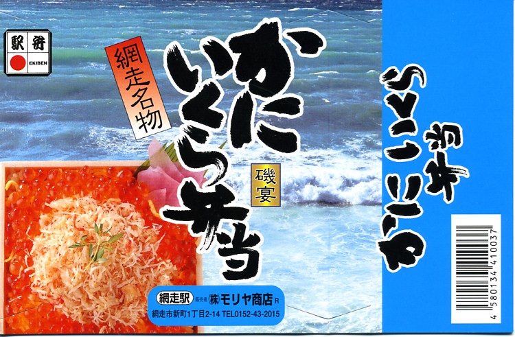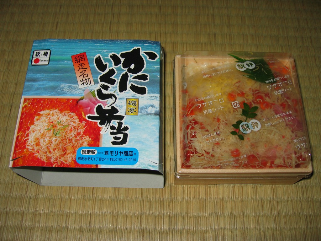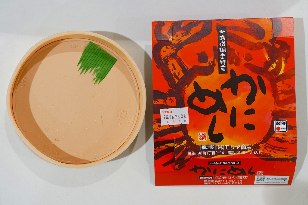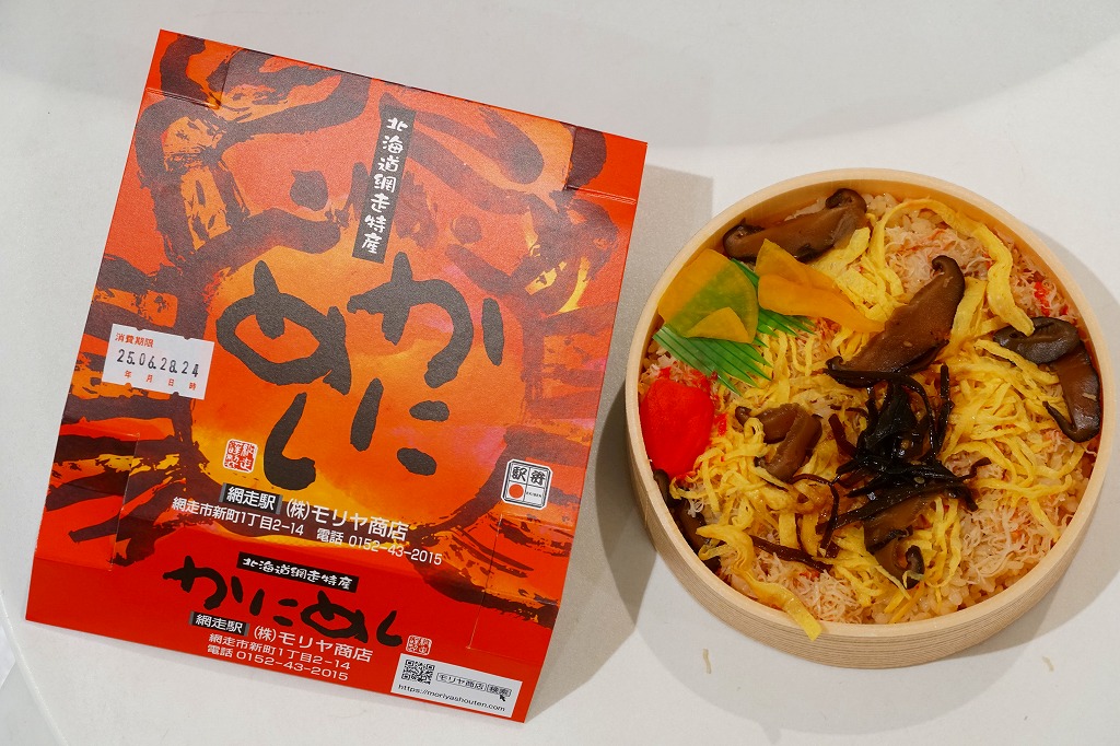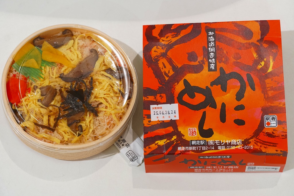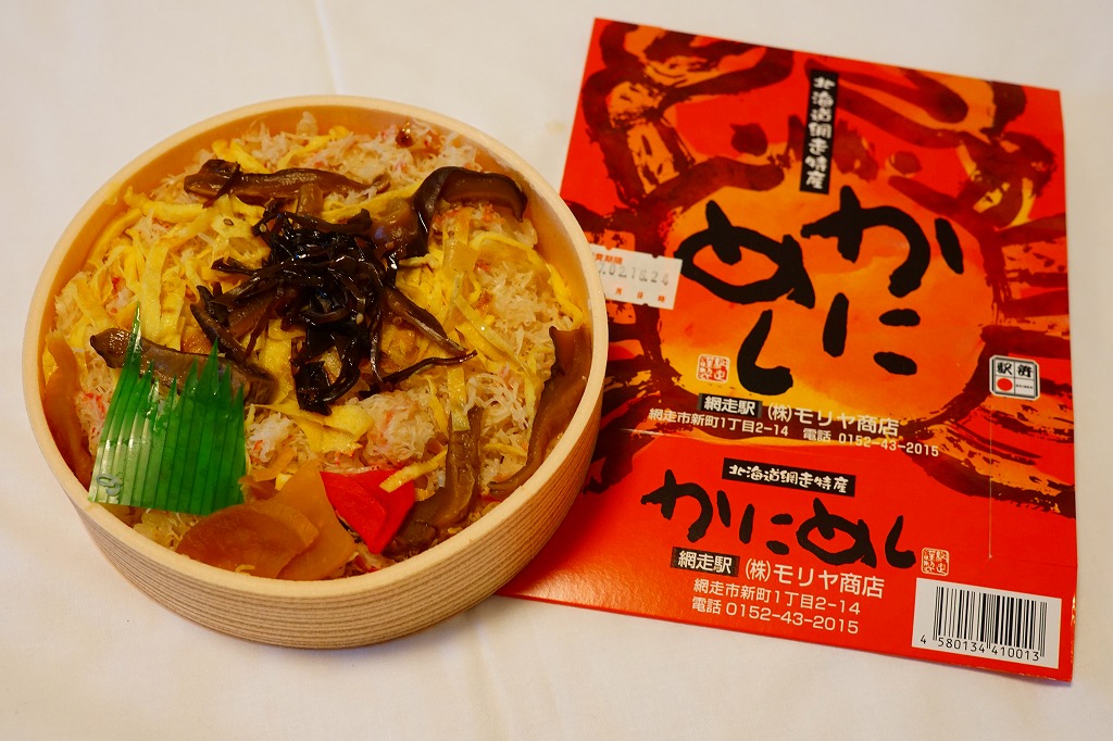 1955(昭和30)年に網走駅で発売した、人気の駅弁。カニでデザインした真っ赤なスリーブに収める真ん丸のプラ容器に、茶飯を詰め、錦糸卵とカニほぐし身で覆い、シイタケと紅生姜と漬物で彩る。見栄えや調味料にあまり頼らない自然なカニの風味を楽しめる。今となっては、特徴のなさが特長のカニ駅弁だとも感じられる。価格は2000年代で840円、2014年時点で900円、2020年時点で990円、2023年時点で1,100円、2025年時点で1,200円。
