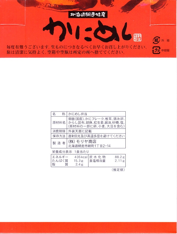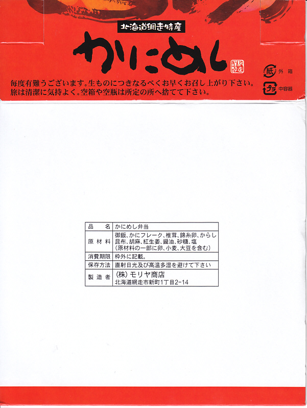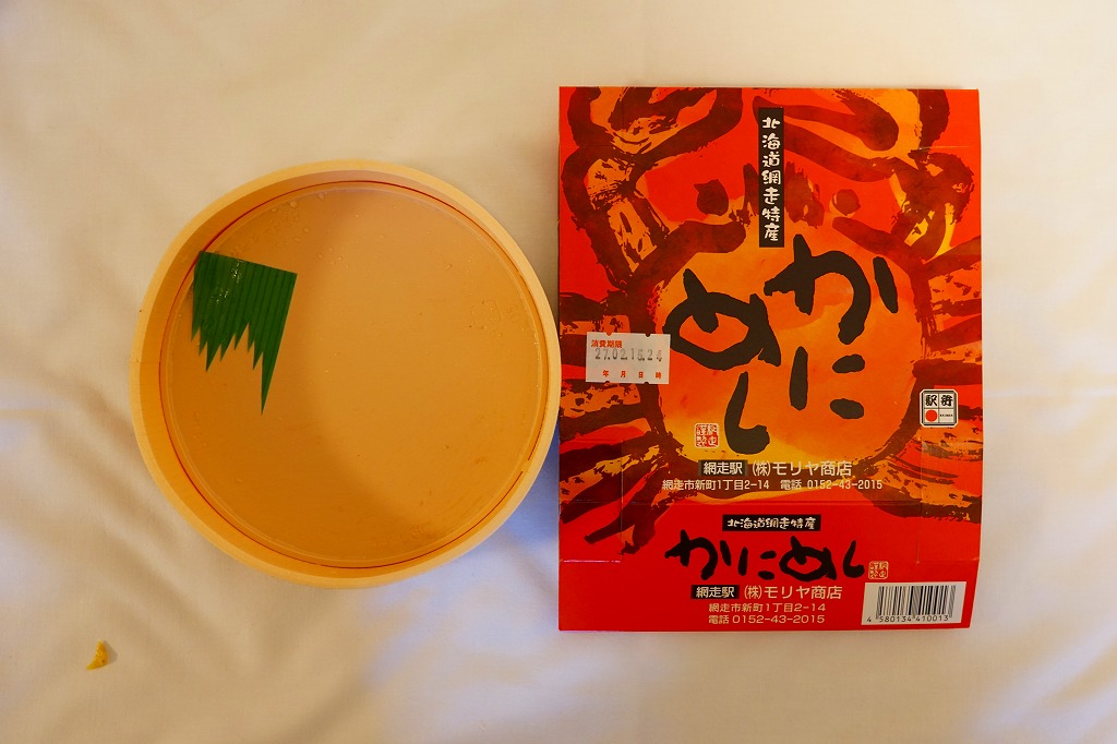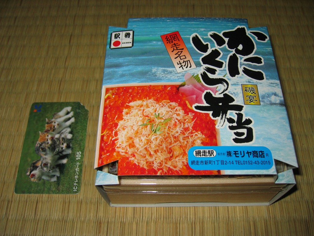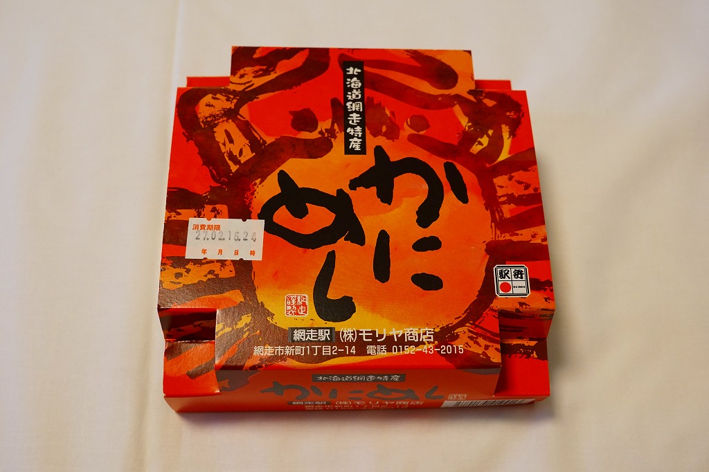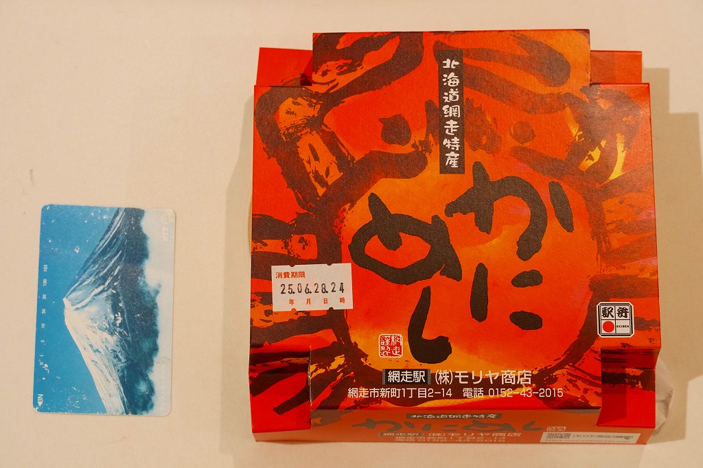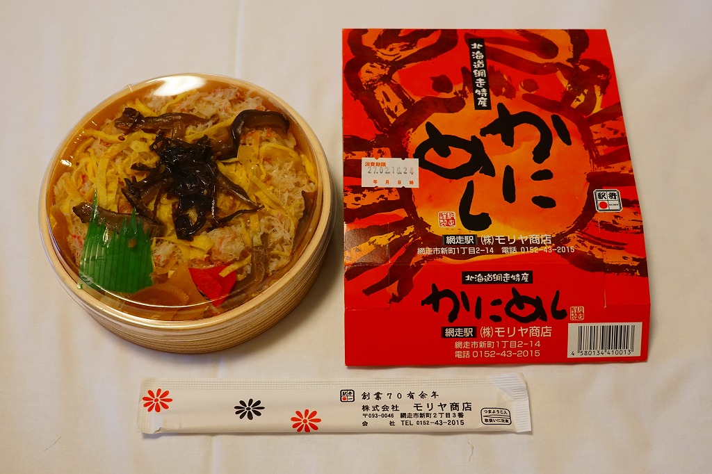 1955(昭和30)年に網走駅で発売した、人気の駅弁。カニでデザインした真っ赤なスリーブに収める真ん丸のプラ容器に、茶飯を詰め、錦糸卵とカニほぐし身で覆い、シイタケと紅生姜と漬物で彩る。見栄えや調味料にあまり頼らない自然なカニの風味を楽しめる。今となっては、特徴のなさが特長のカニ駅弁だとも感じられる。価格は2000年代で840円、2014年時点で900円、2020年時点で990円、2023年時点で1,100円、2025年時点で1,200円。