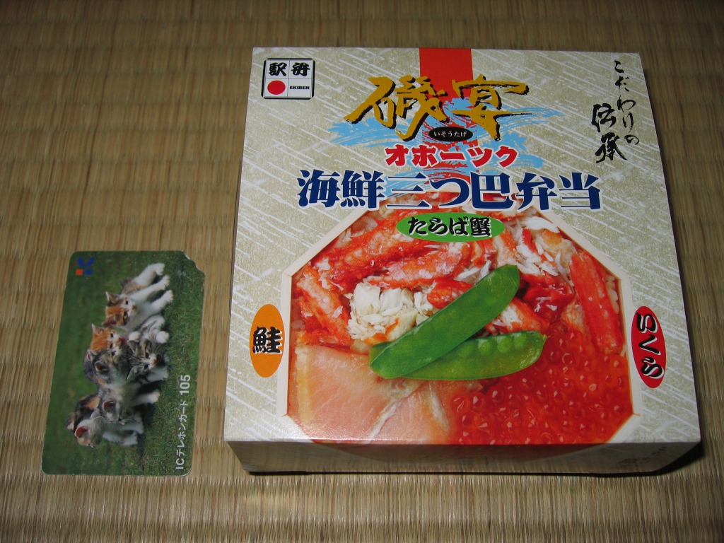 2000(平成12)年10月に発売。上げ底の容器に透明な上げぶたをする催事受けしそうな容器を、海と中身の写真を載せたボール紙の枠にはめる。中身は白御飯の上にカニとイクラと錦糸卵を載せるもの。写真と違い中身の具がシェイクされているが、見栄え良く分かれているより食べてうまいと思う。小柄だけど満足感は出る。ただ、現地に実態があるかは分からない。パッケージにはしっかりと、現地で買えた駅弁にはなかった製造委託の記号が付いていた。価格は2008年の購入時で1,050円。後に他の磯宴シリーズと同じような姿に変わり、2020年時点で1,480円、2023年時点で1,580円、2025年時点で1,680円。