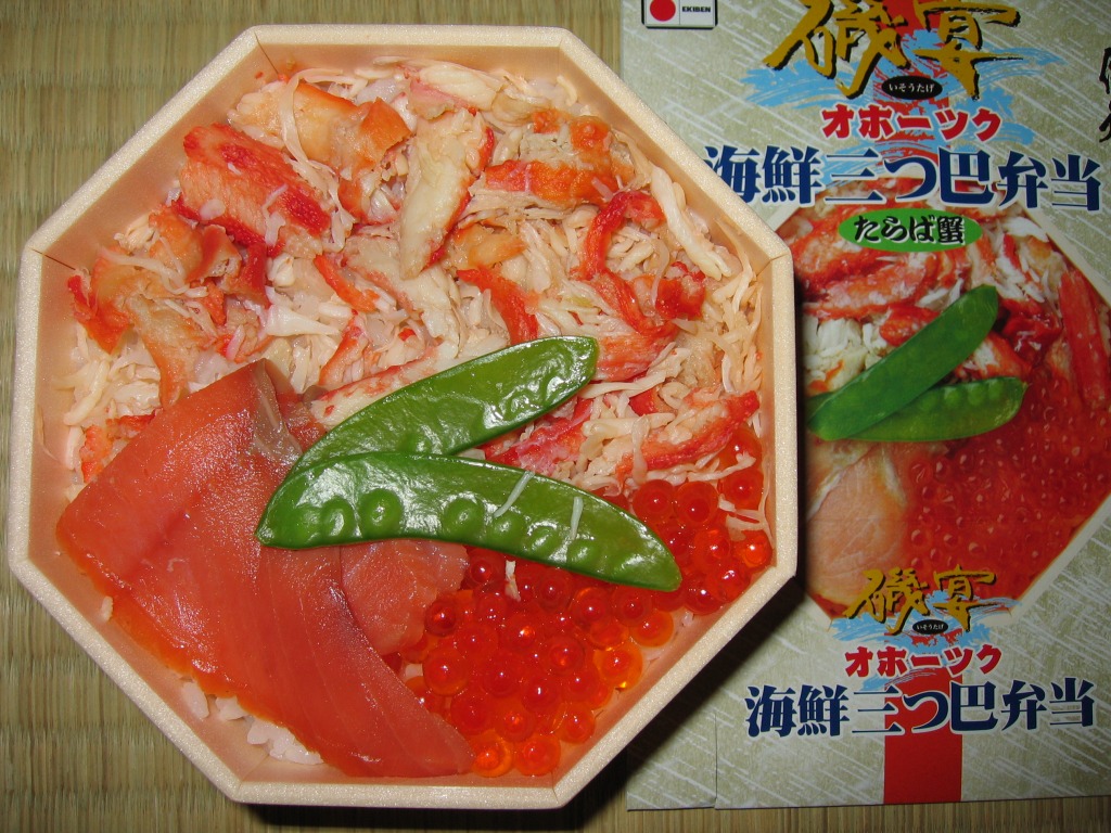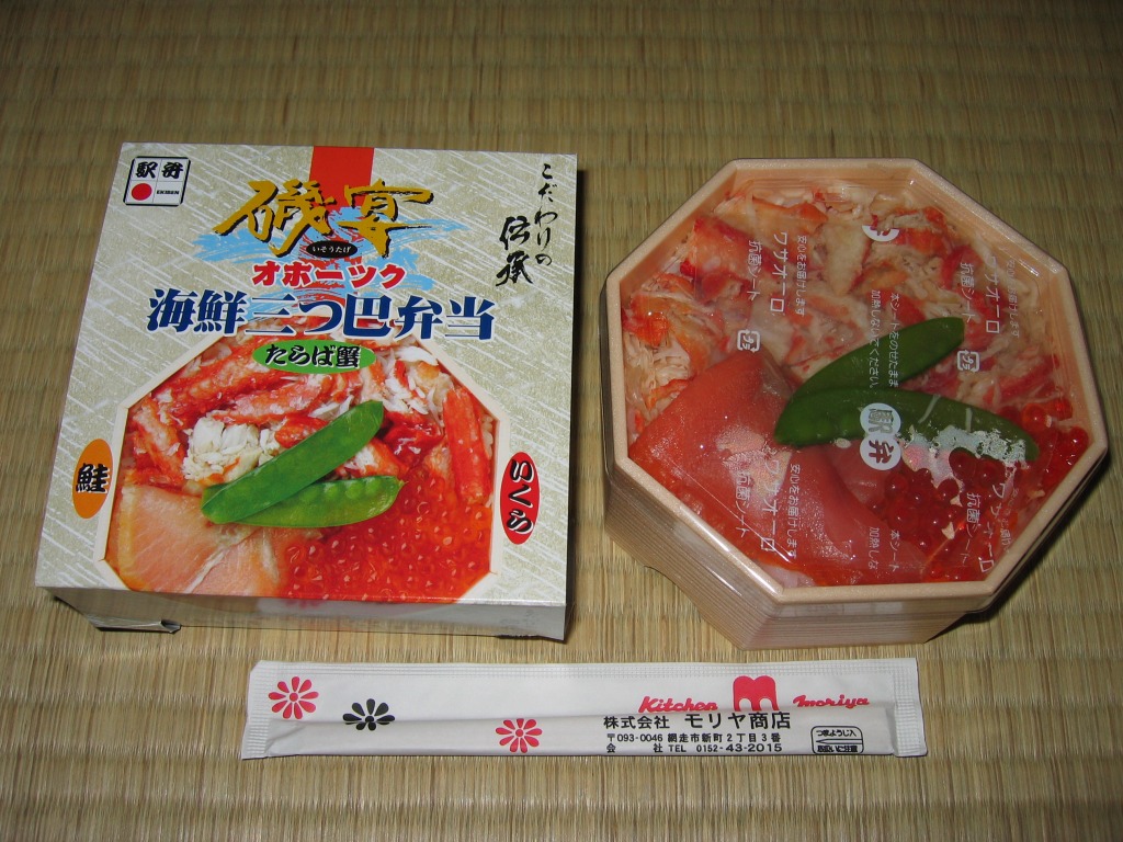2006(平成18)年の秋に、催事業者がプロデュースする催事向け駅弁シリーズ「駅弁の達人」のひとつとして、現地と催事場で発売か。正八角形の発泡材製容器に透明なふたをして、中身の写真を載せたボール紙の枠にはめる。中身は茶飯の上にタラバ、いくら、サーモンの3種を載せて、きぬさやを添えるもの。具が3種だから三つ巴。こういう内容は道内ではどうしても属地不詳となるが、きぬさやの添付と、軽く焼いたぶつ切りタラバの風味が個性を出す。現存しない模様。