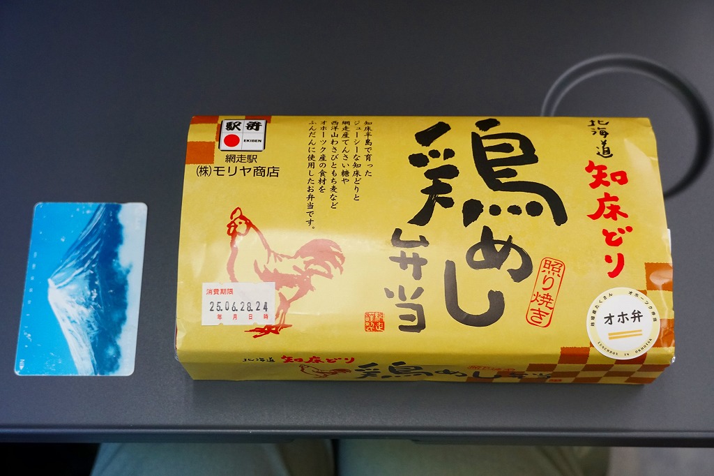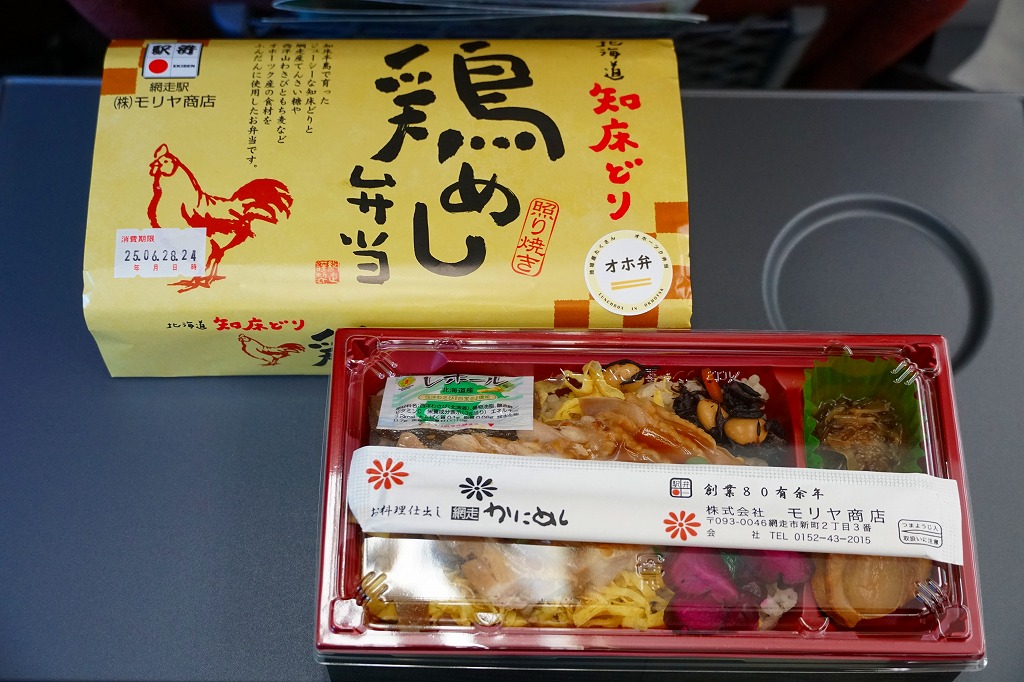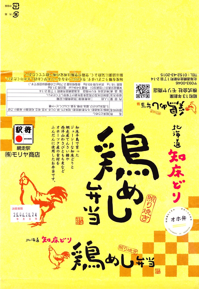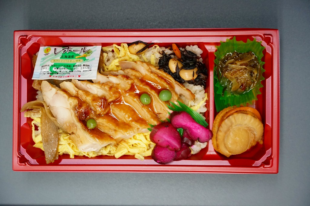 長方形のプラ容器に、もち麦を混ぜた白飯を敷き、錦糸卵で覆い、ビート糖を使用した特製醤油ダレに漬け込んだという北海道知床どりの照り焼きを並べ、タレとグリーンピースをかけ、ひじき煮、ごぼう煮、西洋わさび袋、ホタテ、松前漬け、柴漬けを添える。見た目や味では、各地にありそうな鶏飯駅弁。オホ弁の定義「オホーツクブランド認証商品を1品以上使用すること。」「その他の食材も、オホーツク産または道内産を中心に使用することが望ましい。」「日常利用のお弁当から、特別な日や観光客向けのお弁当までをターゲットとしても構わない。」に合致するのは、鶏肉でもタレでも麦や米でもなく「北海道丸大豆醸造しょうゆ」なのだそうな。