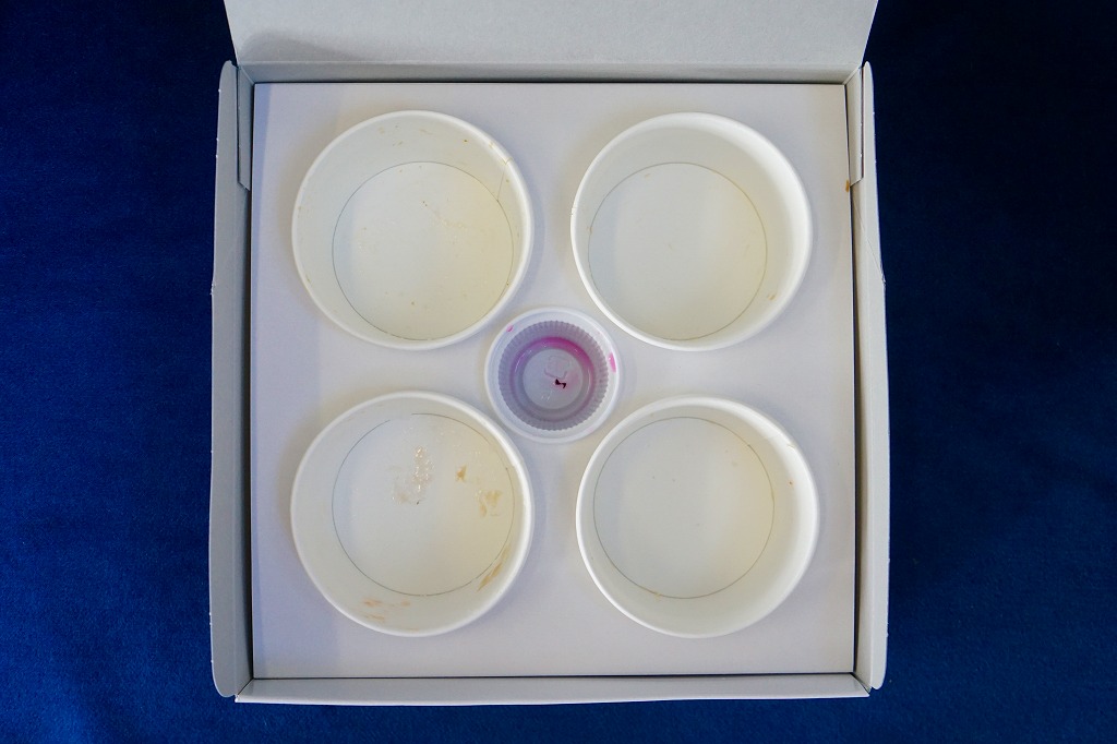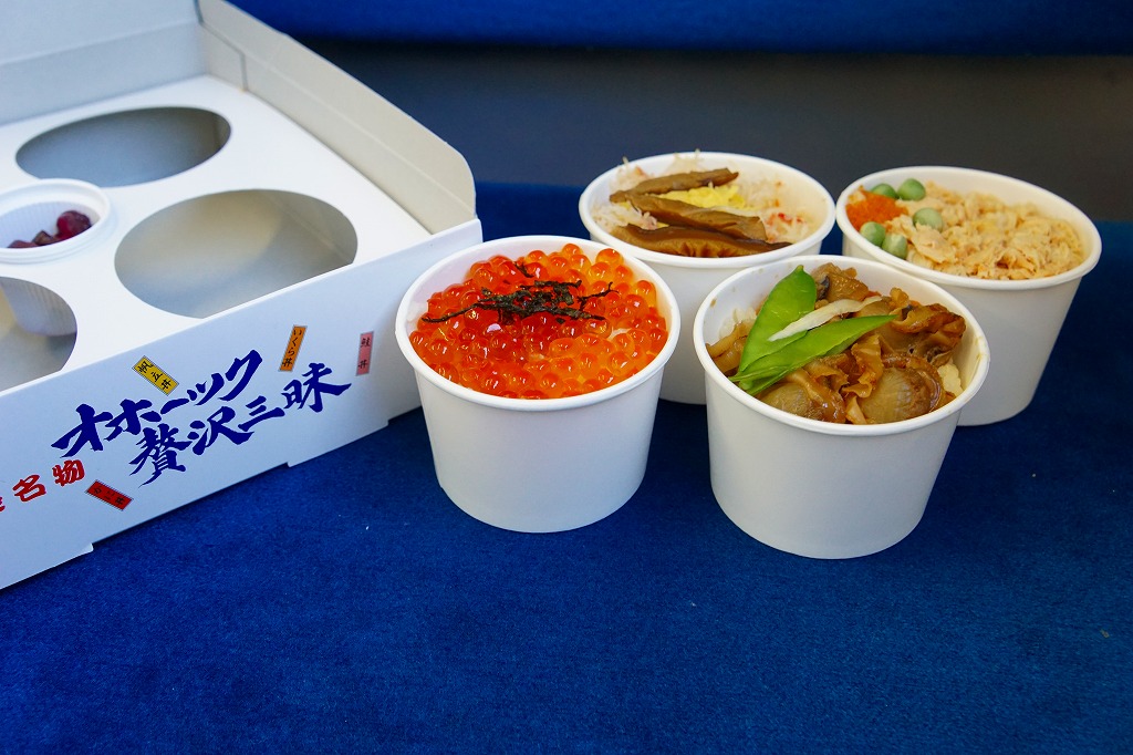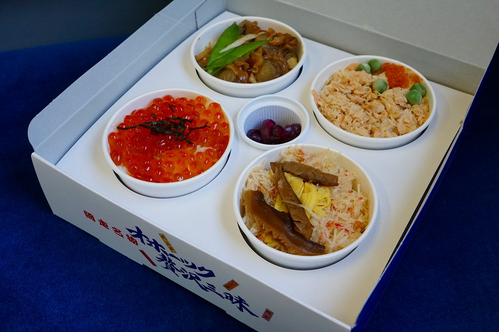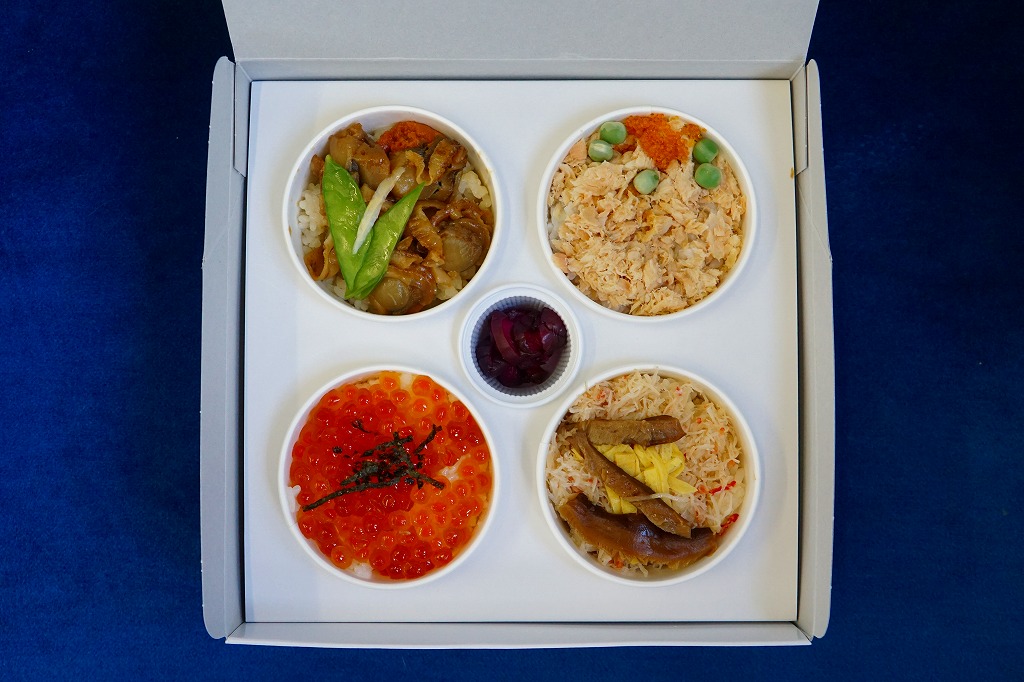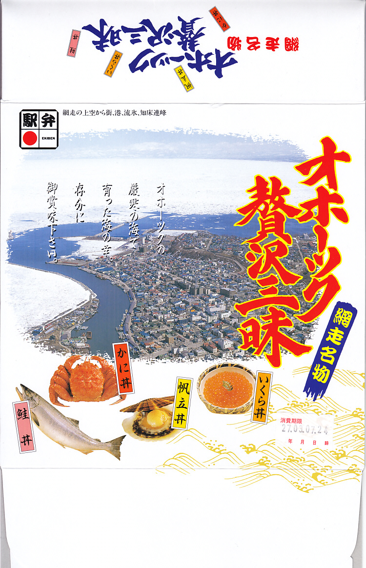 1989(平成元)年頃の発売。流氷がやってきた網走市街の航空写真と、中身の食材のイメージ写真を印刷したボール紙の容器を使用、中身は小さな紙カップに収まる、鮭フレーク丼、カニほぐし身丼、イクラ醤油漬け丼、ベビーホタテ煮丼。柴漬けのプラ製カップも収まる。