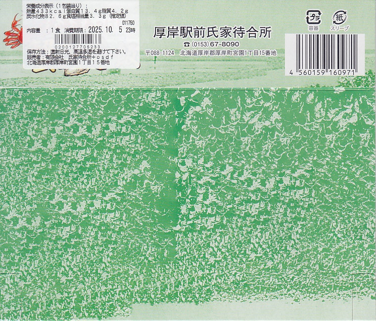容器が小さいので分量は少ないが、見た目にも食べてみても贅沢な仕上がり。厚岸では名物のカキに加えて、年間100t程度のホタテやホッキに、年間20t程度のニシンも獲れるとはいえ、このような駅弁が厚岸の駅や街にあるというイメージが湧かない。実際にこれは、スーパーの駅弁催事でしか売られない疑義駅弁である模様。商品の名前はチラシなどでは「厚岸氏家海鮮弁当」とされた。2011年頃までの販売か。