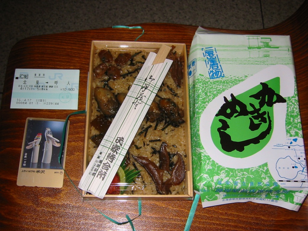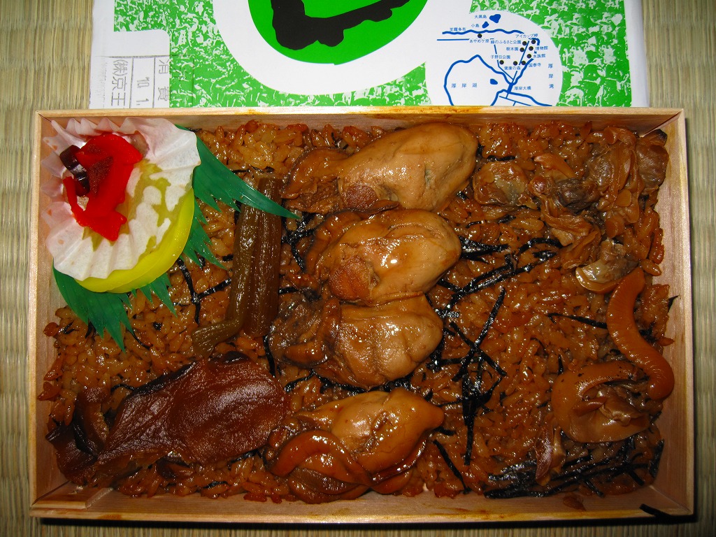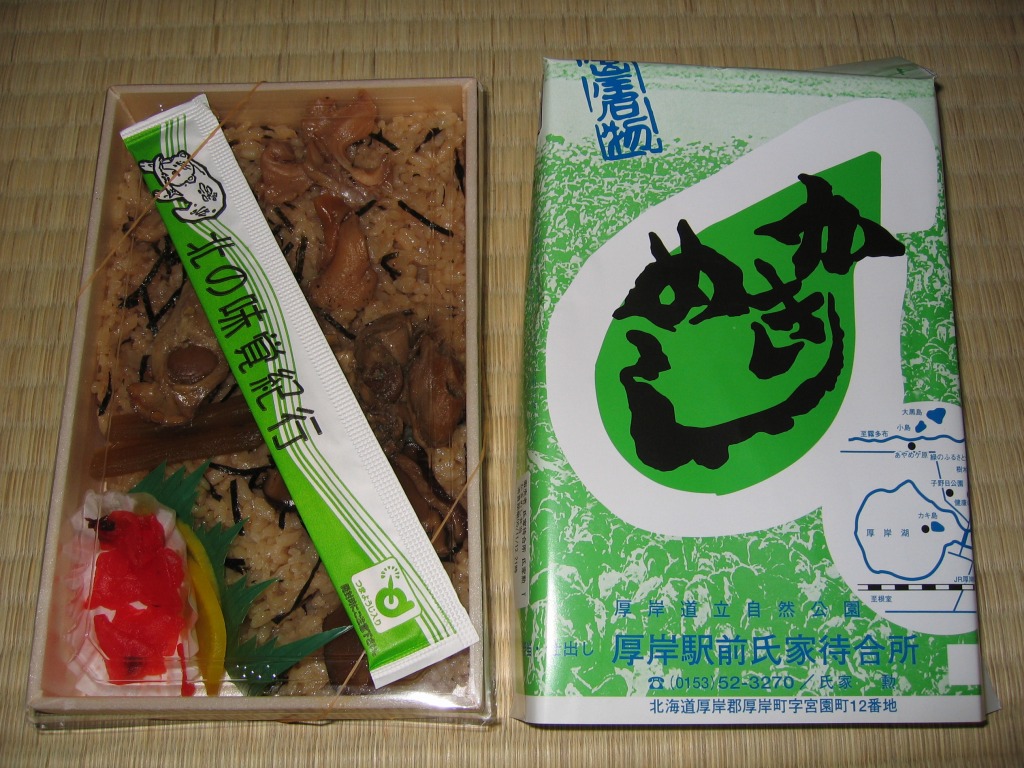 上記の駅弁「かきめし」を、2004〜2005年の駅弁大会シーズンに百貨店の駅弁催事で買ったもの。厚岸駅弁「かきめし」が、京王百貨店駅弁大会に9年ぶりに帰ってきた。しかし中身や価格は現地と同じでも、写真を見比べれば一目瞭然である具の少なさや小ささ、そして写真では分からない風味の薄さで、現地版とは別物だった。しかし、道東の小さな駅にはこのような駅弁があるという事実を、都会の買い物客や業者さんに宣伝する役割は、果たしていたと思う。