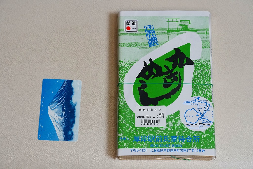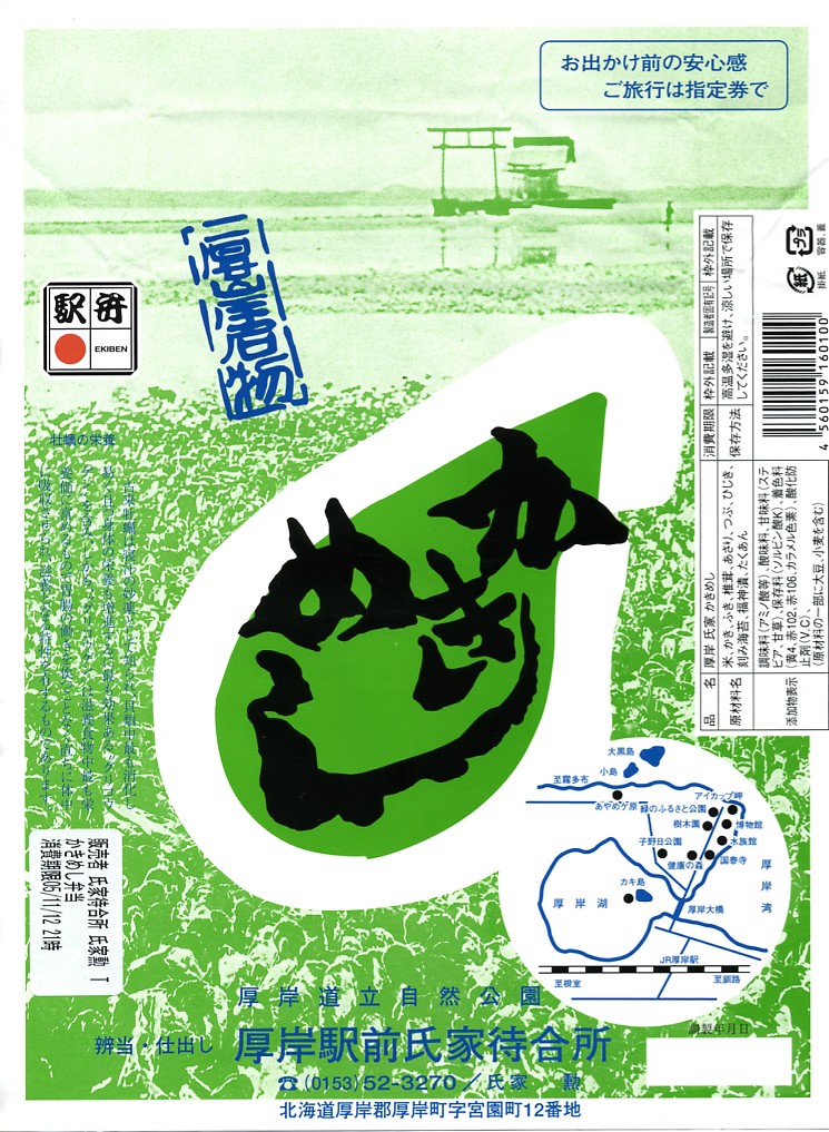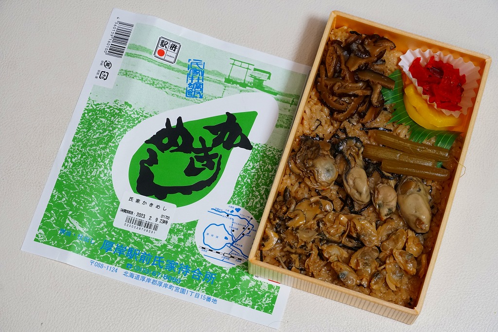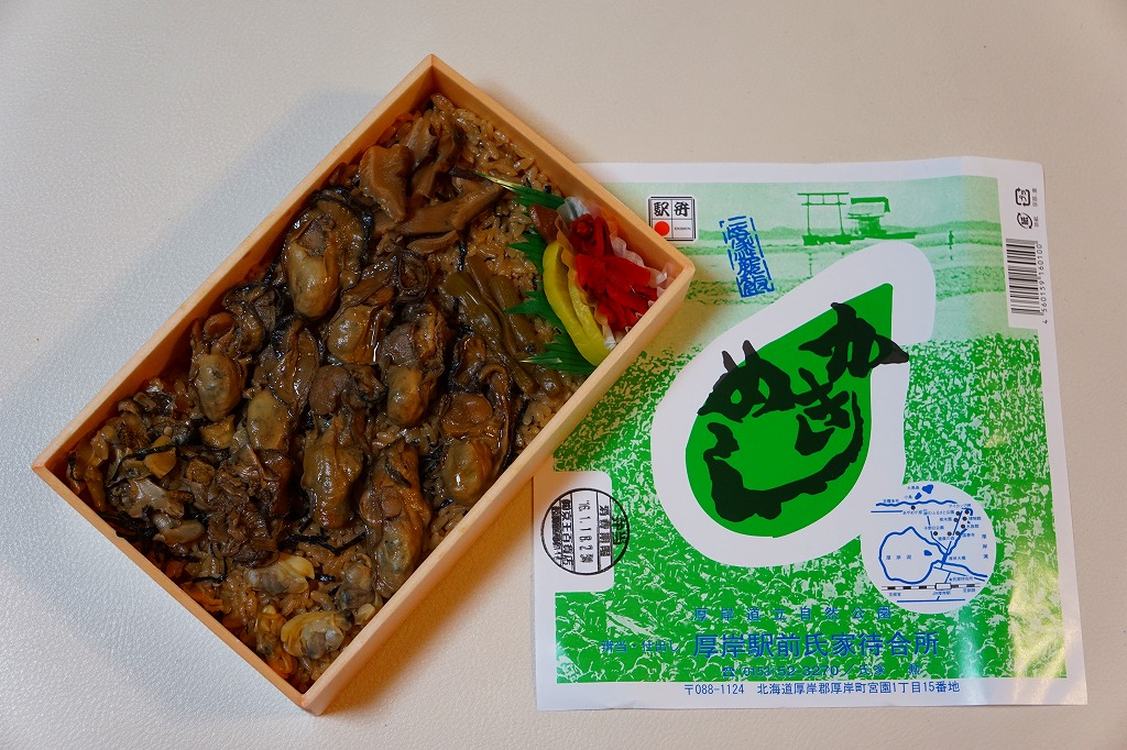 上記の駅弁「かきめし」を、東京駅の駅弁売店で購入したもの。2020年代にはこの駅弁はJR東日本管内の、東京、品川、新宿、上野、大宮駅などの首都圏や、東北上信越地方の主な駅で、一年中売られる商品となった。一方で北海道の厚岸駅では、木曜定休の駅前販売をうたうも、金曜に行くも土曜に行くも閉店で買えず、幻の駅弁、現地で買えない駅弁となっている。ネット上には、予約や問合せようにも電話に出てくれないという報告がみられる。その電話番号はいつしか、この掛紙のように下四桁「8090」のものに替わった。調製元の所在地は厚岸町字名改正事業により2006年11月に変わった。