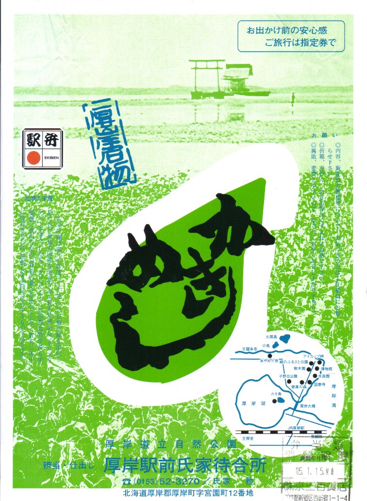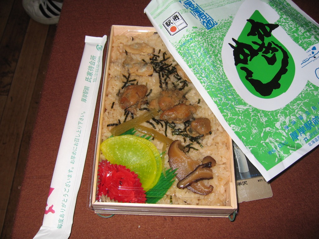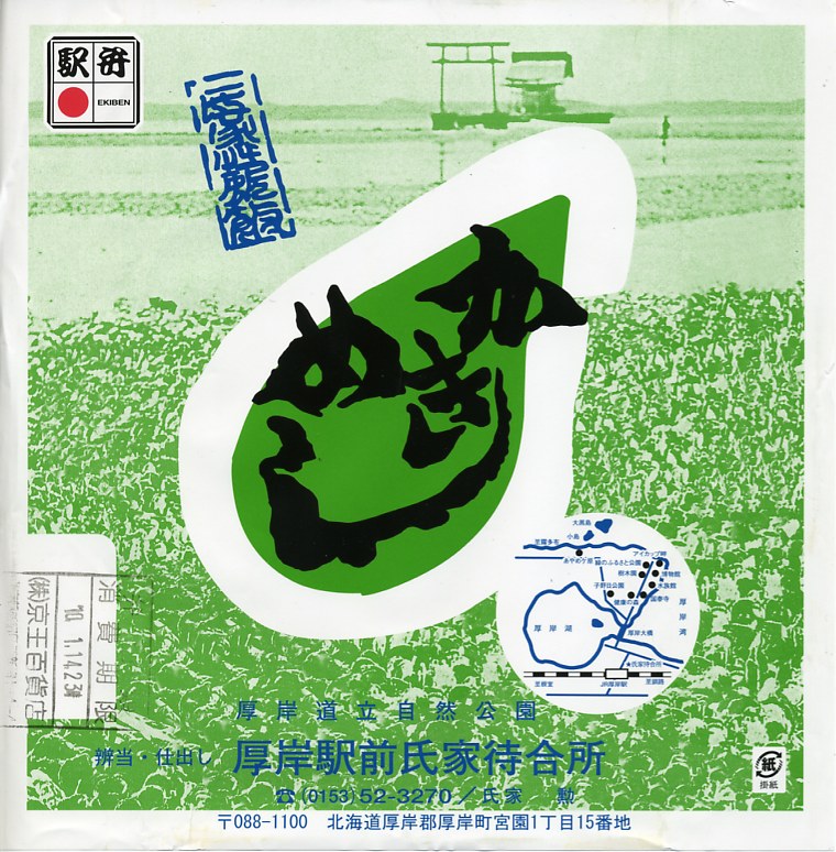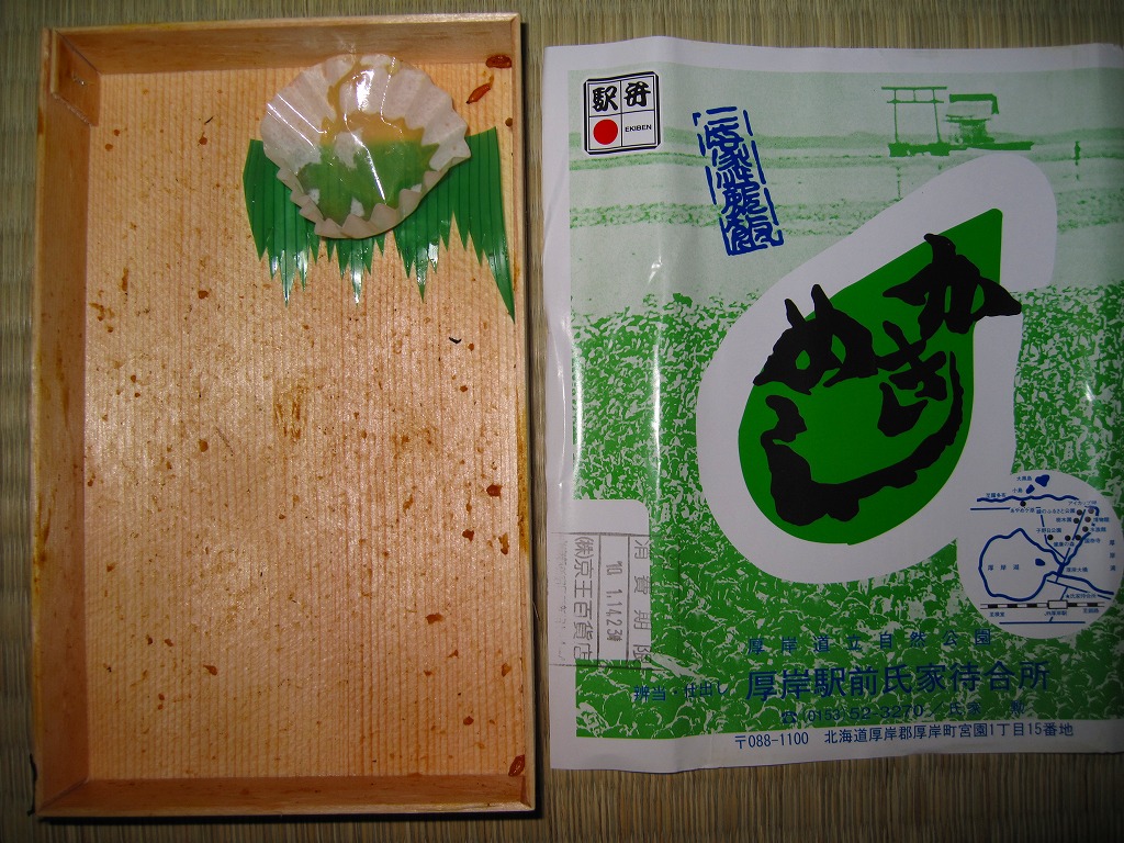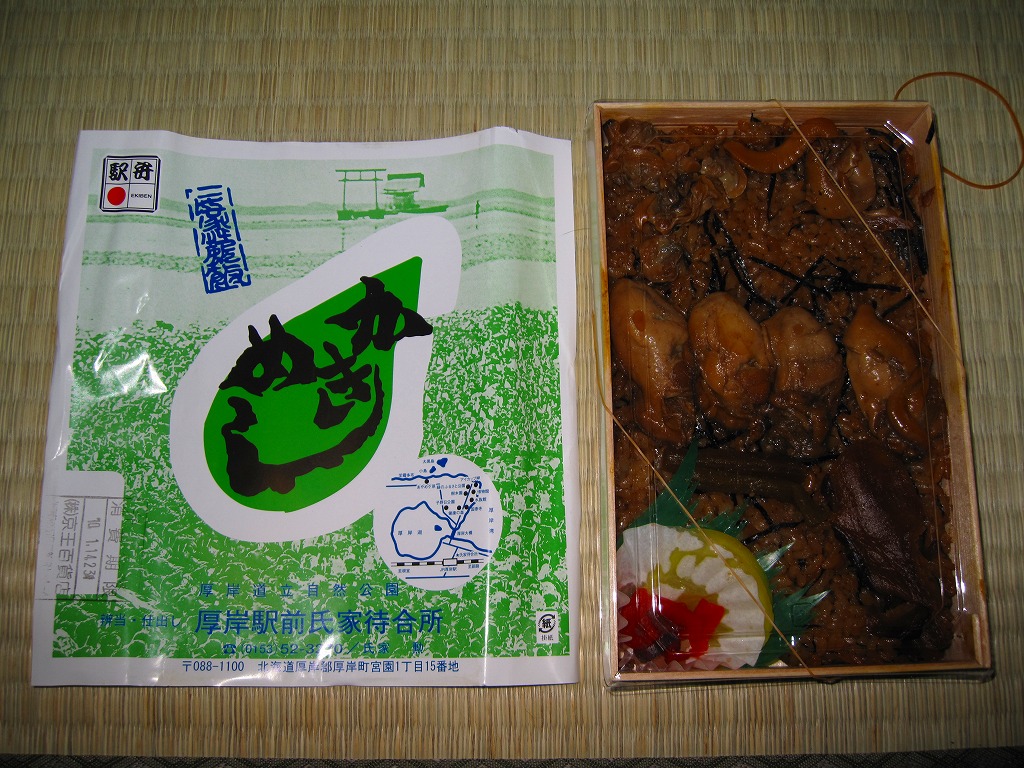 上記の駅弁「かきめし」を、2005〜2006年の駅弁大会シーズンにスーパーで買ったもの。どうもこのシーズンから製造委託のやり方を変えたようで、現地と催事で掛紙に記載される調製元の電話番号が同じになったほか、実演でない販売が広く行われるようになった。厚岸駅で買える駅弁を他所で再現して、自社や地域のPRに励むことは、悪くないと思う。