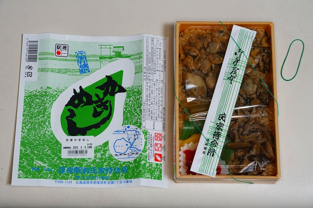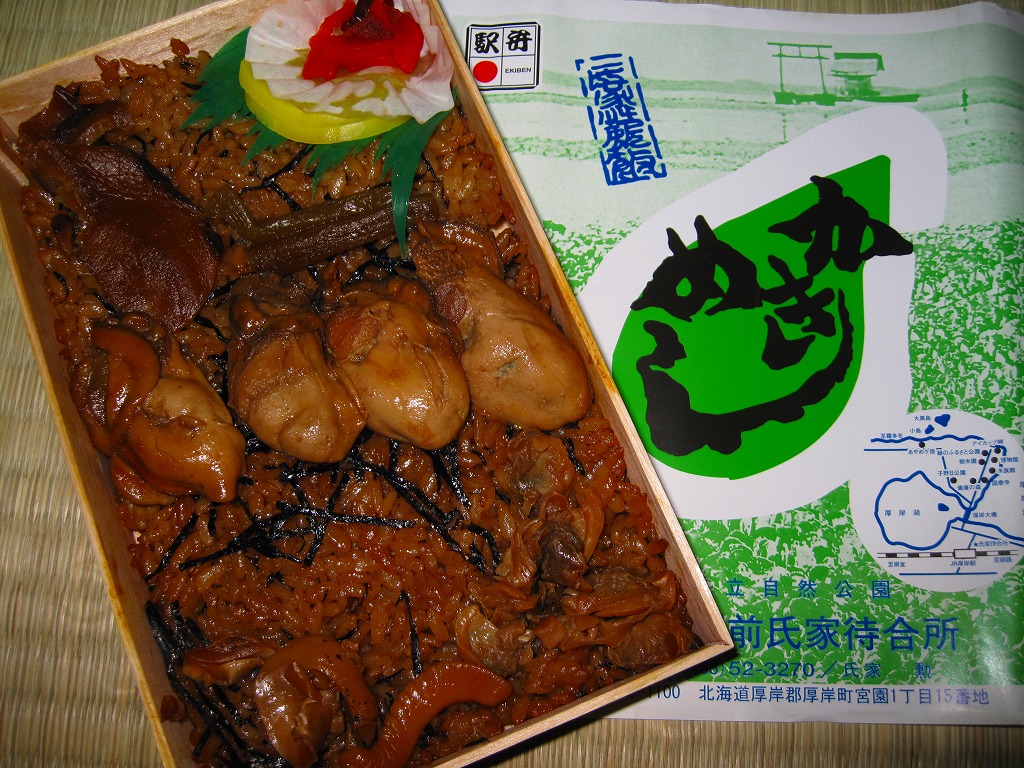 上記の駅弁「かきめし」を、デパートの駅弁大会で購入したもの。2005(平成17)年までは現地のものと実演販売とでは、掛紙に記載する調製元の電話番号が異なり、風味にも差があったが、この頃までに現地でも催事でも、同じような姿と中身と風味のものが買えるようになった。製造委託による実演販売でないスーパーやデパートで売られたり、首都圏のJR東日本の駅では一年中販売する駅弁売店もあり、これらでも現地の味がよく再現されていると思う。商品名は「氏家かきめし」や「厚岸氏家かきめし」となることがある。価格も現地と同じで、2010年の購入時で980円、今なら1,480円のはず。