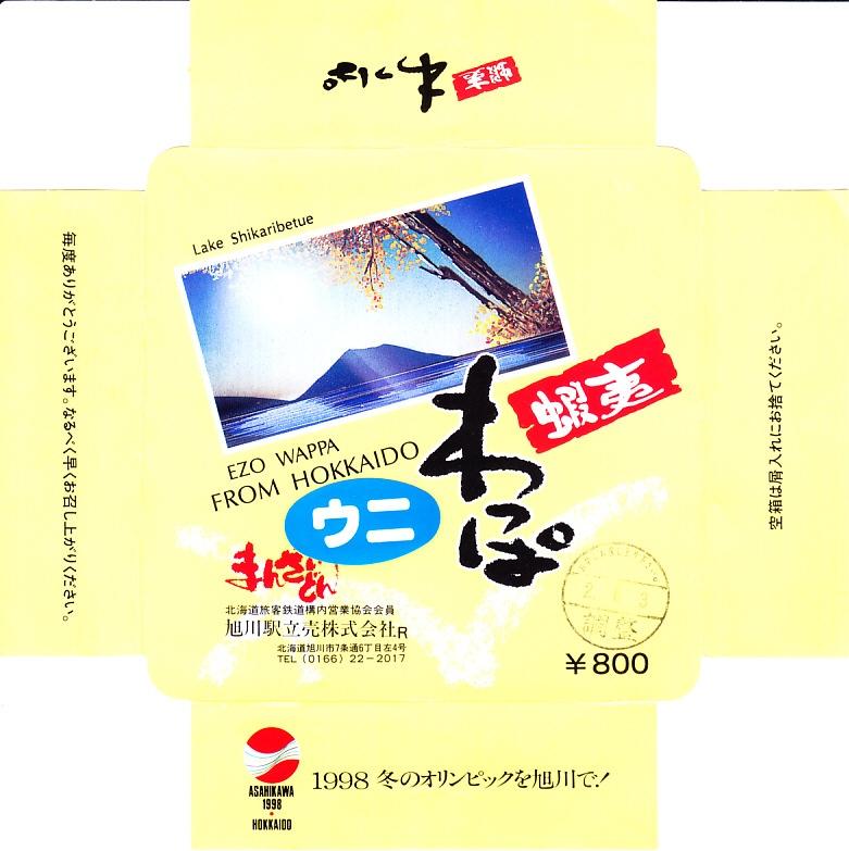 1990(平成2)年6月3日の調製と思われる、昔の旭川駅弁のふた。ここでは「ウニ」のシールを貼った、現地でも催事でもいろんな中身に対応できる共通の掛紙か。「1998冬のオリンピックを旭川で!」できていたら、どうなっていたか。