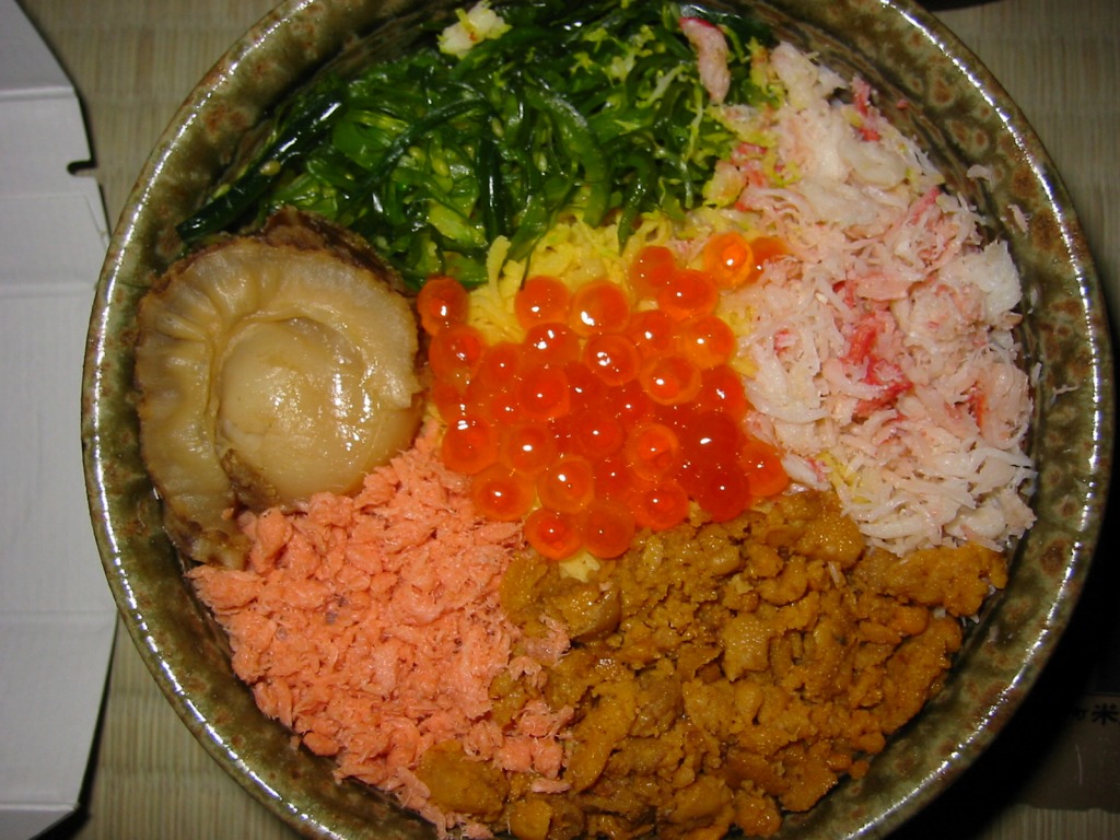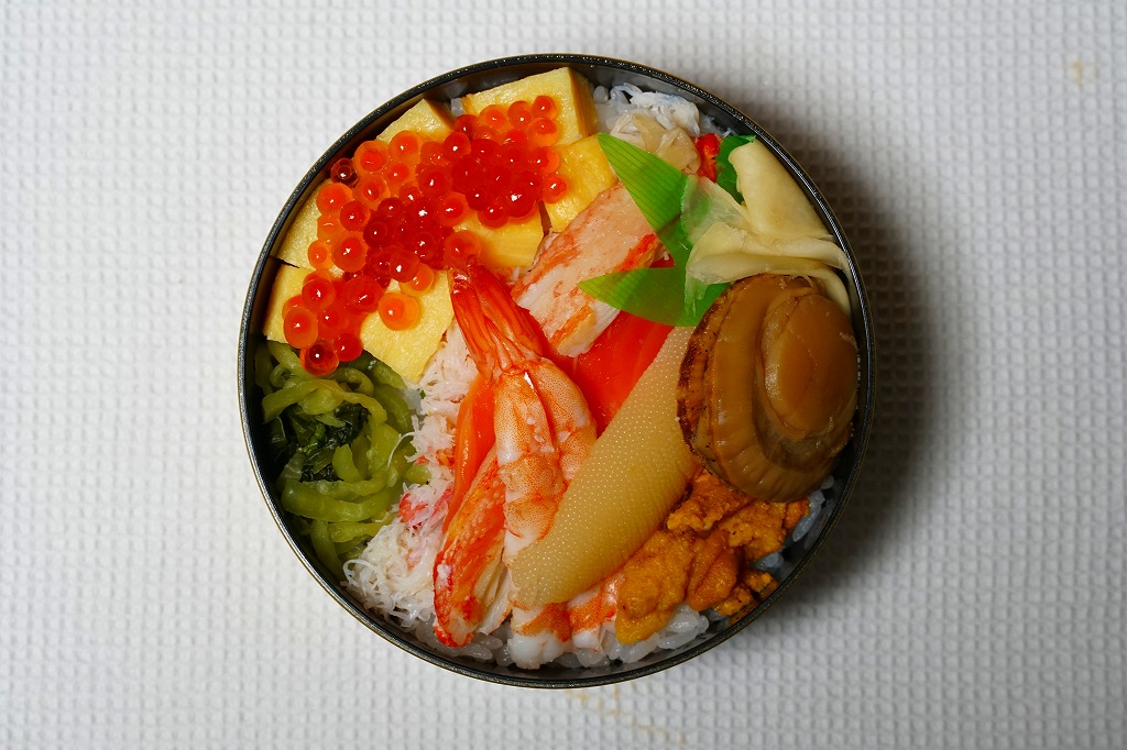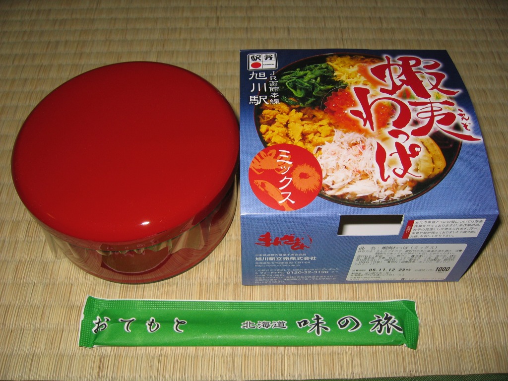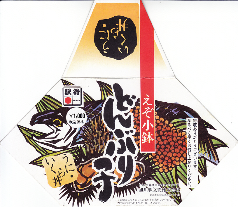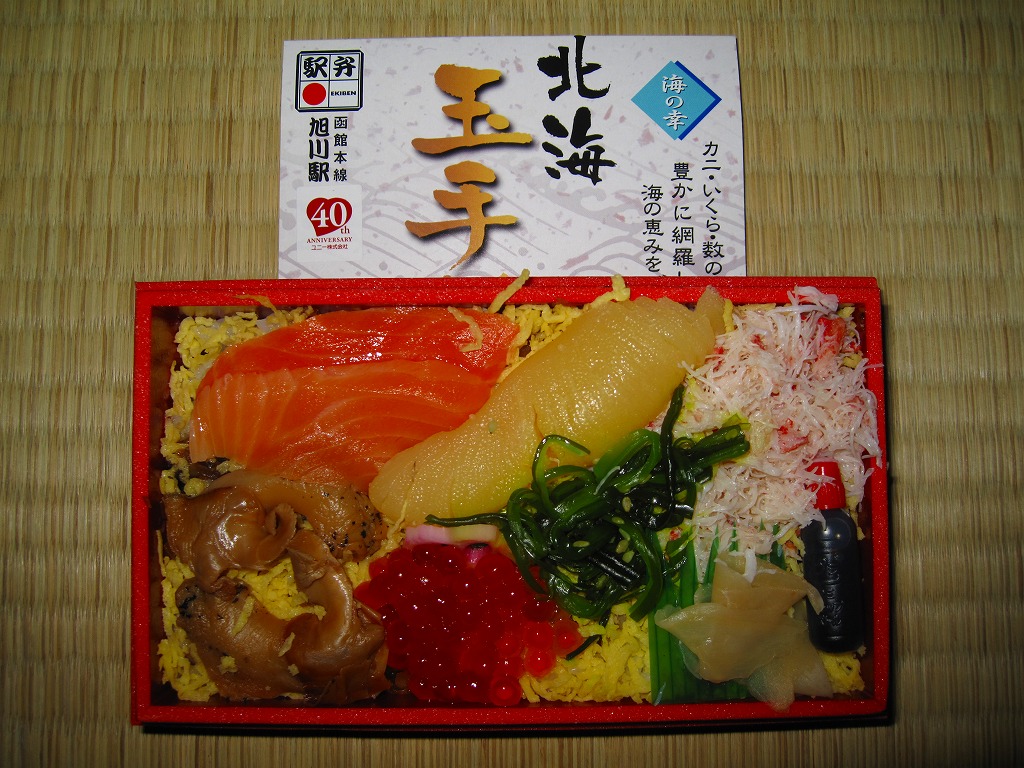 2002(平成14)年に発売。なぜか岐阜県美濃焼の美しい容器を使用し、中身は酢飯の上にウニ、カニ、イクラ、帆立、ワカメ、鮭などが載る、他の旭川駅弁とよく似た内容。味も同じようにうまい。