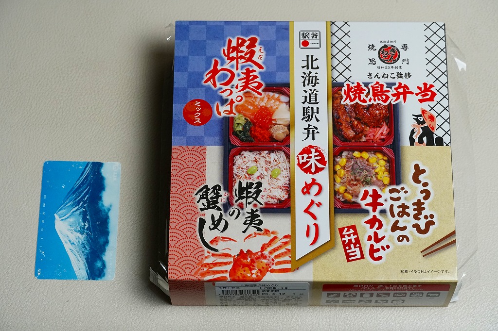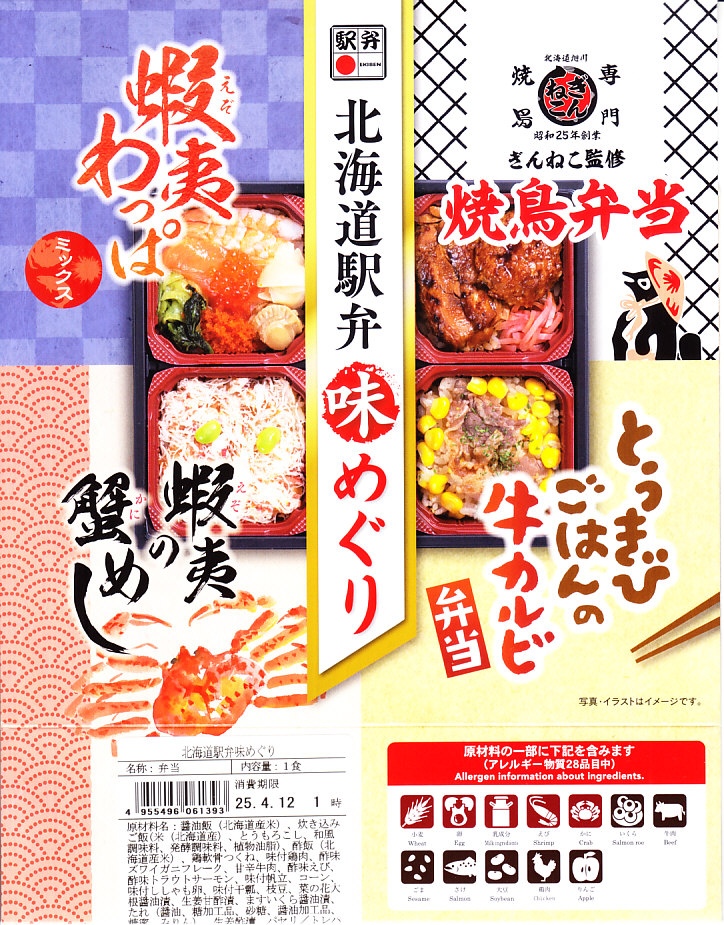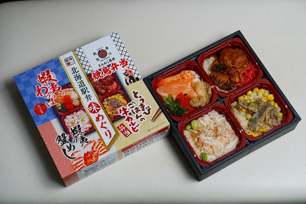 2025(令和7)年2月3日に東京駅の駅弁売店「駅弁屋 祭」で発売と発表。実際には秋冬の駅弁大会シーズンに向けた、2024(令和6)年秋の新商品ではないか。スリーブに並べた名前や写真のとおり、既存の旭川駅弁「蝦夷わっぱ」「焼鳥弁当」「とうきびごはんの牛カルビ弁当」「蝦夷の蟹めし」のミニ版の詰合せ。松花堂弁当のように配した4つの正方形に、酢飯や茶飯を詰めて、ちらしずし、焼き鳥と鶏肉団子、コーンや牛肉、カニほぐし身などで覆ったものを、ひとつずつ詰めた。旭川駅の駅弁だけをめぐっても、これだけ幅広いラインナップなので、北海道駅弁をめぐったように見える。