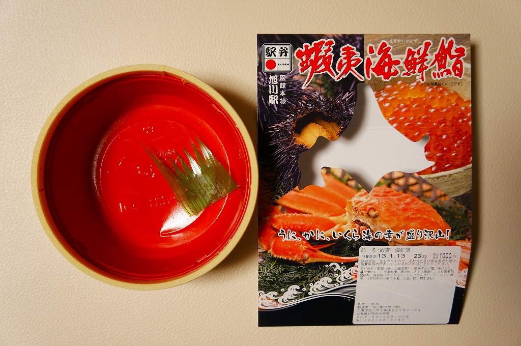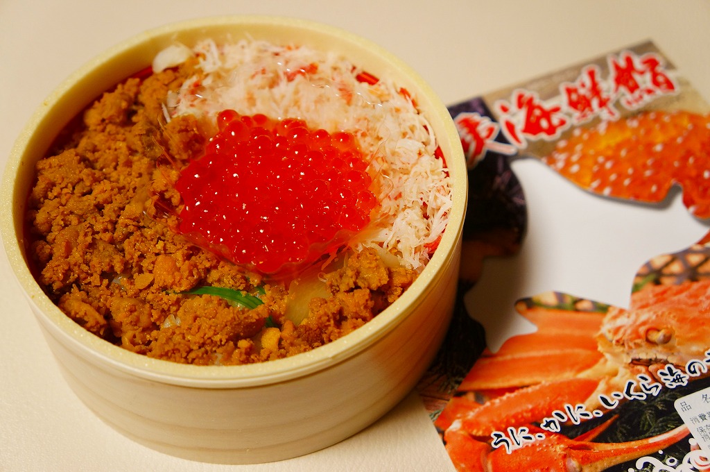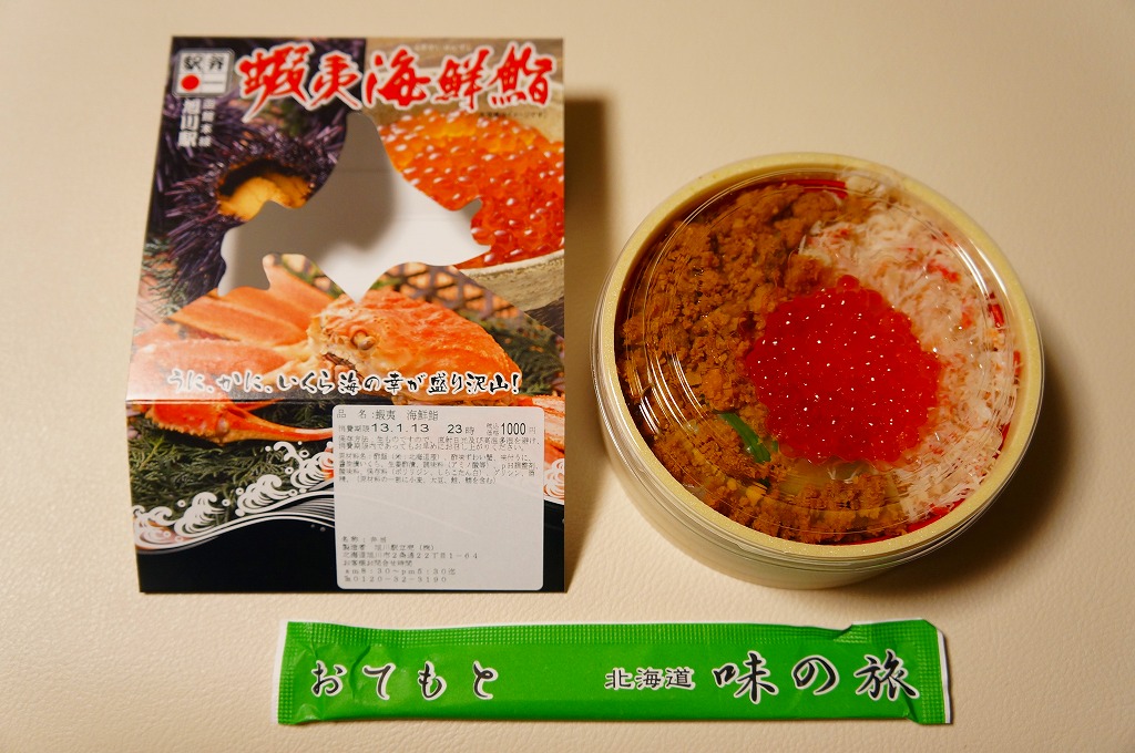 2012(平成24)年秋の新発売またはリニューアルか。円形の容器に酢飯を詰めて、ズワイガニのほぐし身とウニのそぼろを敷き、イクラ醤油漬のカップを載せたもの。北海道や旭川の駅弁、あるいは北海道催事の弁当として、何の特徴もないと思うが、駅弁らしい、旭川らしい味ではある。価格は2013年の購入時で1,000円、2014年時点で1,080円。2016年までの販売か。