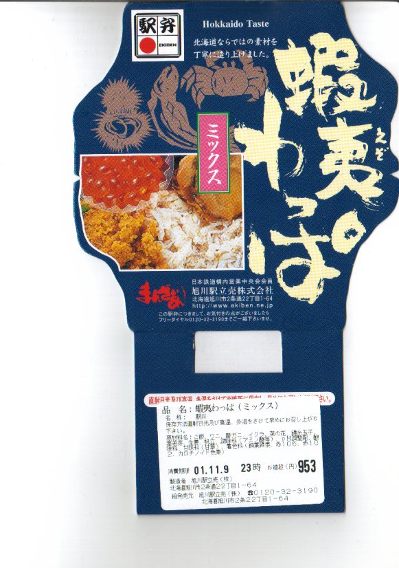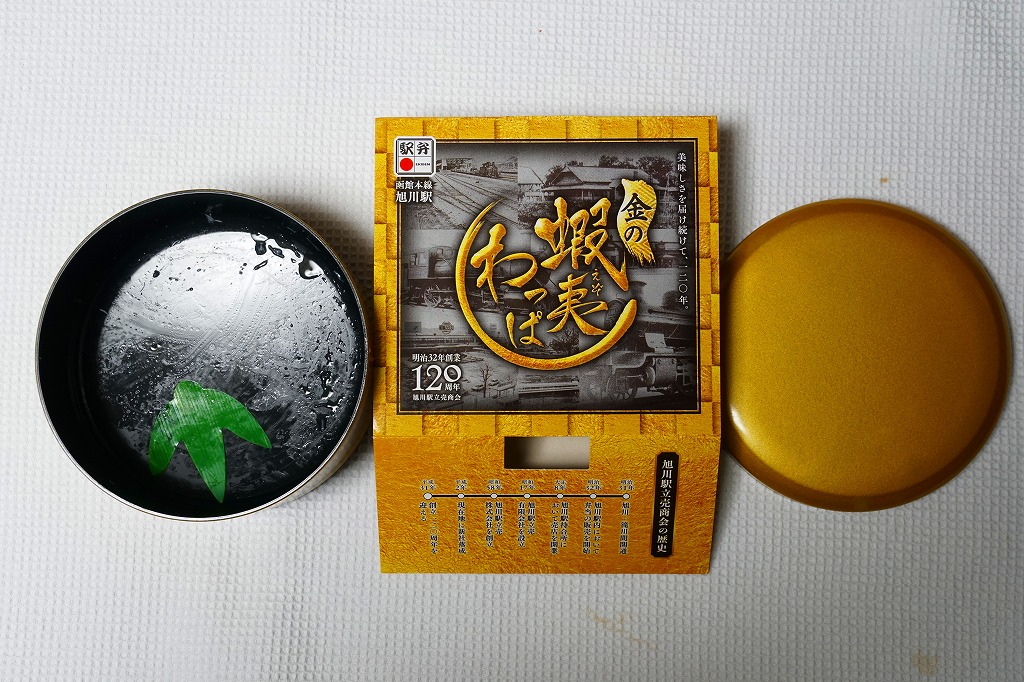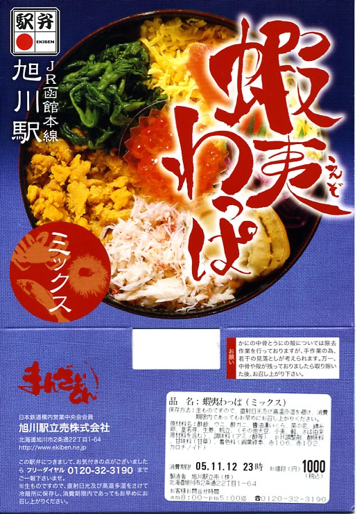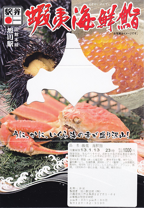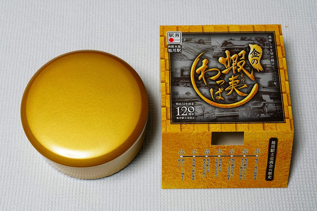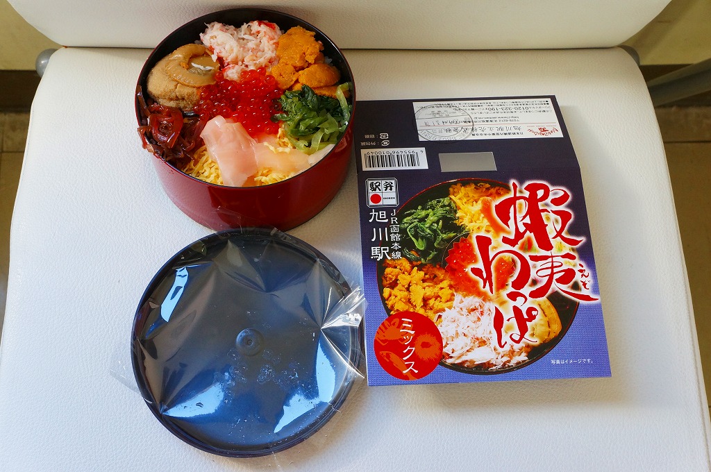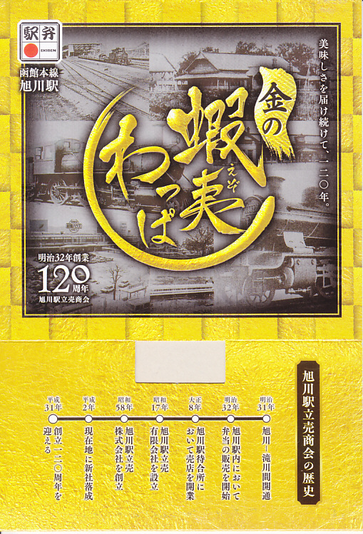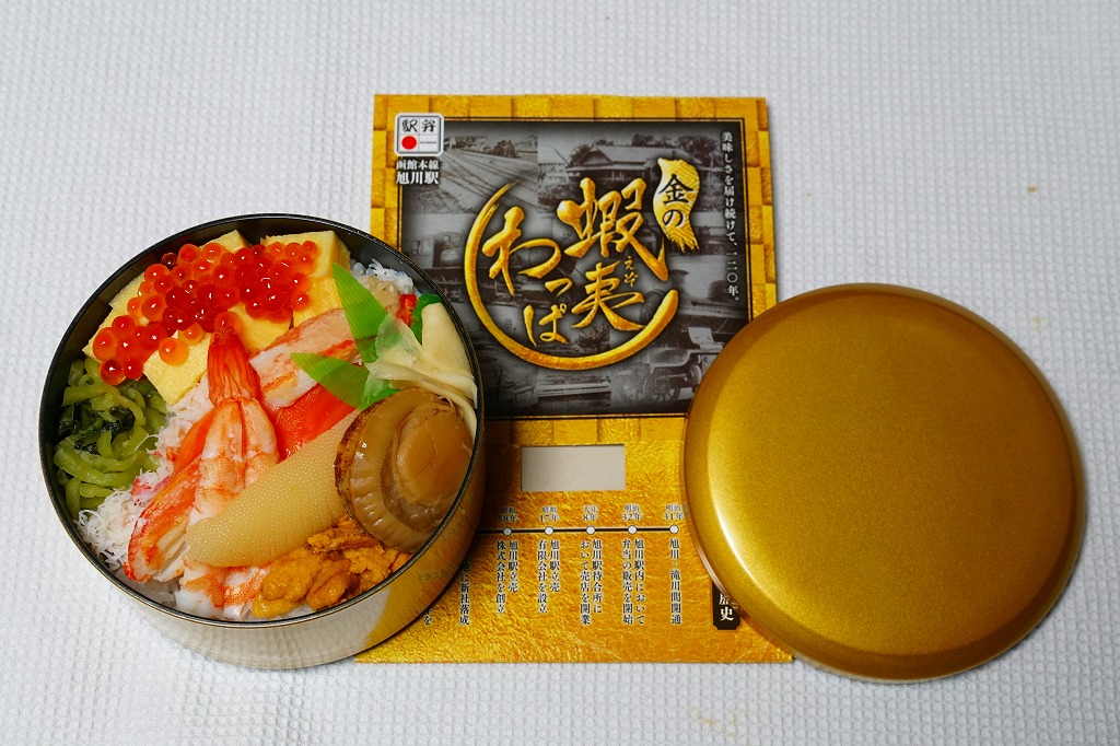2019(平成31)年1月の京王百貨店の駅弁大会や阪神百貨店の駅弁大会で実演販売。調製元の創業120周年記念の駅弁だそうな。スリーブの上面には旭川駅の昔の写真がデザインされ、側面に調製元の歴史を記す。丸い金色のプラ容器に酢飯を敷き、えび、かに、サーモン、ホタテ、ウニ、カズノコ、玉子焼、お新香、ガリで覆う。下記の駅弁「蝦夷わっぱミックス」の上等版のようだが、印象は同じ。1年間ほどの販売か。