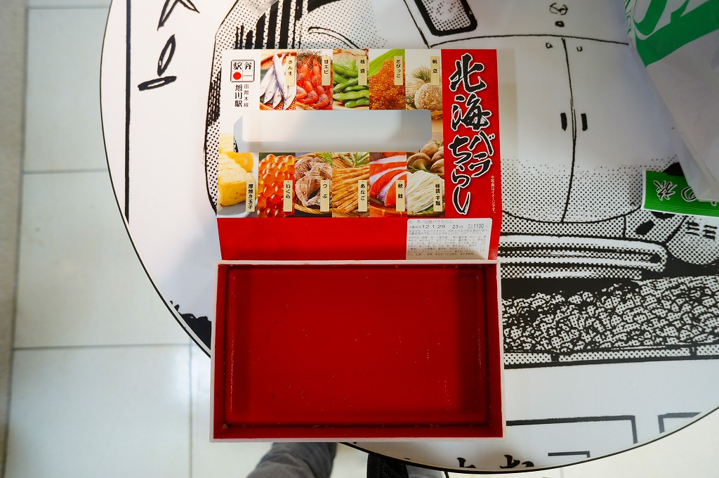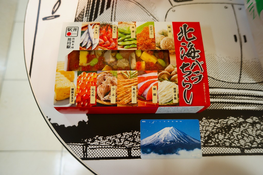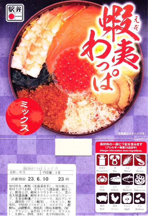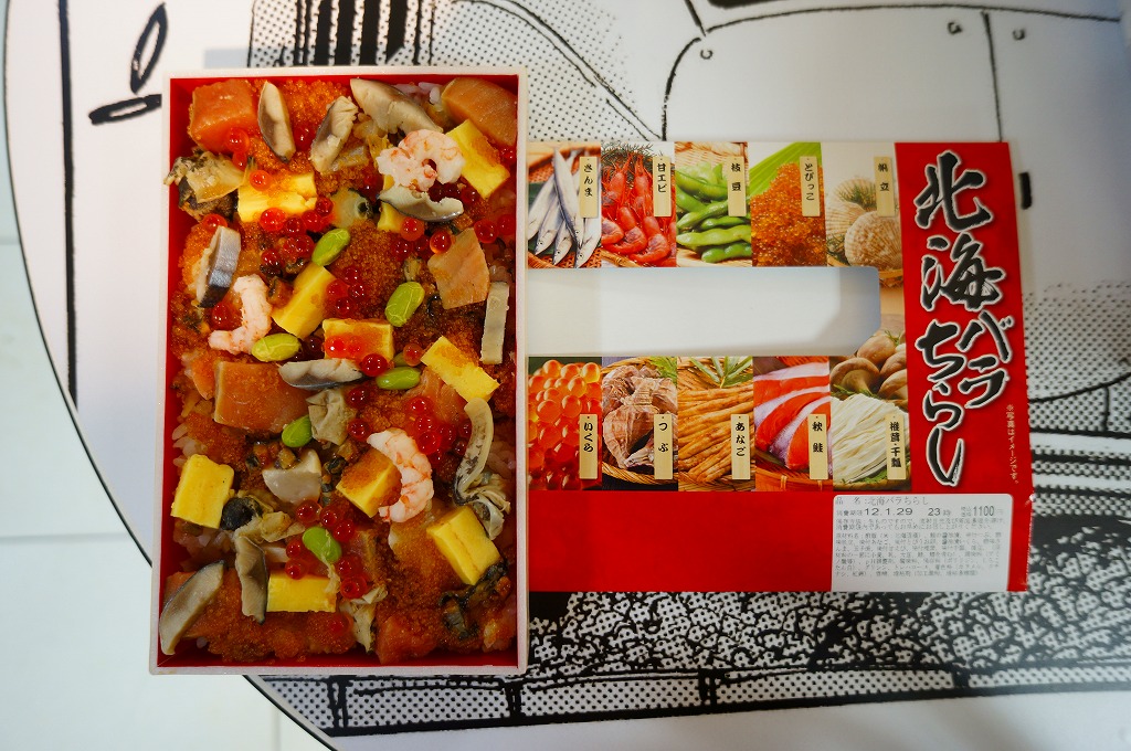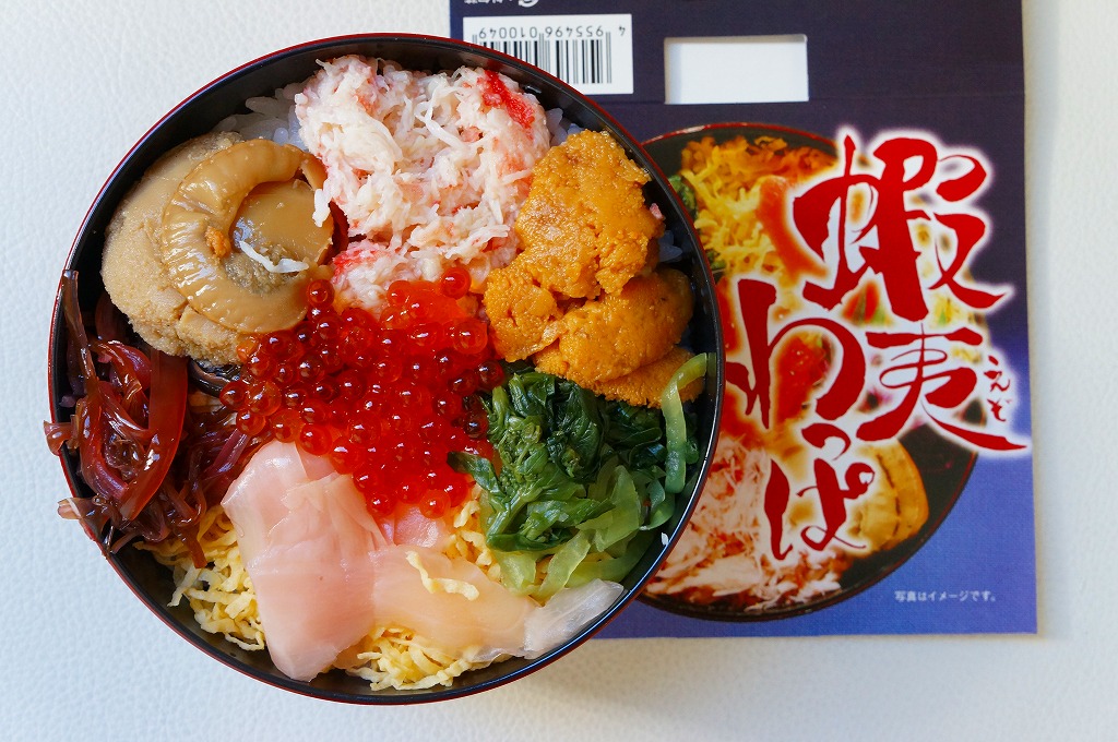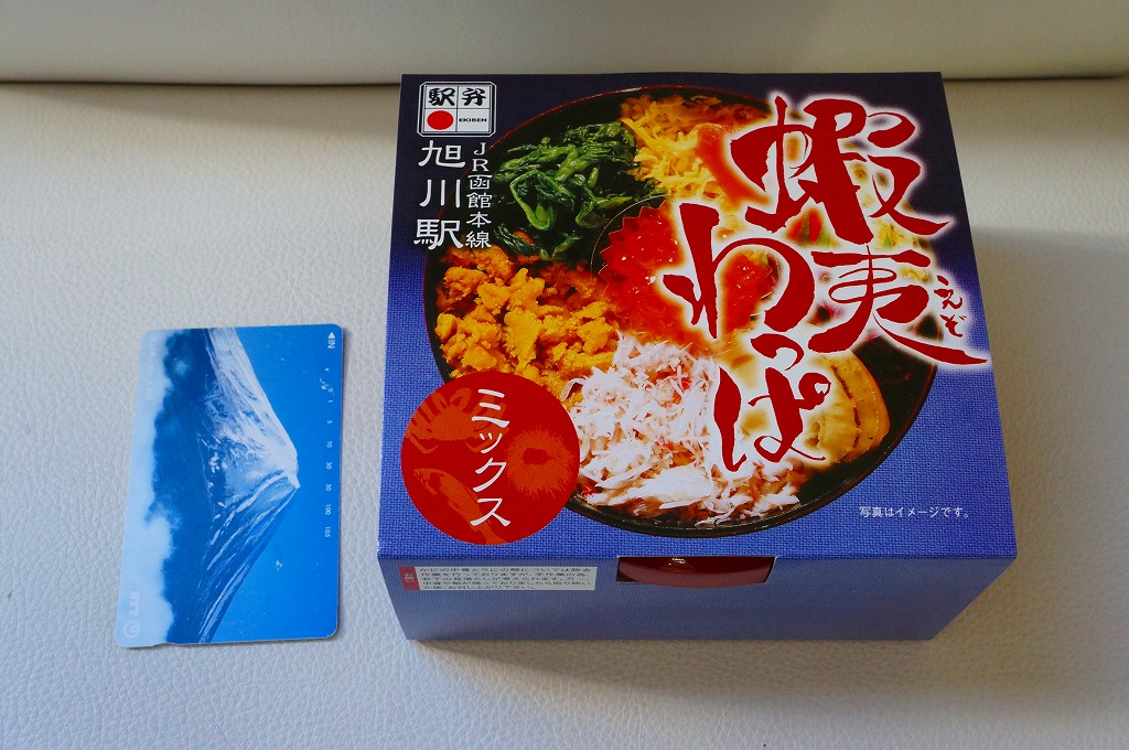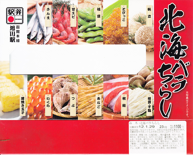 2019(平成31)年1月の京王百貨店の駅弁大会や阪神百貨店の駅弁大会で実演販売。調製元の創業120周年記念の駅弁だそうな。スリーブの上面には旭川駅の昔の写真がデザインされ、側面に調製元の歴史を記す。丸い金色のプラ容器に酢飯を敷き、えび、かに、サーモン、ホタテ、ウニ、カズノコ、玉子焼、お新香、ガリで覆う。下記の駅弁「蝦夷わっぱミックス」の上等版のようだが、印象は同じ。1年間ほどの販売か。