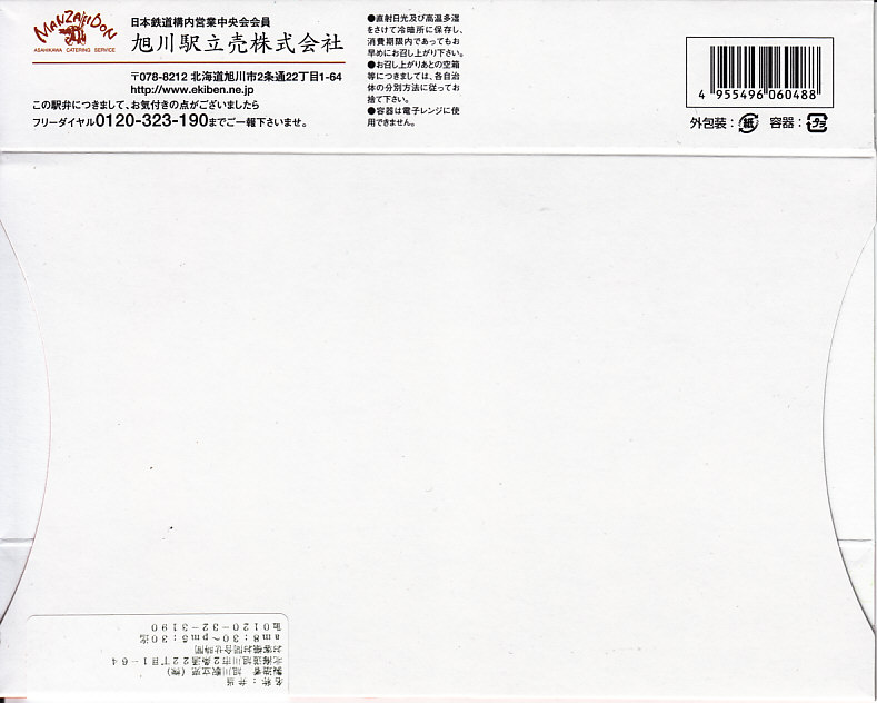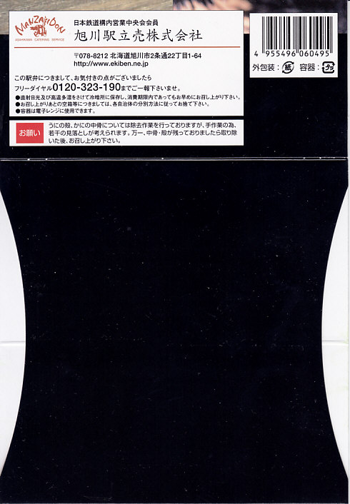 2005(平成17)年11月12日に購入した、旭川駅弁のスリーブ。上記の2014年のものと変わらない。調製元の情報の印刷内容が、ちょっとだけ違う。中身も中身の見本写真も変わらない。