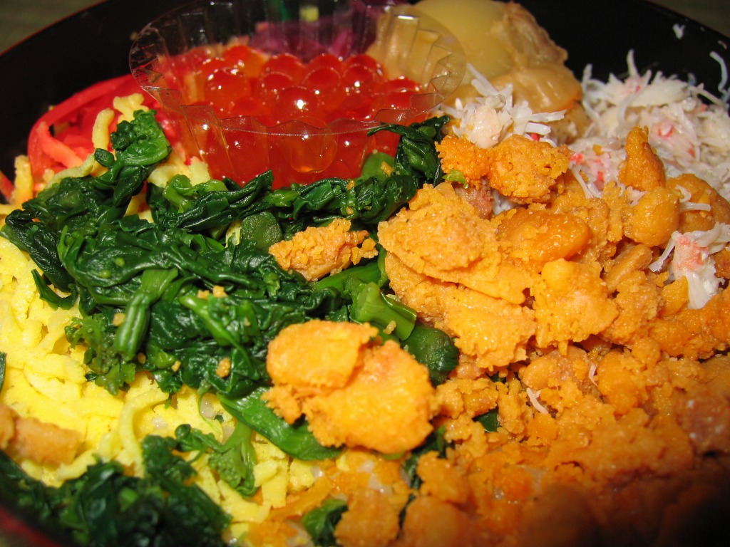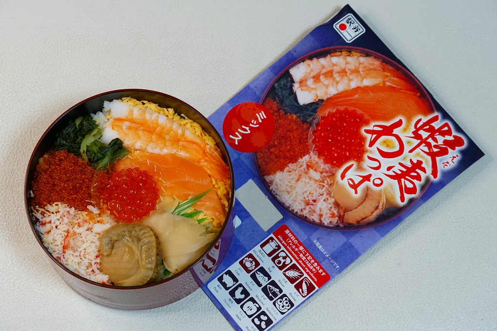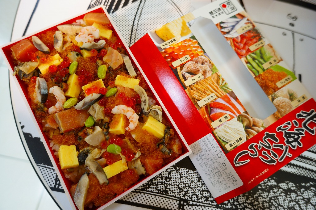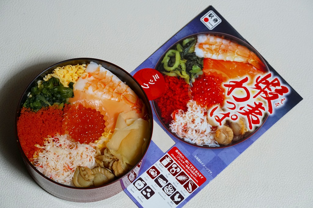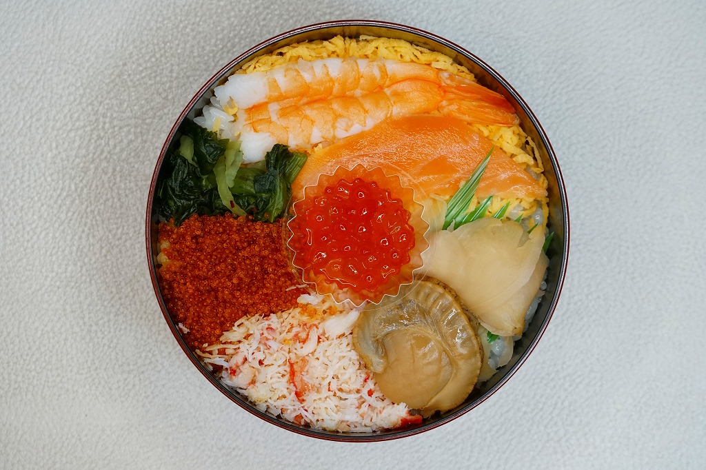 秋冬の駅弁大会シーズンに向けた、2011(平成23)年秋の新商品。催事場でデビューし、後に駅売りも始めた模様。薄い長方形の容器に透明な上げぶたをして、使用する食材の見本写真を並べたボール紙の枠にはめる。中身は薄く敷いた酢飯の上をサイコロ状のサケ醤油漬、味付つぶ貝、ホタテの酢の物、アナゴ、酢締めサンマ、玉子焼、アマエビ、シイタケ、カンピョウと枝豆でぐちゃぐちゃに覆い、トビッコとイクラ醤油漬を振り掛けたもの。米子駅弁「海の宝箱」や小樽駅弁「海の輝き」に似た印象がもてる、見た目にキレイでとても賑やかなお弁当。食べても風味が賑やか。2015年までの販売か。