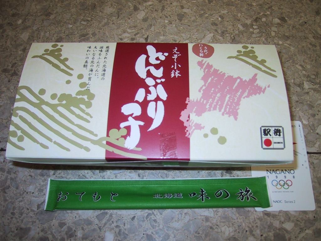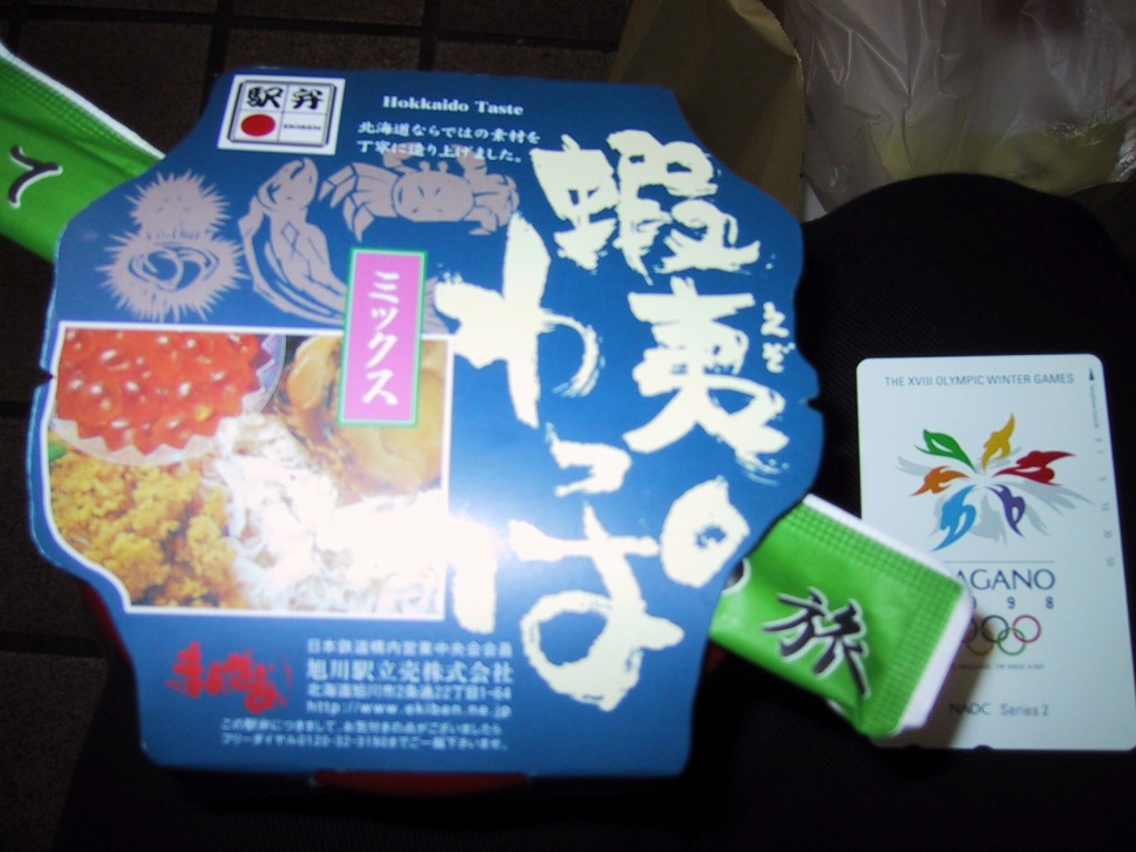 2001(平成13)年11月9日に購入した、旭川駅弁のスリーブ。後のものと形状が異なるが、容器の形や中身は変わらない。
