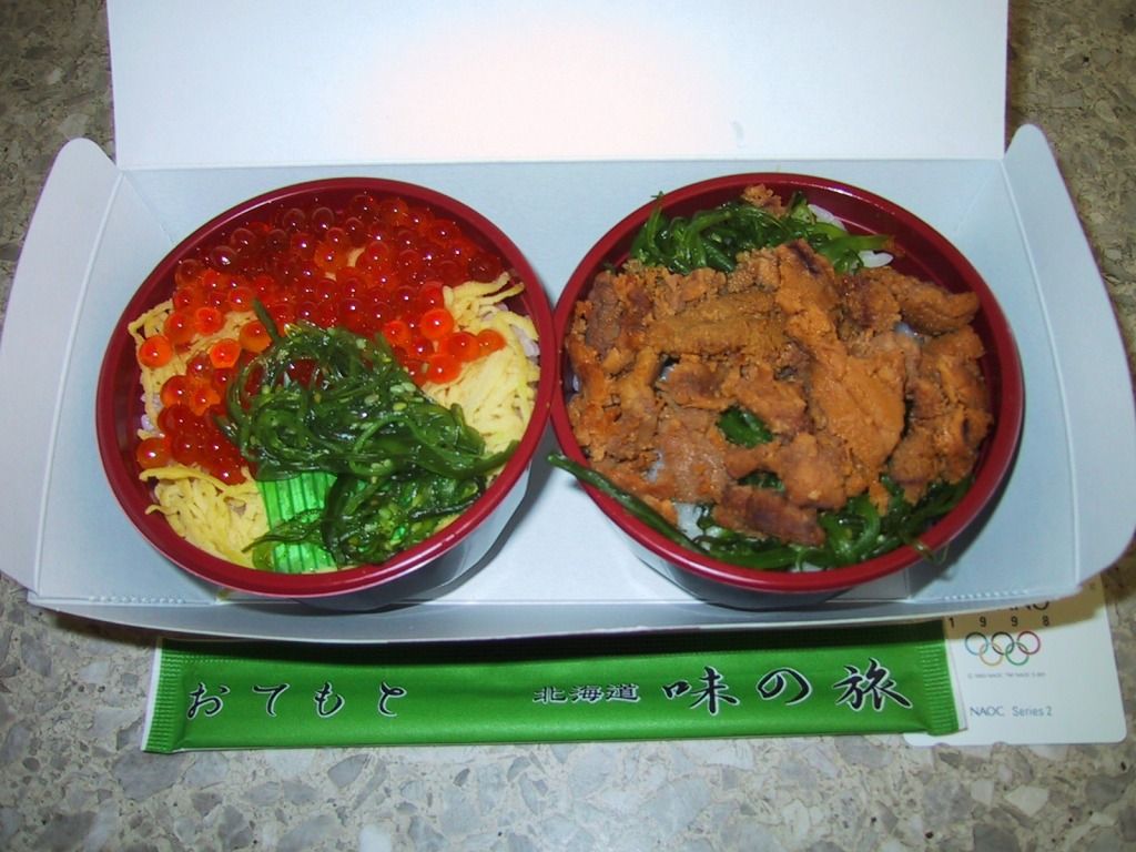時刻表掲載分では旭川駅弁一の豪華駅弁なのだが、中身はとてもシンプル。長方形のボール紙製パッケージの中に真ん丸い容器がふたつ入り、片方が味付け御飯にイクラ・鮭ほぐし・錦糸卵を載せたイクラ丼で、もう片方がウニシートとウニを敷き詰めたウニ丼。北海道に来たらイクラとウニを食べたいという旅行者の欲求にストレートに応えてくれる駅弁。ふたりで分けるのにも好都合。