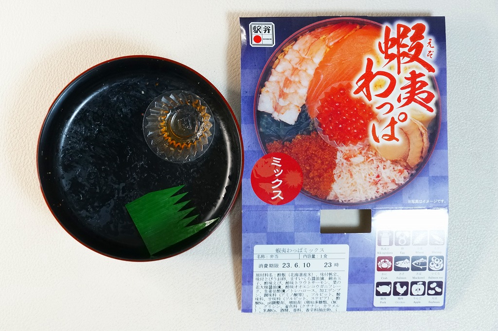 上記の駅弁「蝦夷わっぱミックス」の、2023(令和5)年時点での姿。上記の2024年のものと変わらないように見えて、具の一部が差し替えられ、スリーブの写真も異なることがわかる。丸い漆器風のプラ容器に酢飯を詰め、ホタテ、とびっこ、錦糸卵、ボイルえび、サーモン、菜の花、カニフレーク、甘酢生姜で覆い、イクラを据えていた。