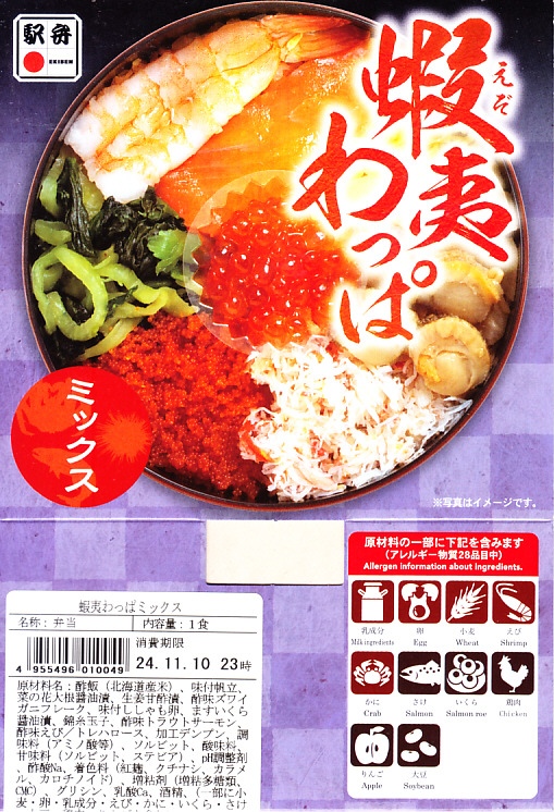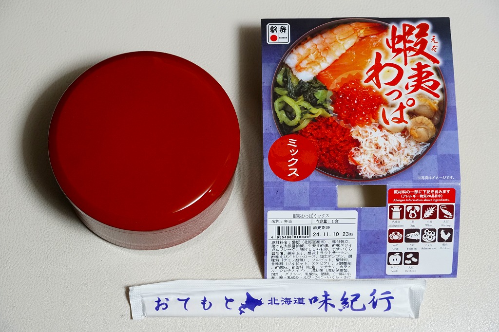 1985(昭和60)年頃に旭川駅で発売。盆地の町に海の幸。丸い漆器風のプラ容器に酢飯を詰め、ホタテ、ししゃも卵、錦糸卵、酸味えび、酸味トラウトサーモン、菜の花大根醤油漬け、酸味ズワイガニフレーク、甘酢生姜で覆い、ますいくら醤油漬を据える。いろんなものが載るから「ミックス」。いろいろ食べられて、楽しい駅弁。価格は2010年時点で1,000円、2014年4月の消費税率改定で1,030円、2015年時点で1,050円、2021年時点で1,180円、2024年時点で1,290円、11月時点で1,390円。2013年頃までは「ミックス」に加えて、ウニやカニやイクラの「蝦夷わっぱ」もあったが、今はこの「ミックス」だけが現存。
