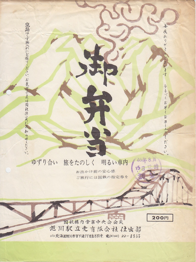 1971(昭和46)年8月15日12時の調製と思われる、昔の旭川駅弁の掛紙。絵柄は下記の駅弁「御弁当」と同じく、おそらく大雪山に旭橋を描く。