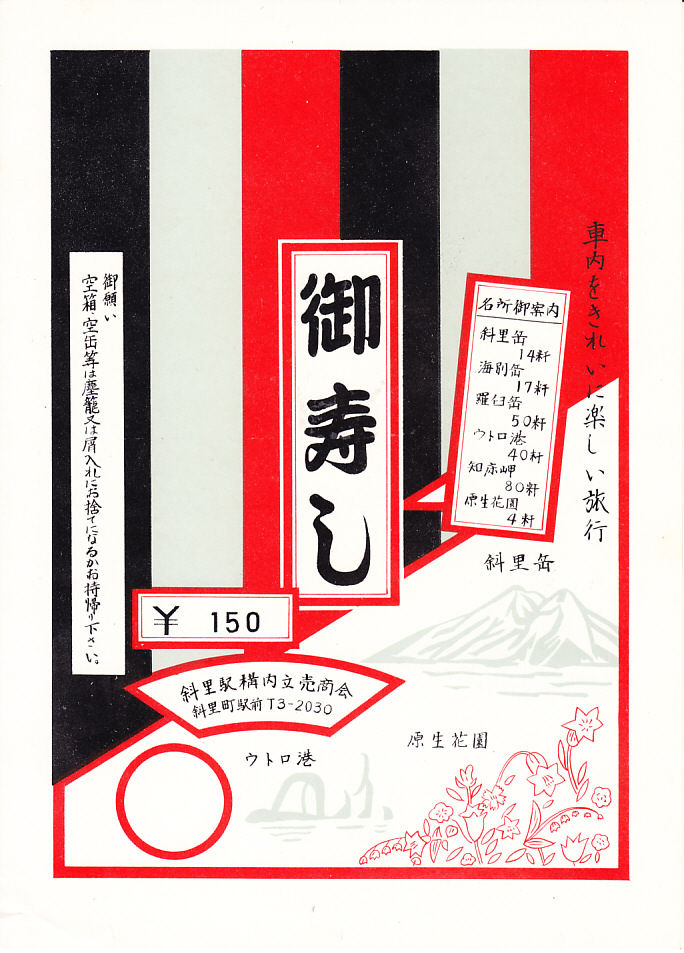 昭和40年代、1970年前後のものと思われる、昔の斜里駅弁の掛紙。斜里岳、原生花園、ウトロ港と、21世紀と変わらない地元の観光名所が描かれる。現在の知床斜里駅、1998(平成10)年3月までの斜里駅はかつて、このように公式な駅弁販売駅であった。