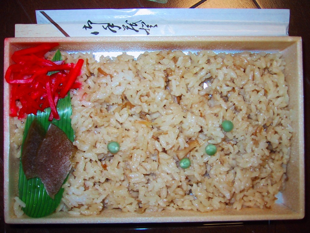 折箱に干しホタテ貝柱をほぐして炊き込んだ御飯を敷き詰め、グリーンピースで彩り、紅生姜と奈良漬けを添える。大きなホタテ煮が派手な現在のホタテ駅弁と違い、見た目にホタテはひとつもなく、口の中でその滋味を味わうもの。