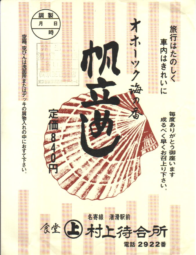 名寄本線の渚滑(しょこつ)駅で1935(昭和10)年から1978(昭和53)年まで販売された駅弁を、2000(平成12)年1月の京王百貨店の駅弁大会で復刻販売。今回は2003(平成15)年1月の京王百貨店の駅弁大会で再び販売されたものを購入できた。