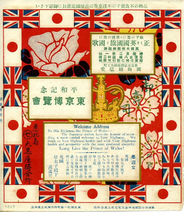 1922(大正11)年の調製と思われる、昔の恵比島駅弁の掛紙。同年に上野公園で開催された平和記念東京博覧会で英国の皇太子殿下が来日されたことを記念して、全国各地の駅弁屋が同じデザインの記念掛紙を使用したもの。周囲に日本と英国の国旗を配し、右に駅弁の名前、左下に調製元、下部に日英の歓迎文、上部の2枠は広告枠。