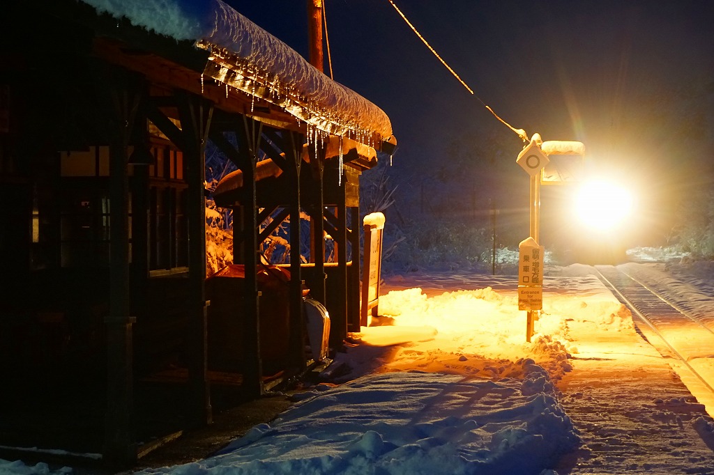 留萌本線で深川駅からも留萠駅からも約30分。かつてここは石炭や木材を積み出した駅であり、駅前に旅館や商店があり、大正時代には駅弁が売られた。1999年のNHK連続テレビ小説「すずらん」の撮影に用意した駅舎や旅館が残る。1910(明治43)年11月23日開業、北海道雨竜郡沼田町字恵比島。