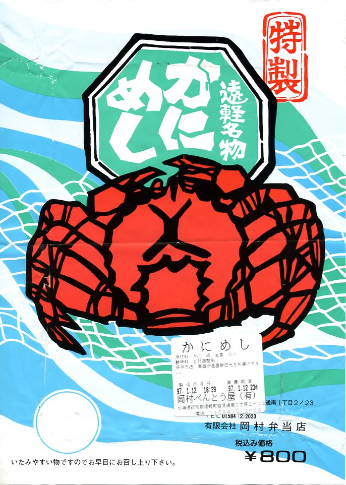 昭和50年代のものと思われる、昔の遠軽駅弁の掛紙。そのカニと網と海の絵柄は、21世紀のものとまったく変わらない。注意書きや調製元表記などの文字は、時代のルールに応じて変わってきた。当時の遠軽駅は石北本線が名寄本線を分ける駅であった。