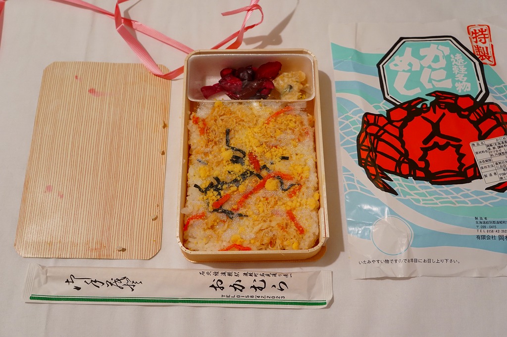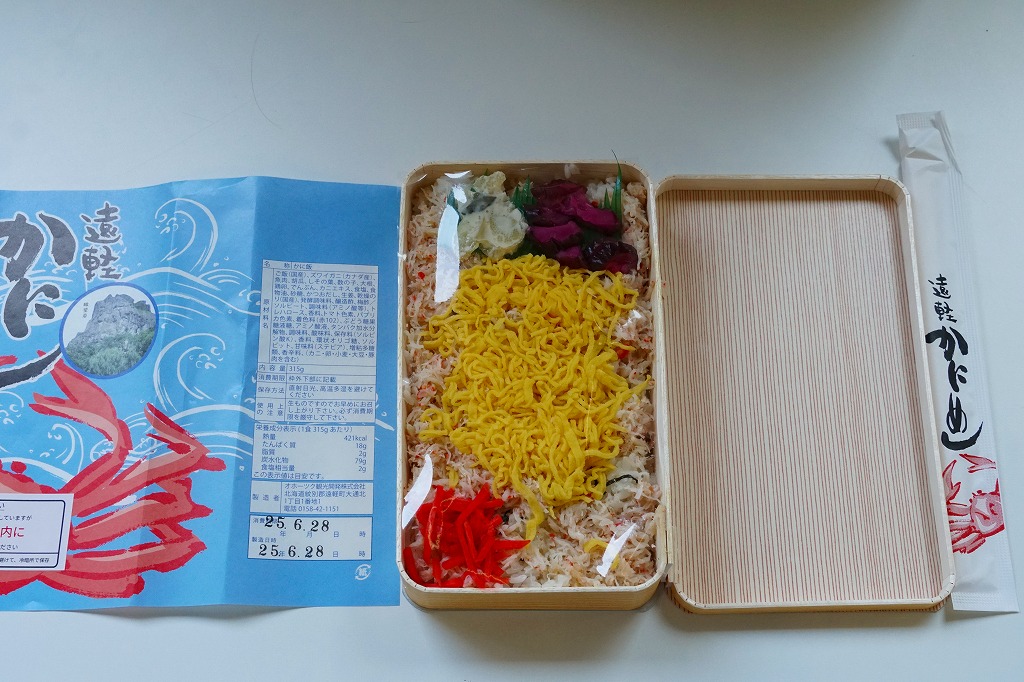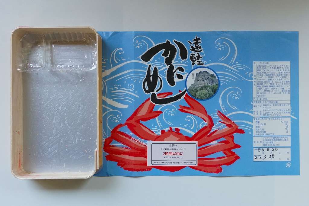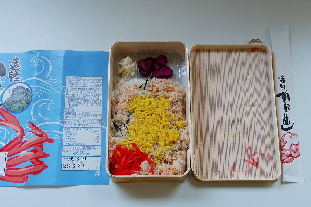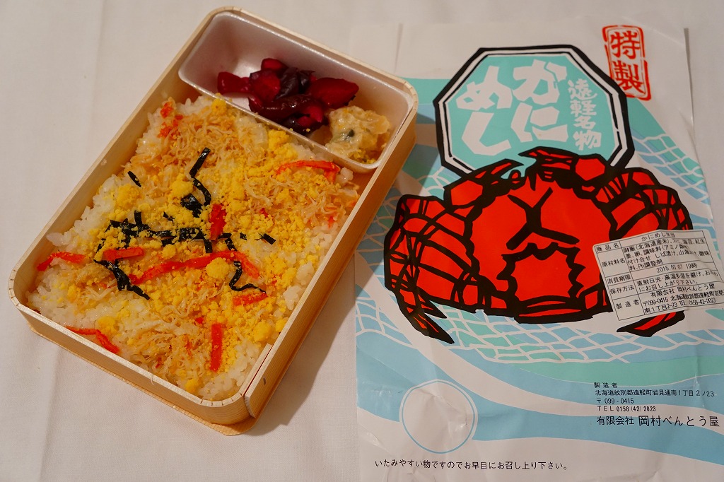 容器に白飯を詰め、カニほぐし身と錦糸卵を載せ、刻み海苔と紅生姜も載せ、カズノコのわさび漬けと柴漬けを添え、カニを描いた青い掛紙で包む姿は、かつての遠軽駅弁「かにめし」に似る。温かい品物が入手できることと、食感の柔らかさも似る。風味は過去の記憶と異なり、味付け飯をカマボコで食べているような感じを受けた。どうもズワイガニのほぐし身にカニかまぼこを混ぜた、あるいはその逆であるようで、かつての駅弁もそうだったのだろうか。