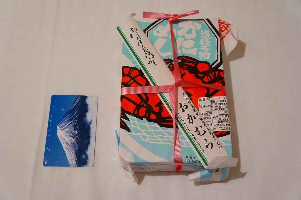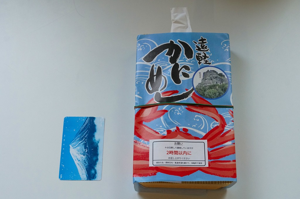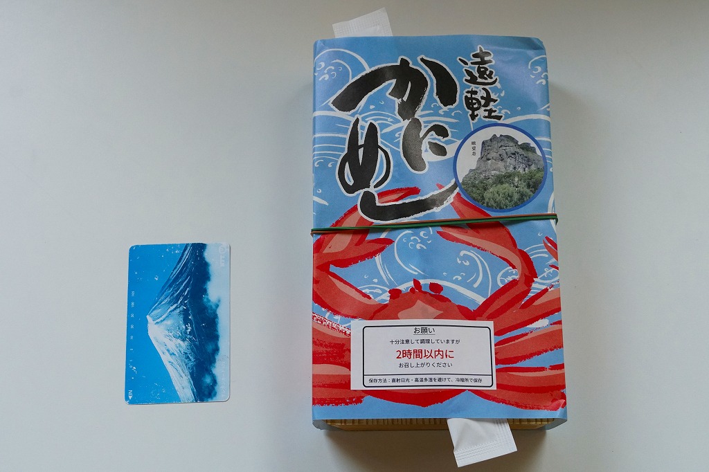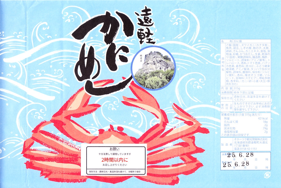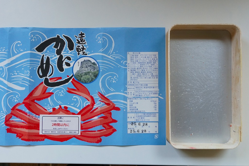 容器に白飯を詰め、カニほぐし身と錦糸卵を載せ、刻み海苔と紅生姜も載せ、カズノコのわさび漬けと柴漬けを添え、カニを描いた青い掛紙で包む姿は、かつての遠軽駅弁「かにめし」に似る。温かい品物が入手できることと、食感の柔らかさも似る。風味は過去の記憶と異なり、味付け飯をカマボコで食べているような感じを受けた。どうもズワイガニのほぐし身にカニかまぼこを混ぜた、あるいはその逆であるようで、かつての駅弁もそうだったのだろうか。