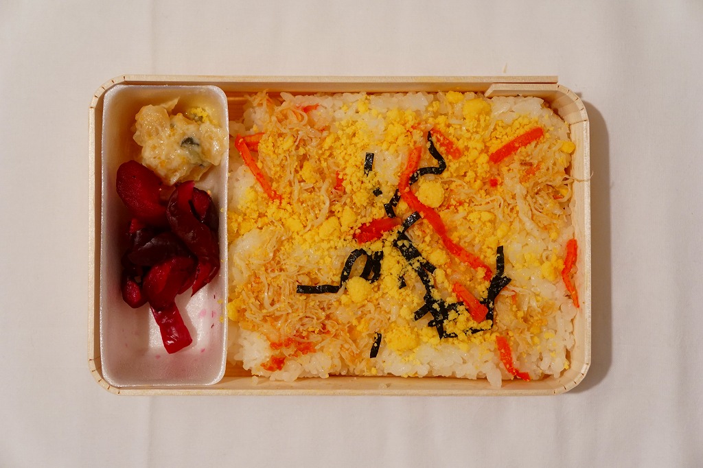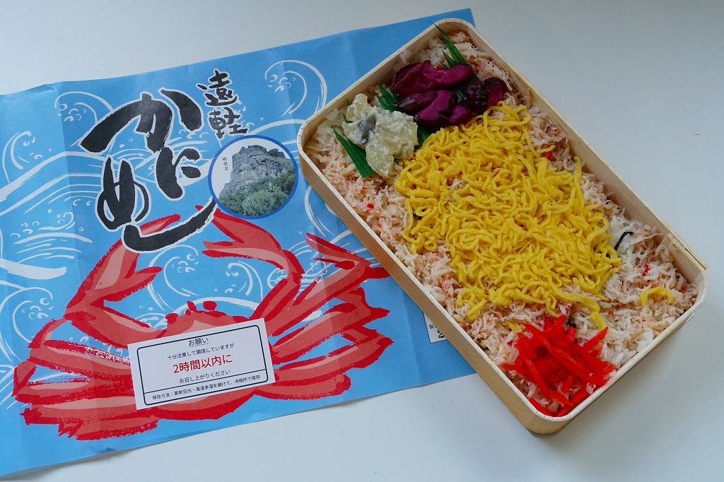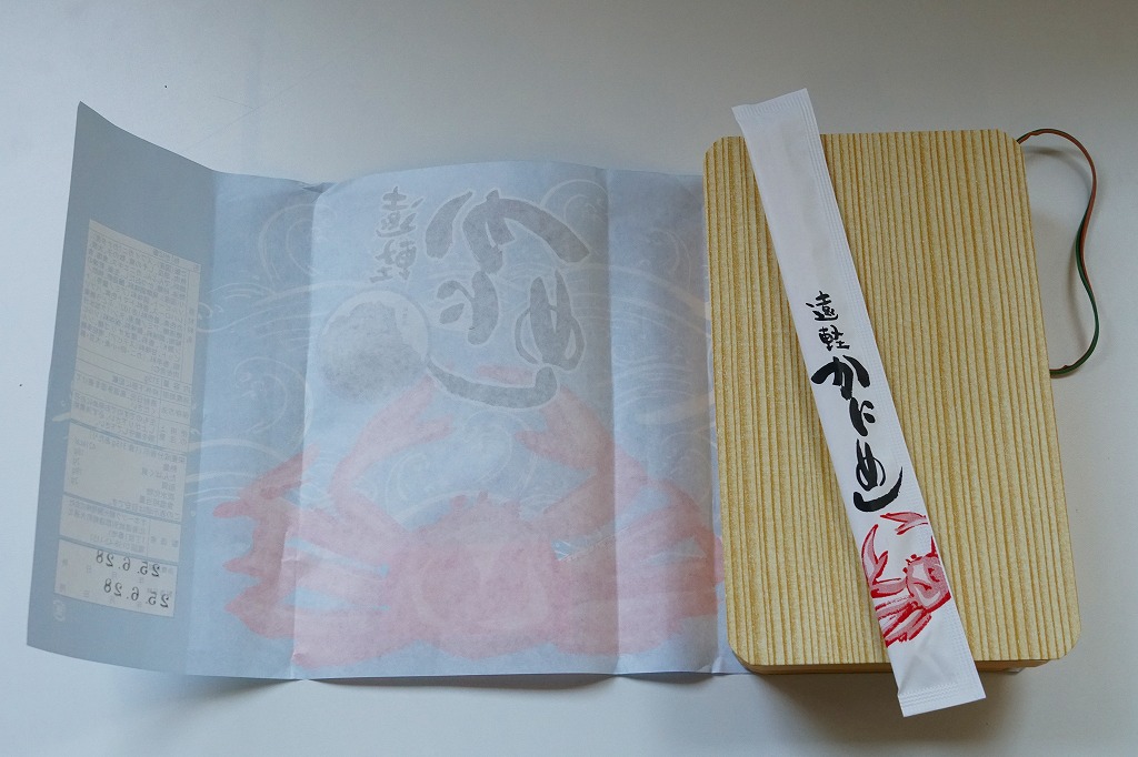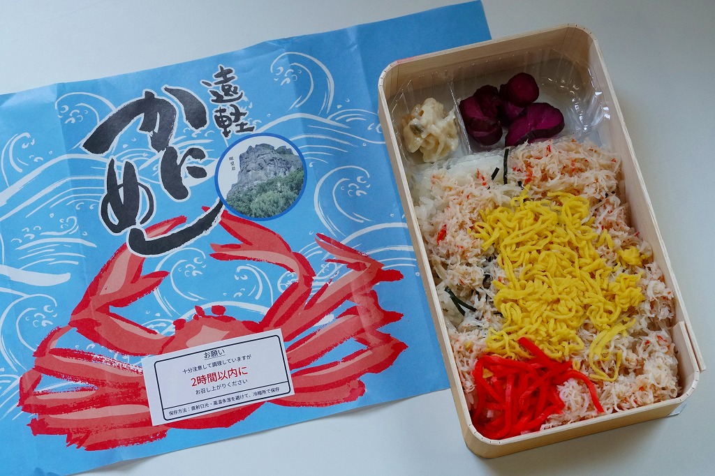 長方形の経木折を、カニを描いた掛紙で包む。中身は御飯の上に細かい炒り卵と紅生姜に刻み、海苔とカニ煮付ほぐし身を混ぜて敷くもの。ツヤのある細かなカニ身から煮汁がきゅっと出て、錦糸卵が食感で、海苔が香りで、紅生姜が刺激で、温かく柔らかい御飯とともに個性を出しながら風味を互いに補いふわりとした食感を出す、好評が納得できる素朴で奥の深いカニ飯駅弁。しば漬と数の子山海煮の添付も的を射ている。