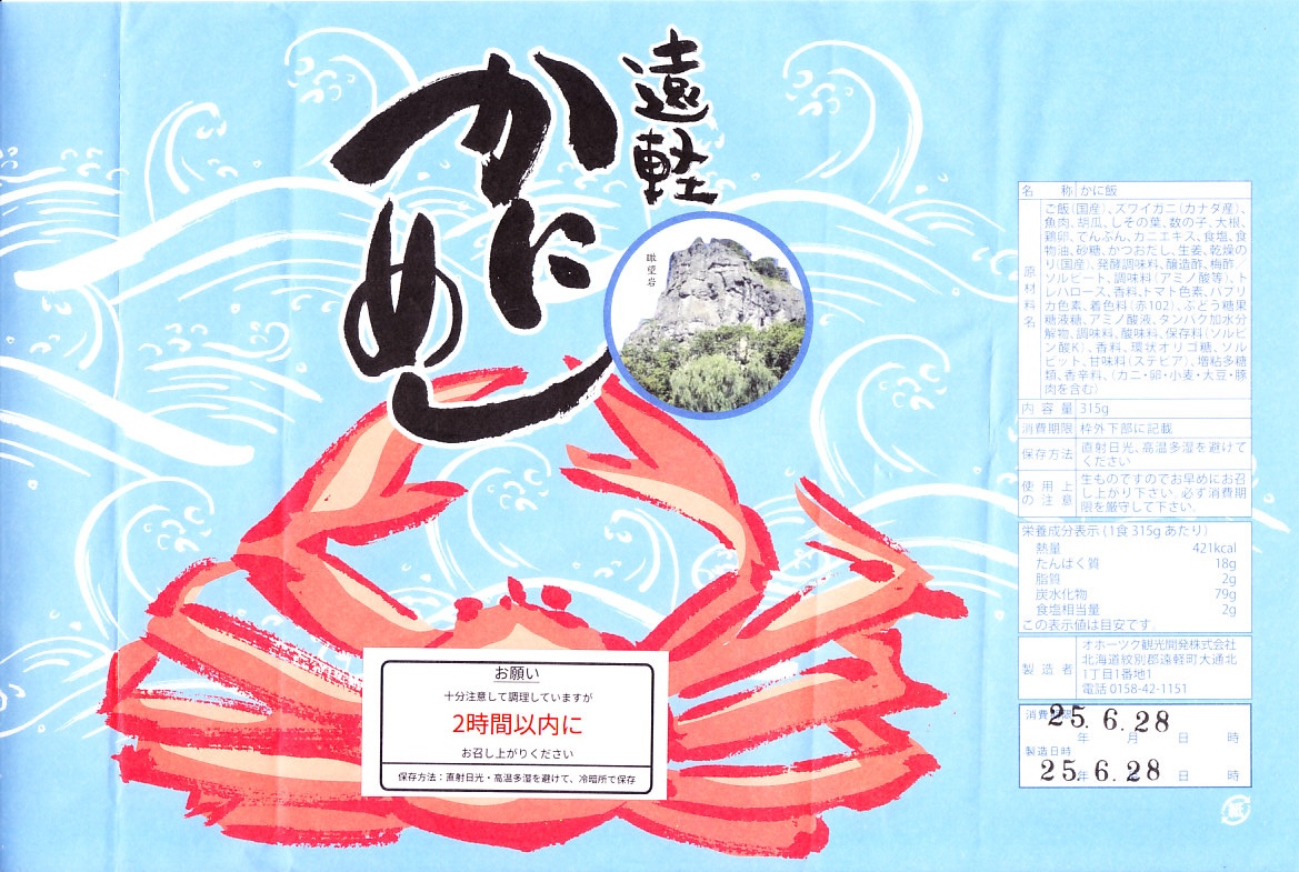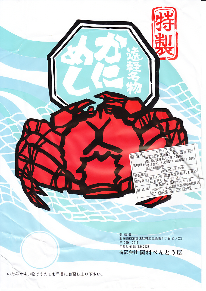 上記の弁当「遠軽かにめし」の「(大盛)」版。ご飯約1.2倍、かに約1.5番増量とする。容器と掛紙は通常版と同じで、内容もまったく同じで、たしかにカニと飯が増量されている。価格は6分の7倍。外観で区別できないので、受け取り時に「大」と手書きした付箋が付いていた。