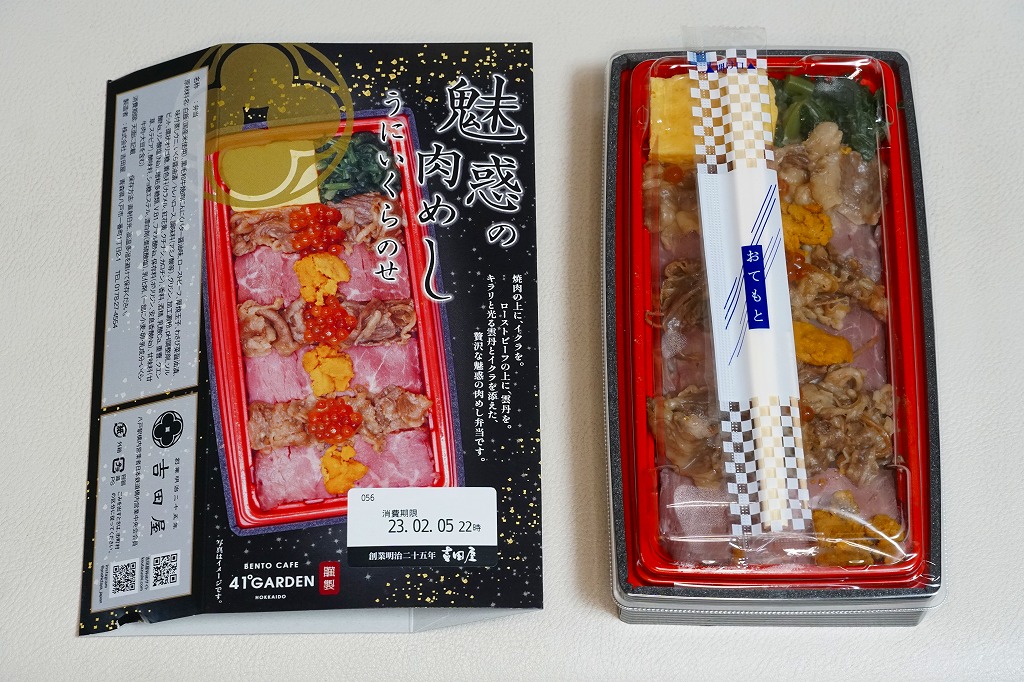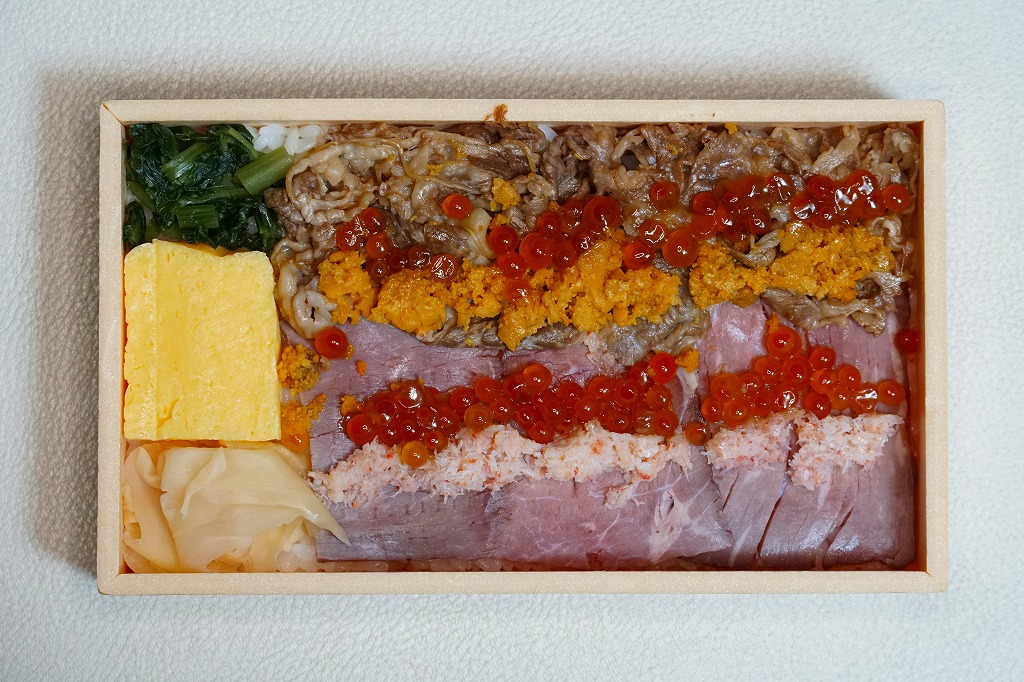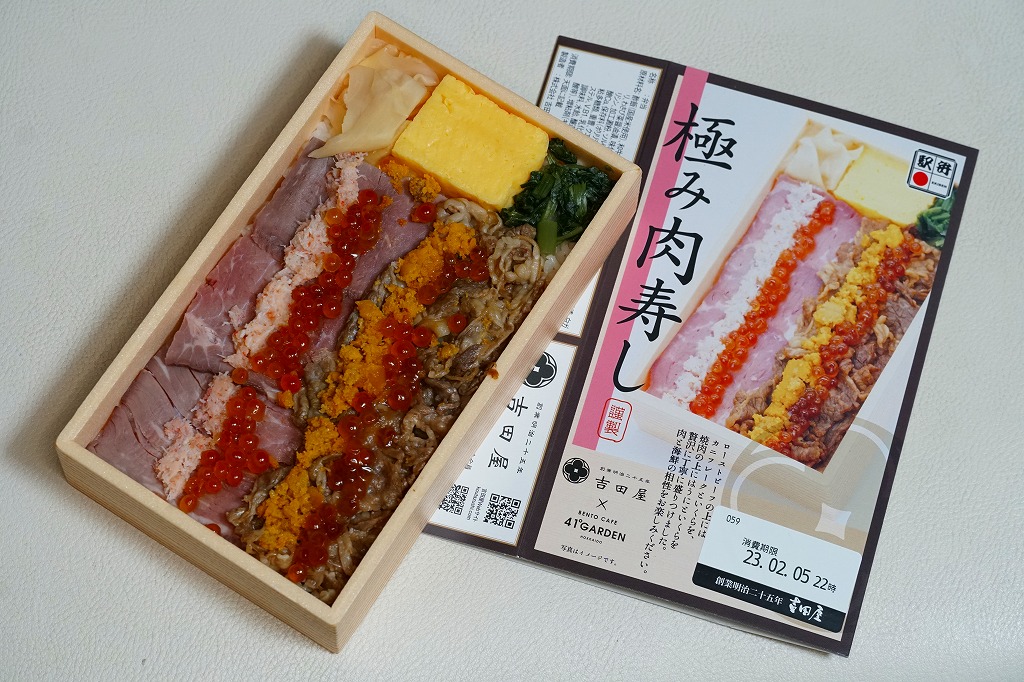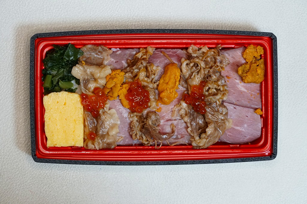 2023(令和5)年の1月までに、催事での輸送販売で発売か。長方形の容器に酢飯を敷き詰め、和牛焼肉にんにくバター醤油味とローストビーフで半分ずつ覆い、いくら醤油漬2列と味付蒸しウニ1列で彩り、玉子焼、わさび菜、ガリを添える。お肉たっぷり、ウニとイクラとタレで味と風味もたっぷり。御飯の酸味がマイナスにならない、見た目も味も肉寿司の創作。値が張るだけ、お肉そのものもおいしかった。秋冬の駅弁大会シーズンが終わる3月までに終売か。