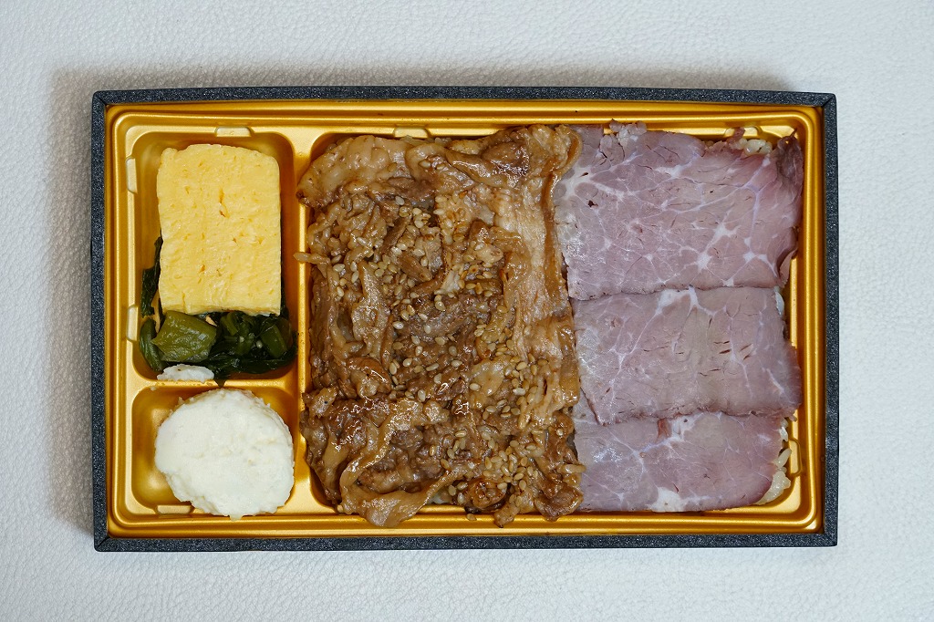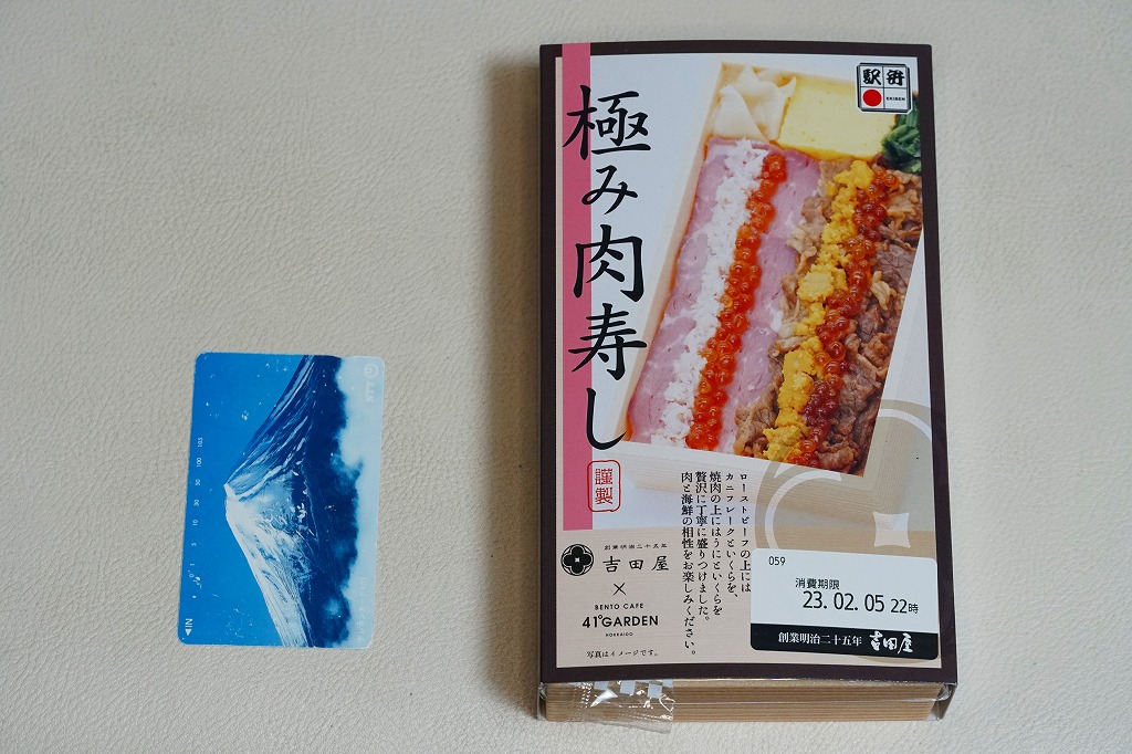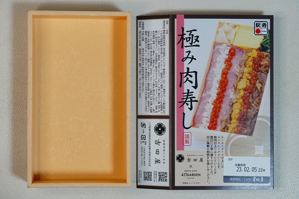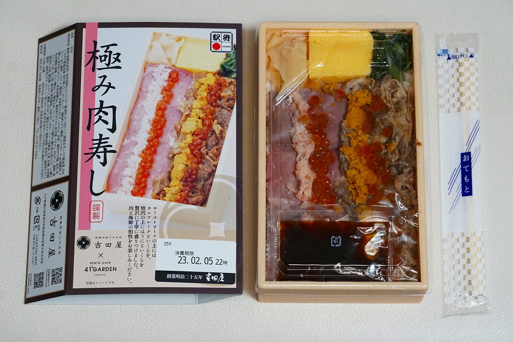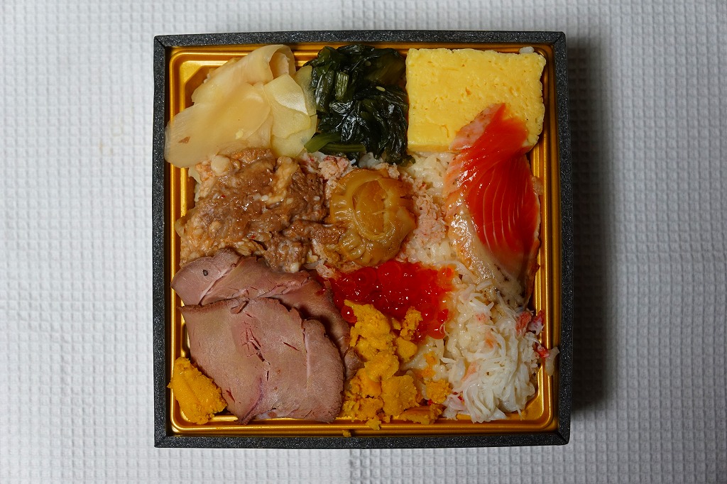 2023(令和5)年の1月までに、催事での輸送販売で発売か。長方形の容器に酢飯を敷き詰め、和牛焼肉にんにくバター醤油味とローストビーフで半分ずつ覆い、いくら醤油漬2列と味付蒸しウニ1列で彩り、玉子焼、わさび菜、ガリを添える。お肉たっぷり、ウニとイクラとタレで味と風味もたっぷり。御飯の酸味がマイナスにならない、見た目も味も肉寿司の創作。値が張るだけ、お肉そのものもおいしかった。秋冬の駅弁大会シーズンが終わる3月までに終売か。