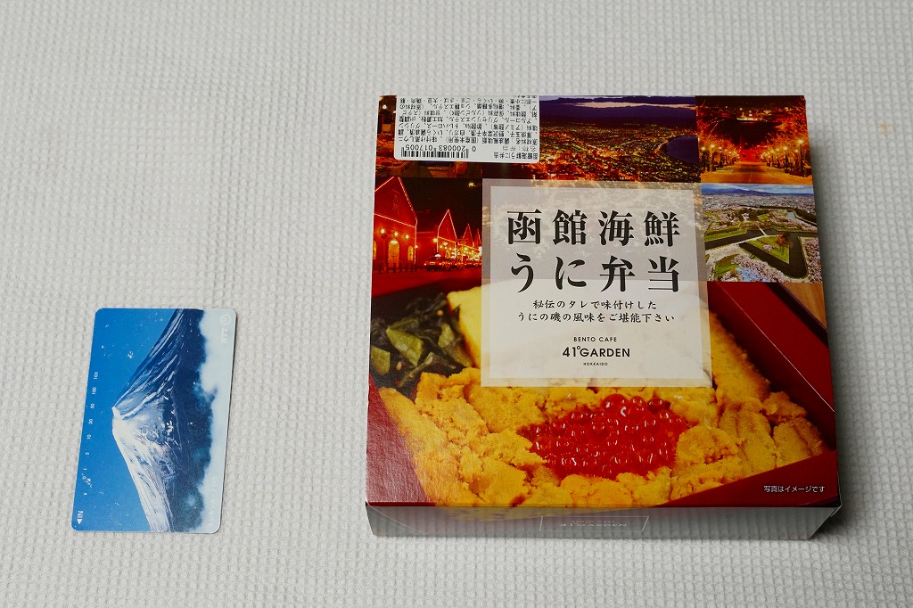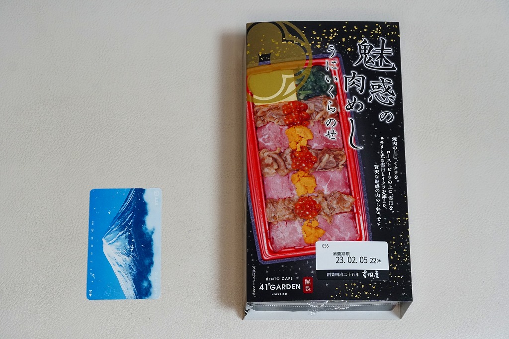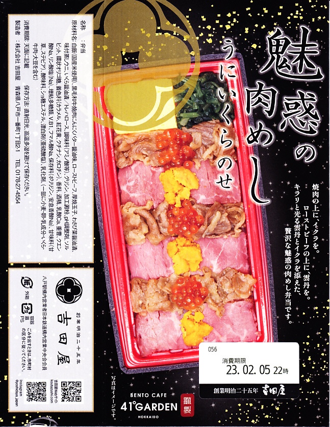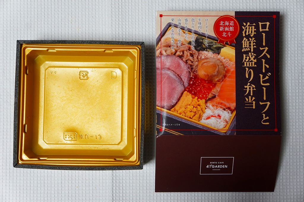 秋冬の駅弁大会シーズンに向けた、2022(令和4)年秋の新商品。長方形の容器に白飯を詰め、黒毛和牛焼肉にんにくバター醤油味とローストビーフを交互に敷き詰め、いくら醤油漬と味付け蒸しウニも交互に置いて、玉子焼とわさび菜を添える。函館とも八戸とも関係がなくても、これはうまそうな魅惑の肉めし。もし駅で買えれば、値は張るけれど、東北・北海道新幹線での移動が豪華になる。調製元は青森県の八戸駅の駅弁屋であり、スリーブにもそう書いてあるものの、同社が新函館北斗駅に出した店「BENTO CAFE 41°GARDEN」表記があるため、新函館北斗駅弁とみなして、ここに収蔵。このシーズンの半年間で終売か。