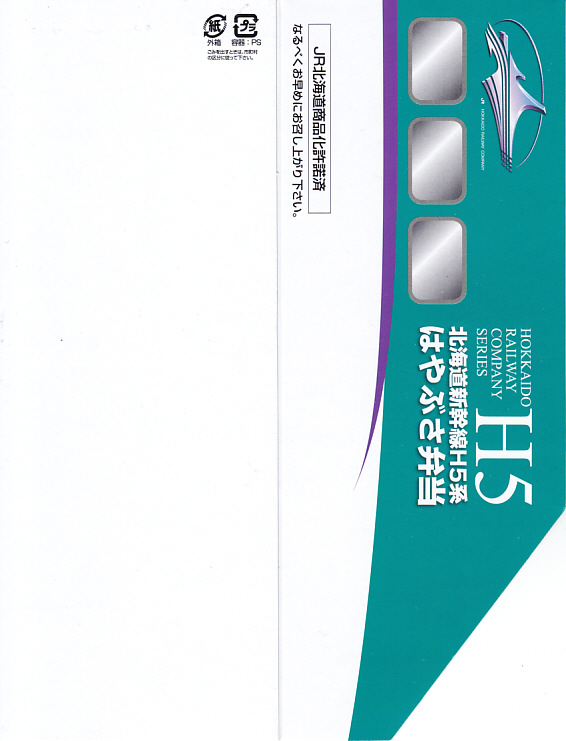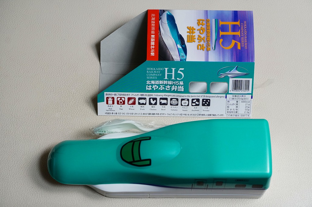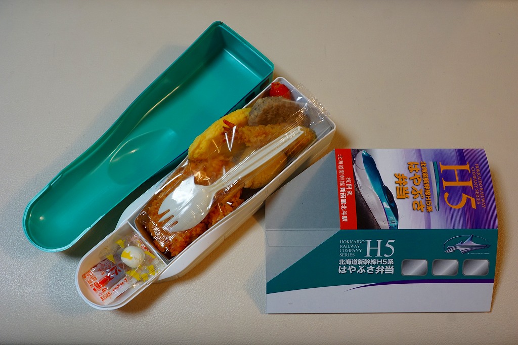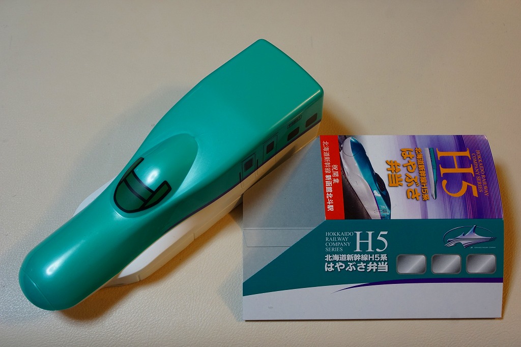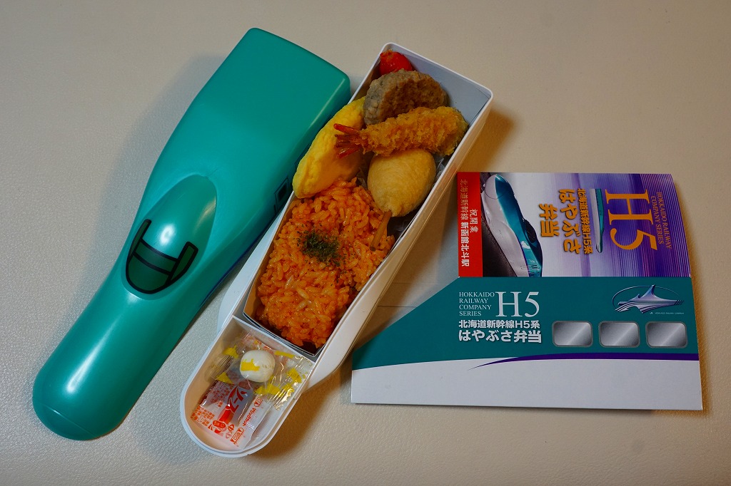 2016(平成28)年1月の京王百貨店の駅弁大会でデビュー、同年3月の北海道新幹線と新函館北斗駅開業に合わせて現地で発売。その名のとおり、北海道新幹線のH5系電車の駅弁。中身は同じ調製元の八戸駅弁「E5系はやぶさ弁当」とほぼ同じで、チキンライスとハンバーグ、オムレツ、からあげ、しゅうまい、ポークソーセージを詰め、バター飴を添えるもの。冷凍食品で中身を固めたなという印象も同じ。元ネタのH5系新幹線電車そのものも、E5系の色違いのようなものなので、これでよい。同じコンセプトの他社製品とは、見た目で同じでも、中身に加えて容器もそれぞれ独自である。価格は2016年の発売時や購入時で1,250円、2020年時点で1,300円、2023年時点で1,380円、2025年時点で1,580円。