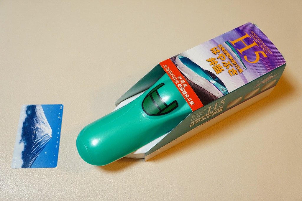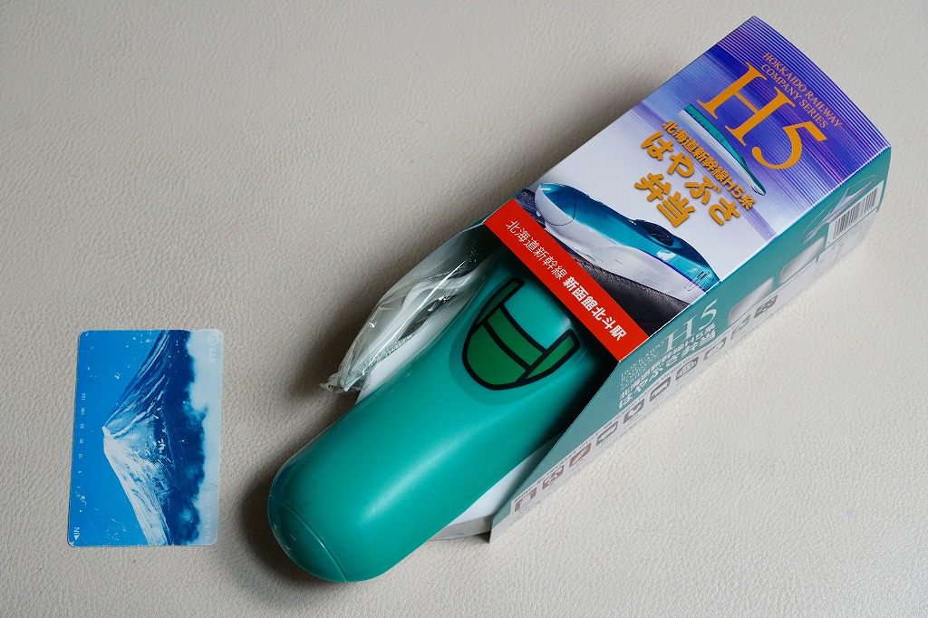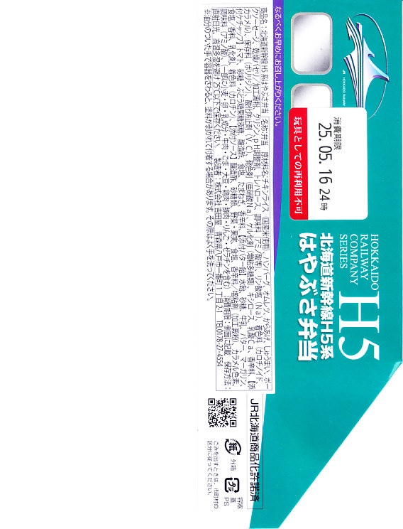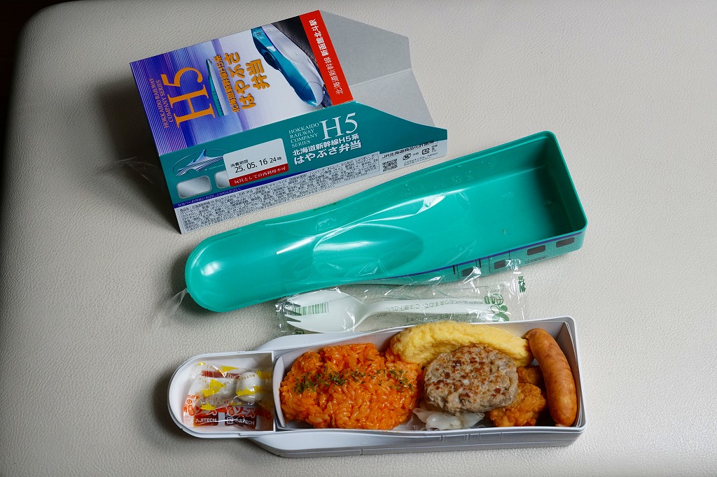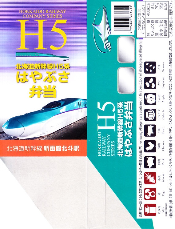 2016(平成28)年1月の京王百貨店の駅弁大会でデビュー、同年3月の北海道新幹線と新函館北斗駅開業に合わせて現地で発売。その名のとおり、北海道新幹線のH5系電車の駅弁。中身は同じ調製元の八戸駅弁「E5系はやぶさ弁当」とほぼ同じで、チキンライスとハンバーグ、オムレツ、からあげ、しゅうまい、ポークソーセージを詰め、バター飴を添えるもの。冷凍食品で中身を固めたなという印象も同じ。元ネタのH5系新幹線電車そのものも、E5系の色違いのようなものなので、これでよい。同じコンセプトの他社製品とは、見た目で同じでも、中身に加えて容器もそれぞれ独自である。価格は2016年の発売時や購入時で1,250円、2020年時点で1,300円、2023年時点で1,380円、2025年時点で1,580円。