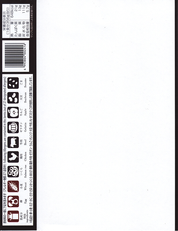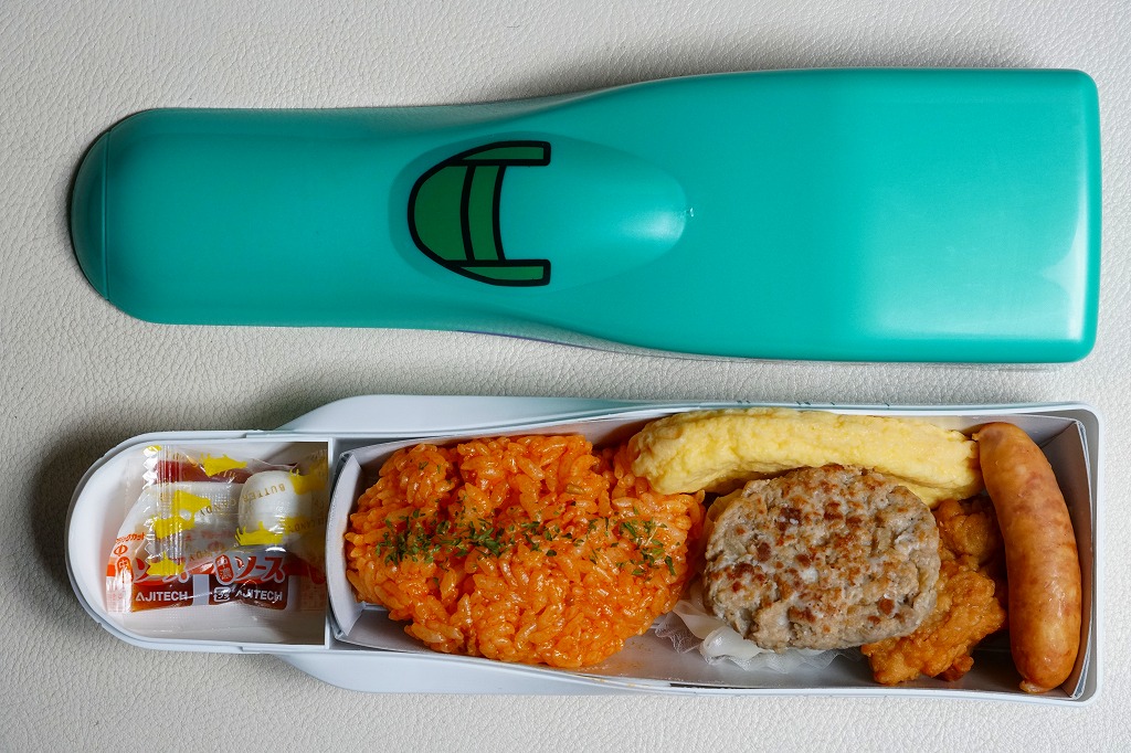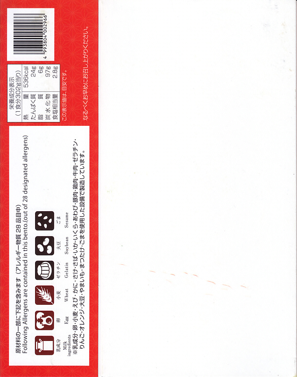 上記の駅弁「北海道新幹線H5系はやぶさ弁当」の、2016(平成28)年の発売時の姿。上記の2025年のものと、おおむね変わらない。当時はスリーブに食品表示やアレルギー表示がなく、「祝開業」の文字があり、中身はケチャップライスとアメリカンドック、ミニオムレツ、ハンバーグ、エビフライ、フライドポテト、ウインナーを詰め、ミルク飴を添えるものであり、弁当の現物では調製元が分からなかった。