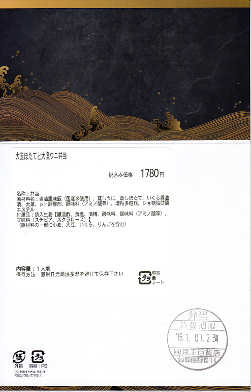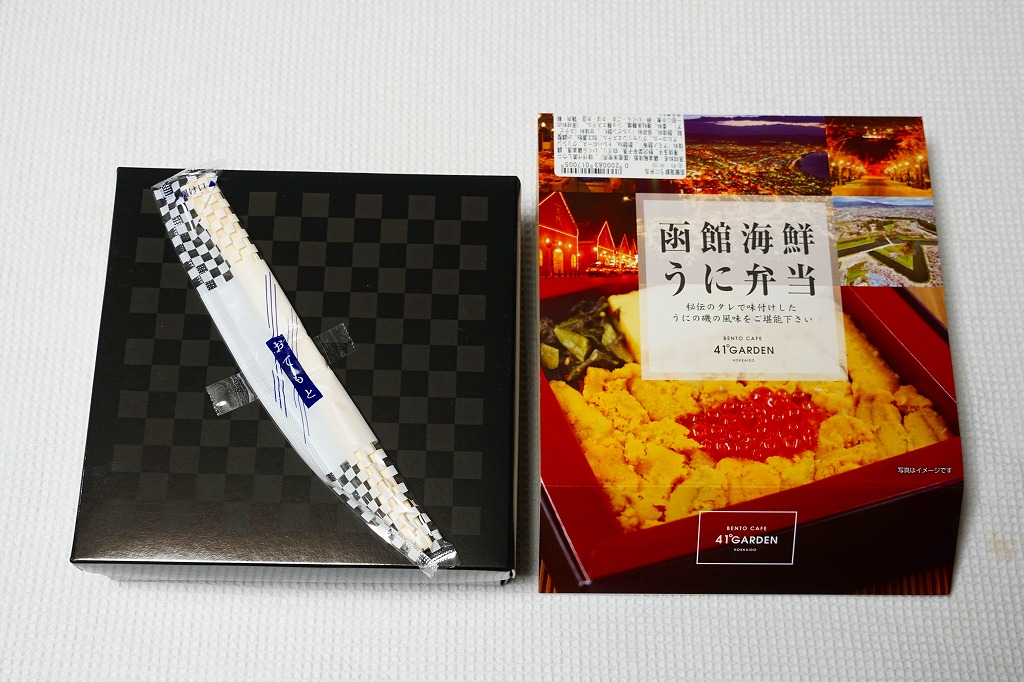 四角い容器に茶飯を敷き、パッケージの見本写真のとおり、蒸しウニとイクラ醤油漬けと、大きな蒸しホタテ1個で覆い、大葉で彩る。今回はその駅弁大会で購入。今までの函館の駅弁にない高価で、特大サイズで肉厚のホタテと、あふれんばかりのウニの使用が特徴だというが、イクラはともかくホタテ、ウニ、大葉は乾燥してボロボロになっており、催事場での大量製造品でない現地のものを味わう必要があると思った。この現物では分からないが、調製元と上記の駅弁売店の運営者は、八戸駅弁の吉田屋。2018年までの販売か。